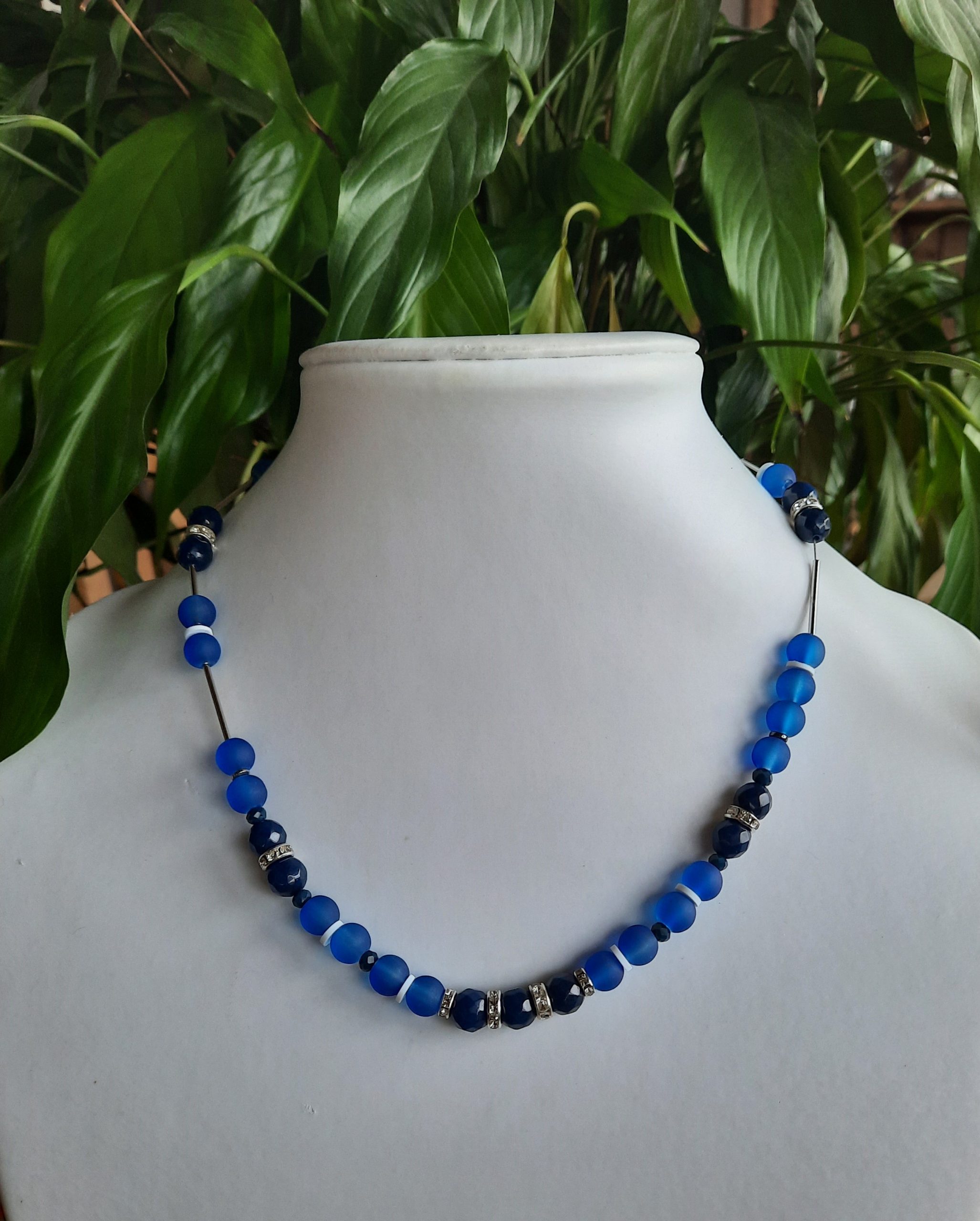 Diese Kette besteht aus dunklen Achatperlen, blauen Glasperlen und als Highlights mehrere silberne Strasssteine.