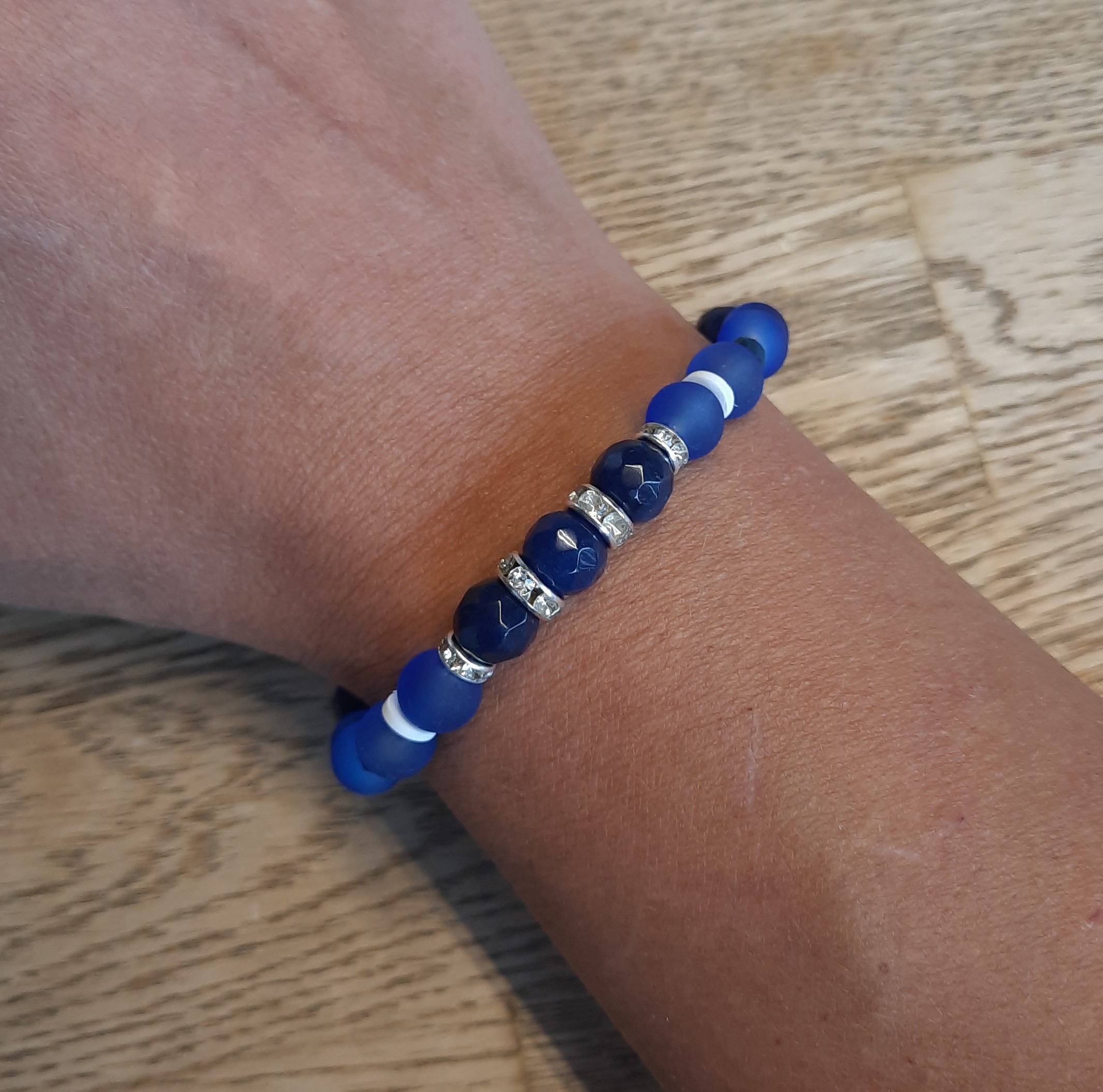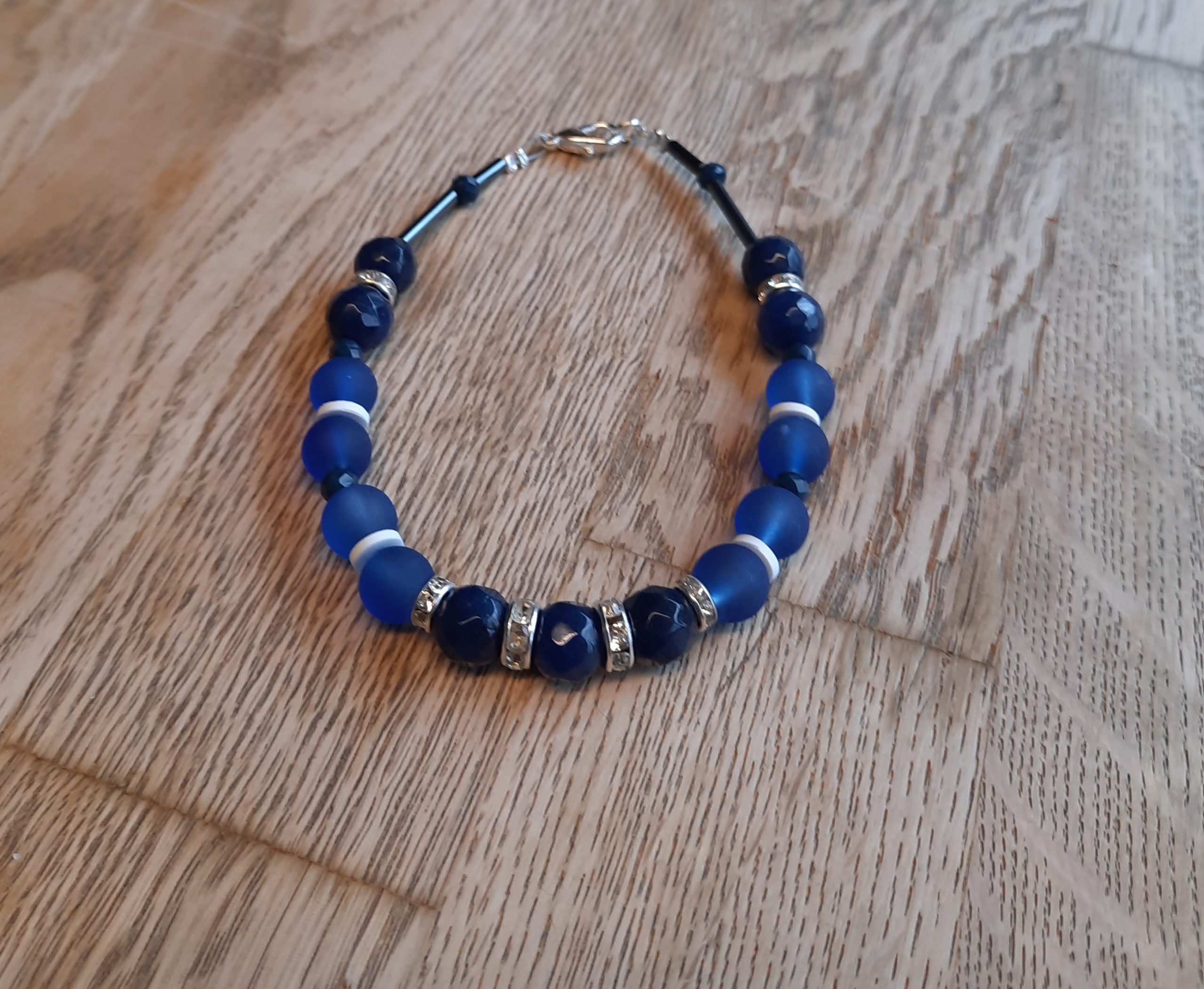 Diese Kette besteht aus dunklen Achatperlen, blauen Glasperlen und als Highlights mehrere silberne Strasssteine.