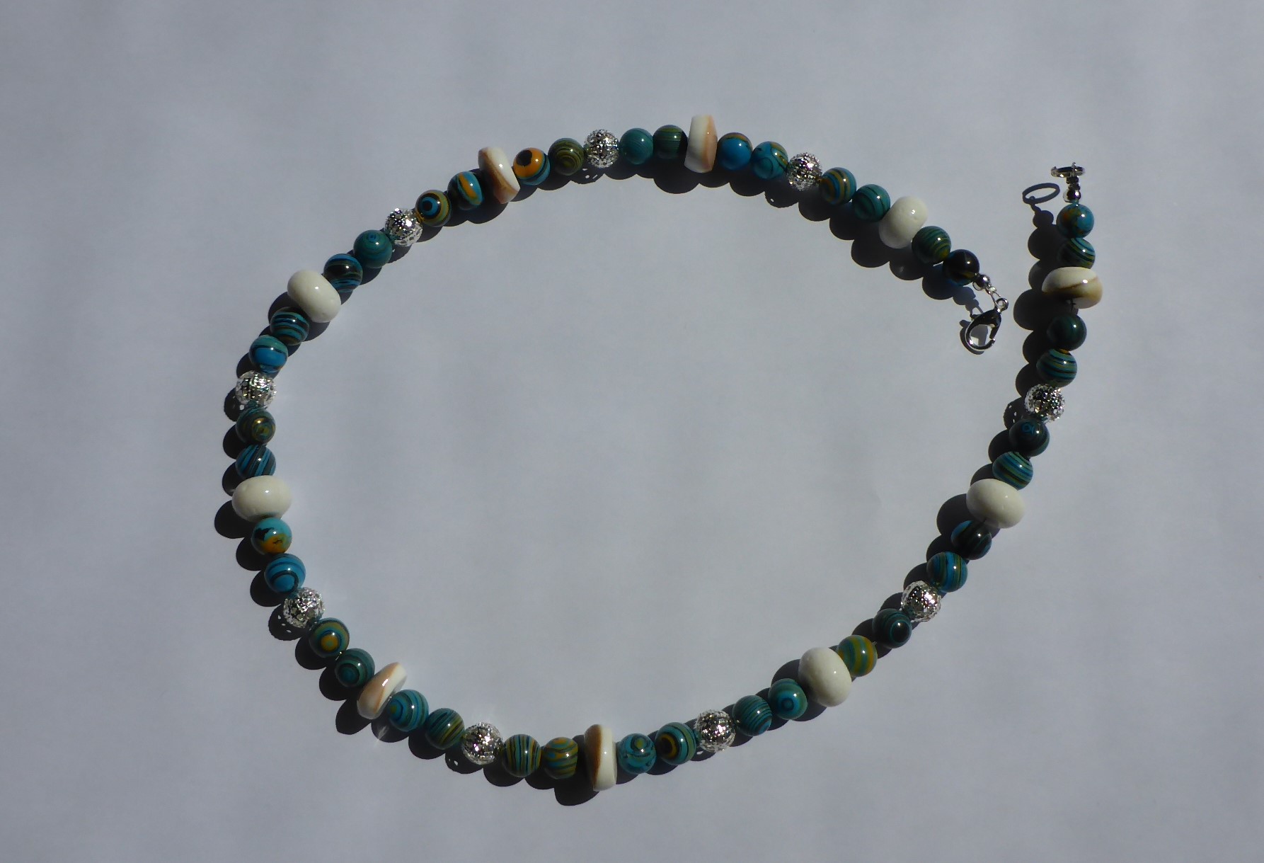 Schöne Halskette aus blauen Malachitperlen, dazwischen Muschelperlen und silberne Highlights.
