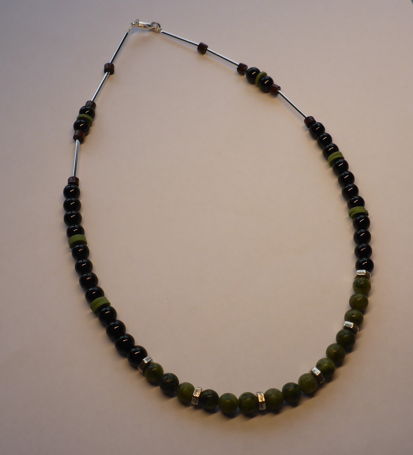 Diese besondere Halskette ist aus 6mm großen, grünen Jadeperlen, dunklen Glasperlen und Holzelementen und grünen, sowie silbernen Zwischenteile.