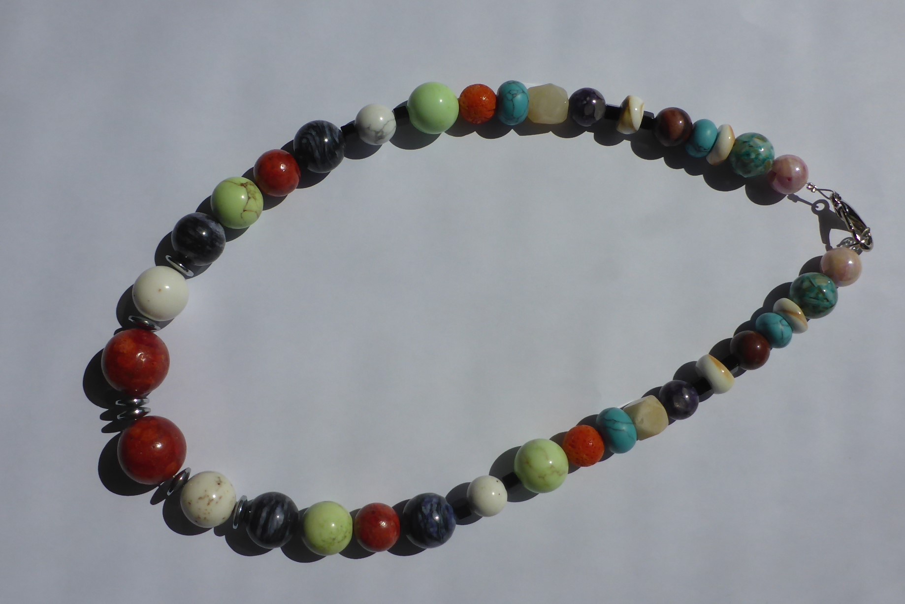 Schöne Halskette aus ganz vielen verschiedenen Perlen, darunter Jadeperlen, Achat, Glasperlen, Koralle und Muschelperlen.