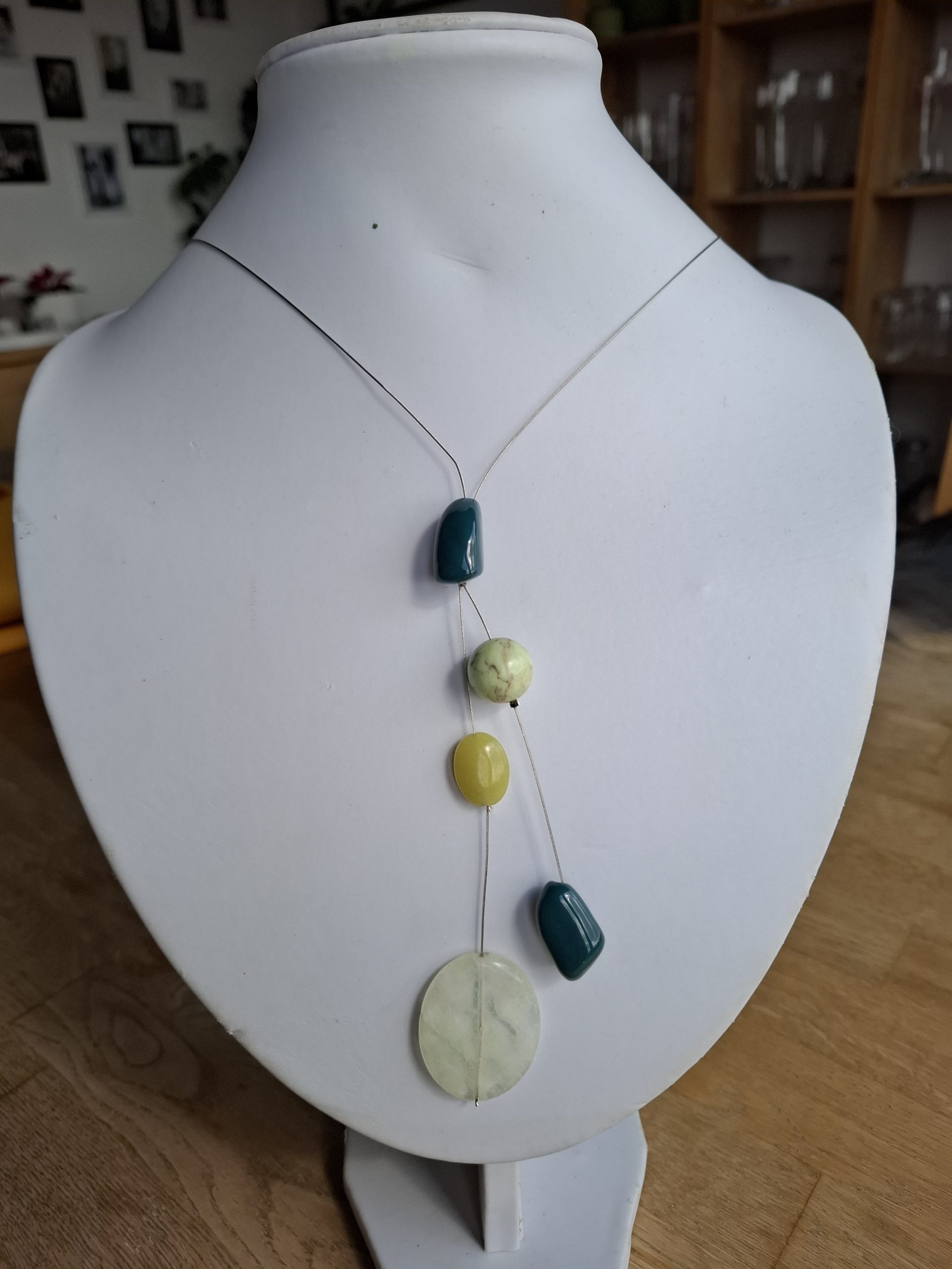 Diese lange Halskette ist aus Draht gemacht und als Highlight sind 5 verschiedene Perlen in unterschiedlichen Formen angehängt.
