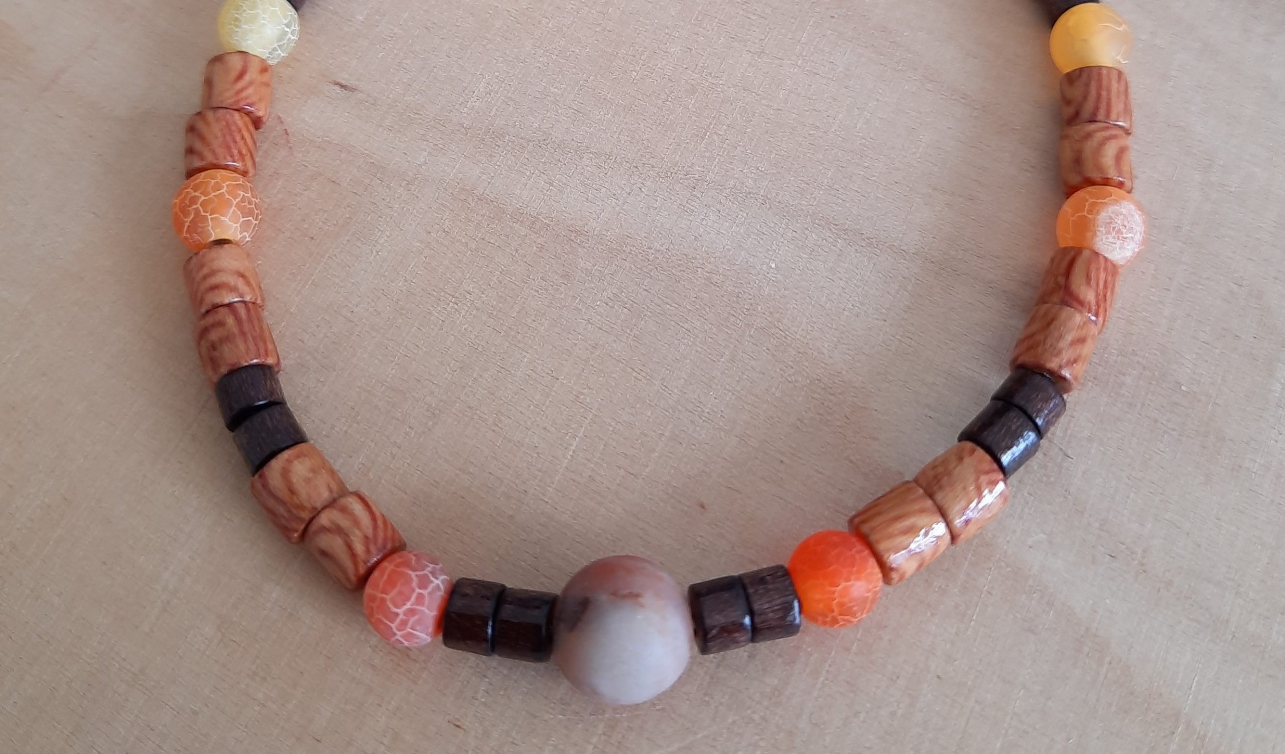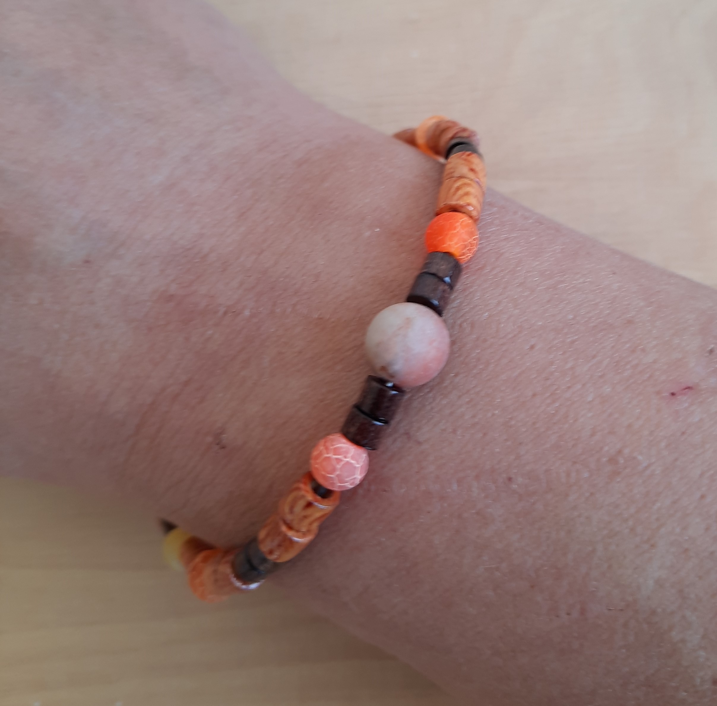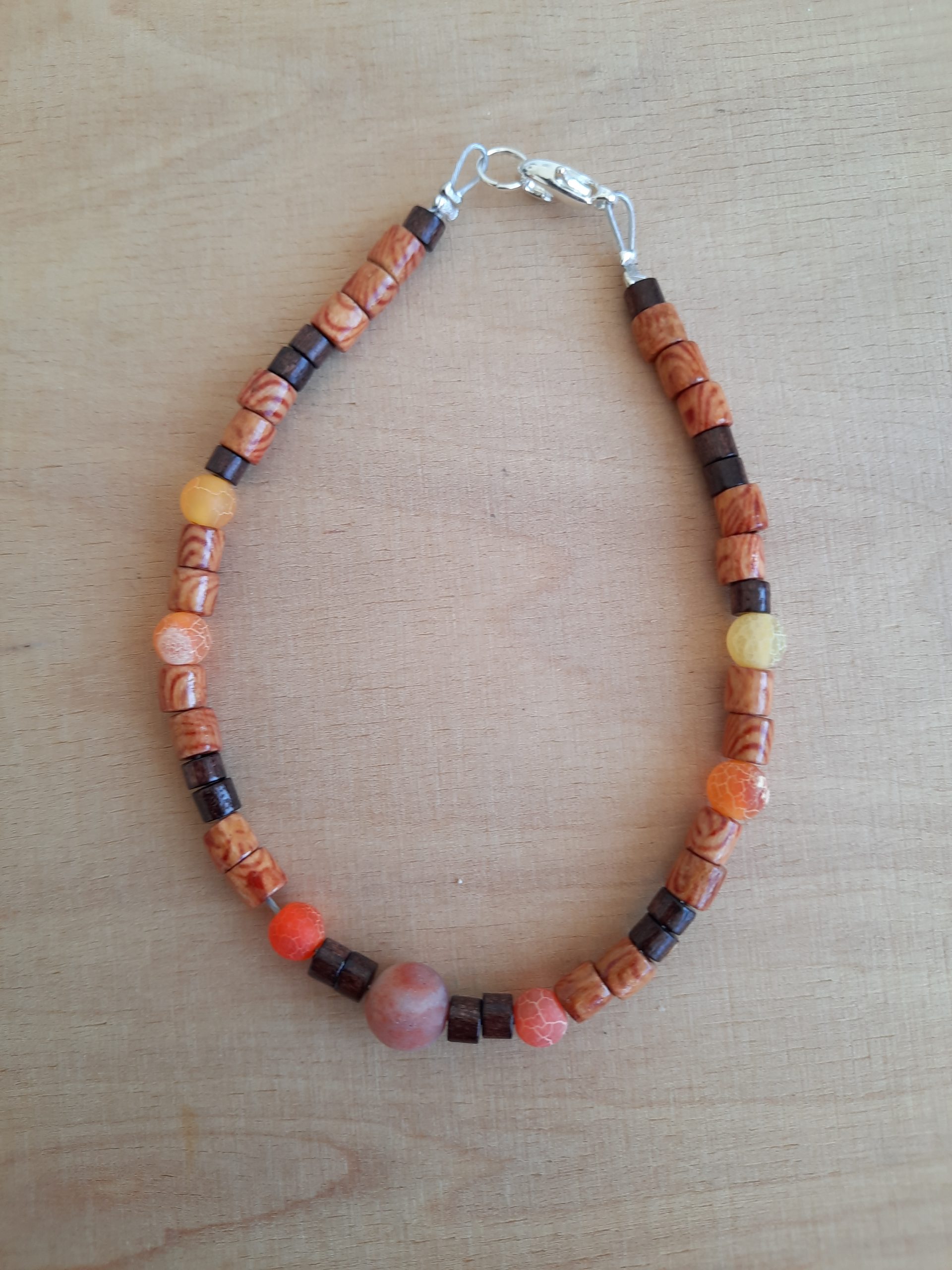 Dieses Armband ist aus orange-gelben Achatperlen, mini Holzperlen in verschiedenen Farben.