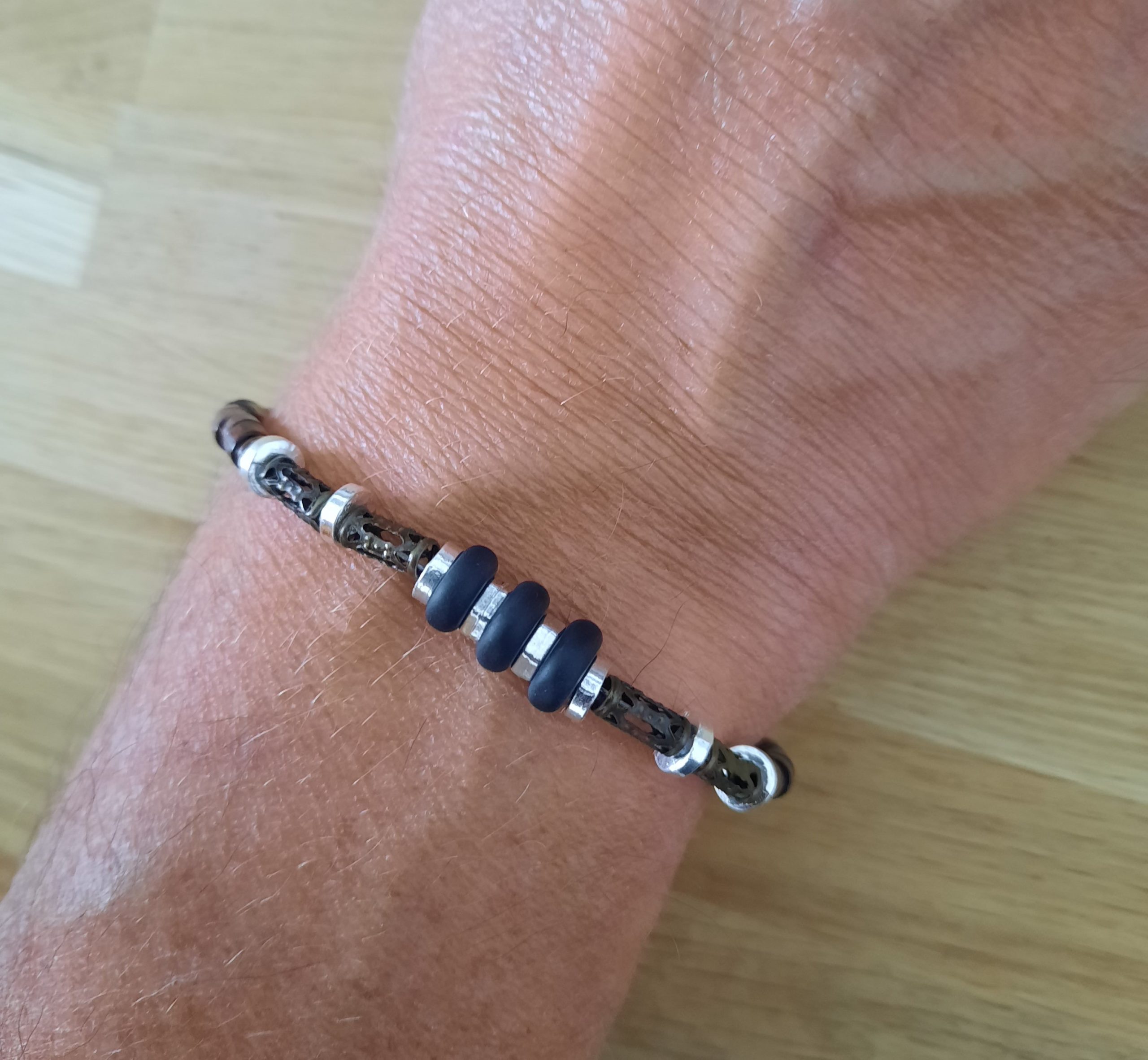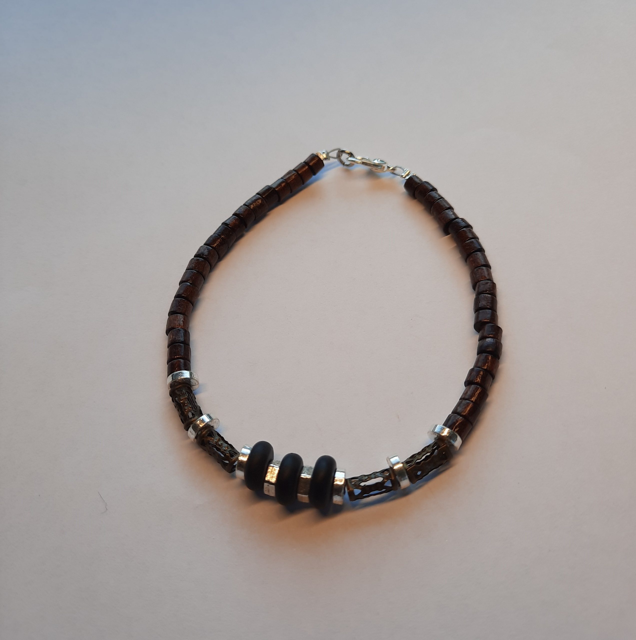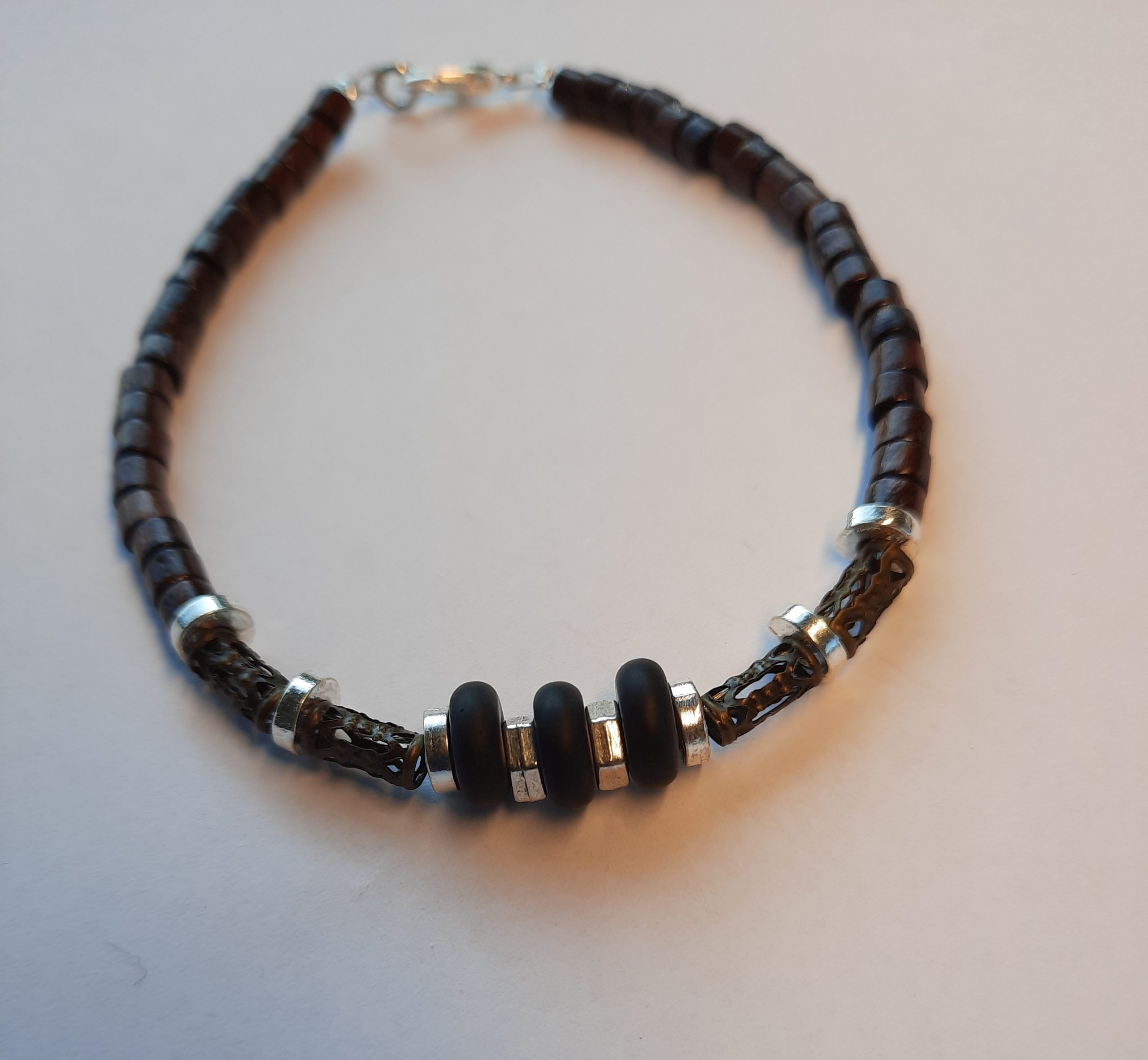 Dieses Armband ist aus schwarzen Obsidian Scheiben, mini Holzperlen, Metall-Röhrchen und silbernen Rondellen.