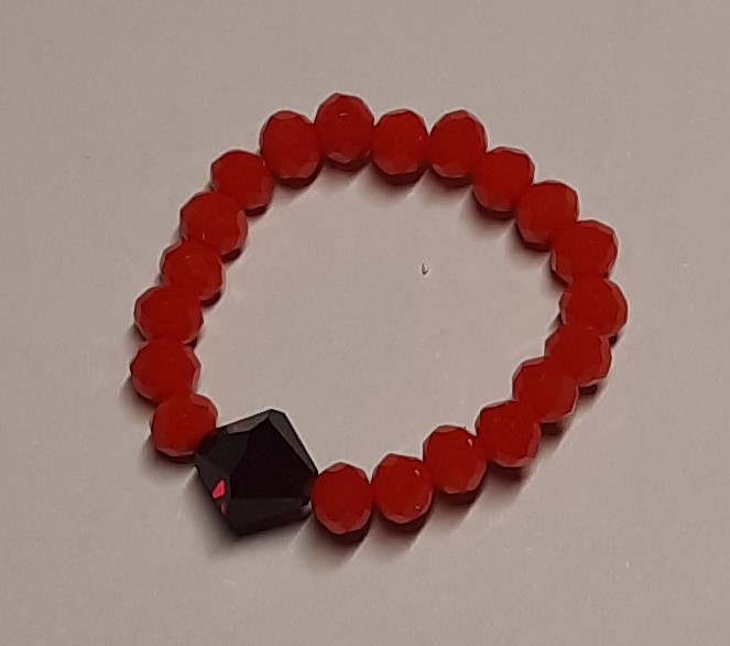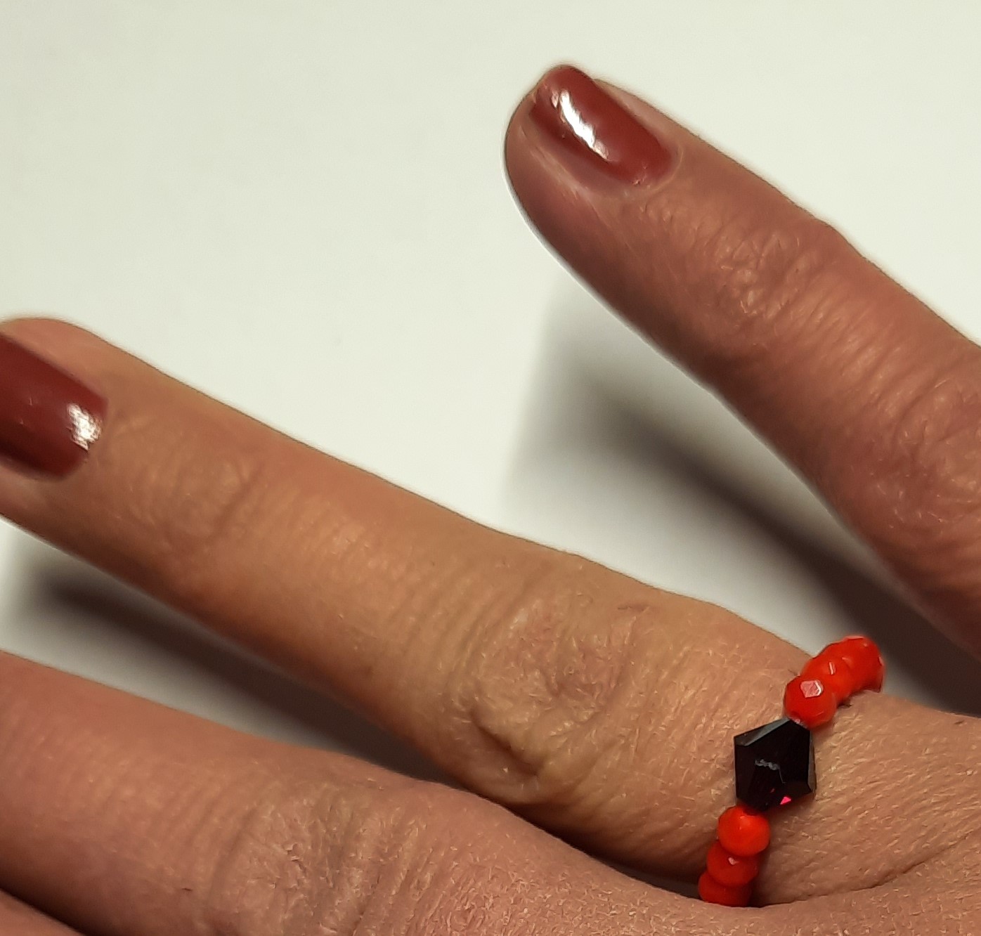 Schöner Ring aus roten Kristallperlen und einem dunklen Swarovski-Edelstein.