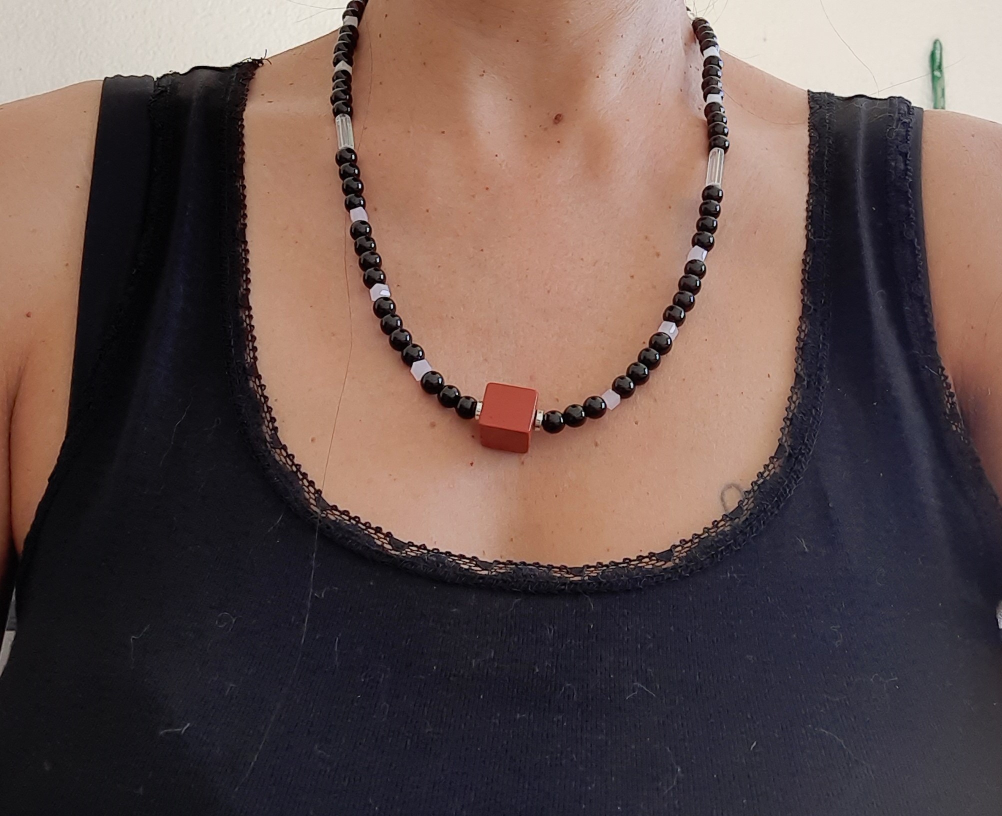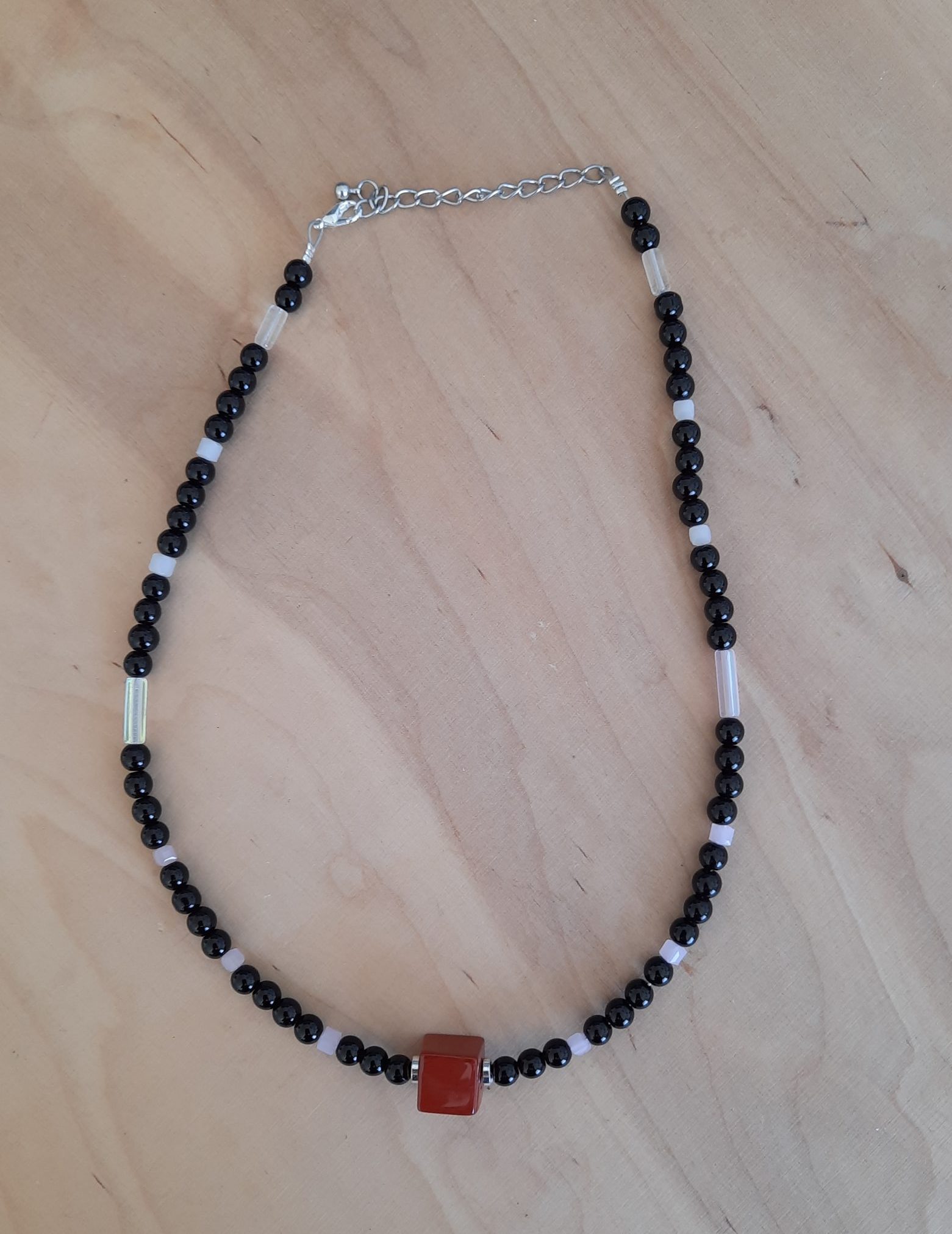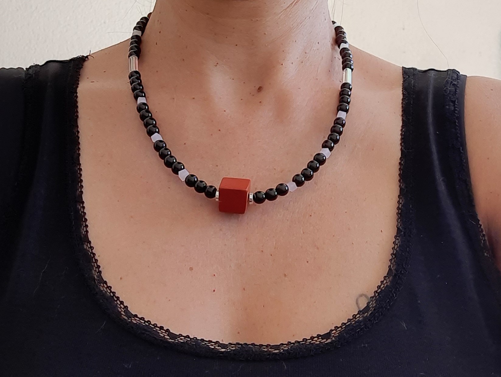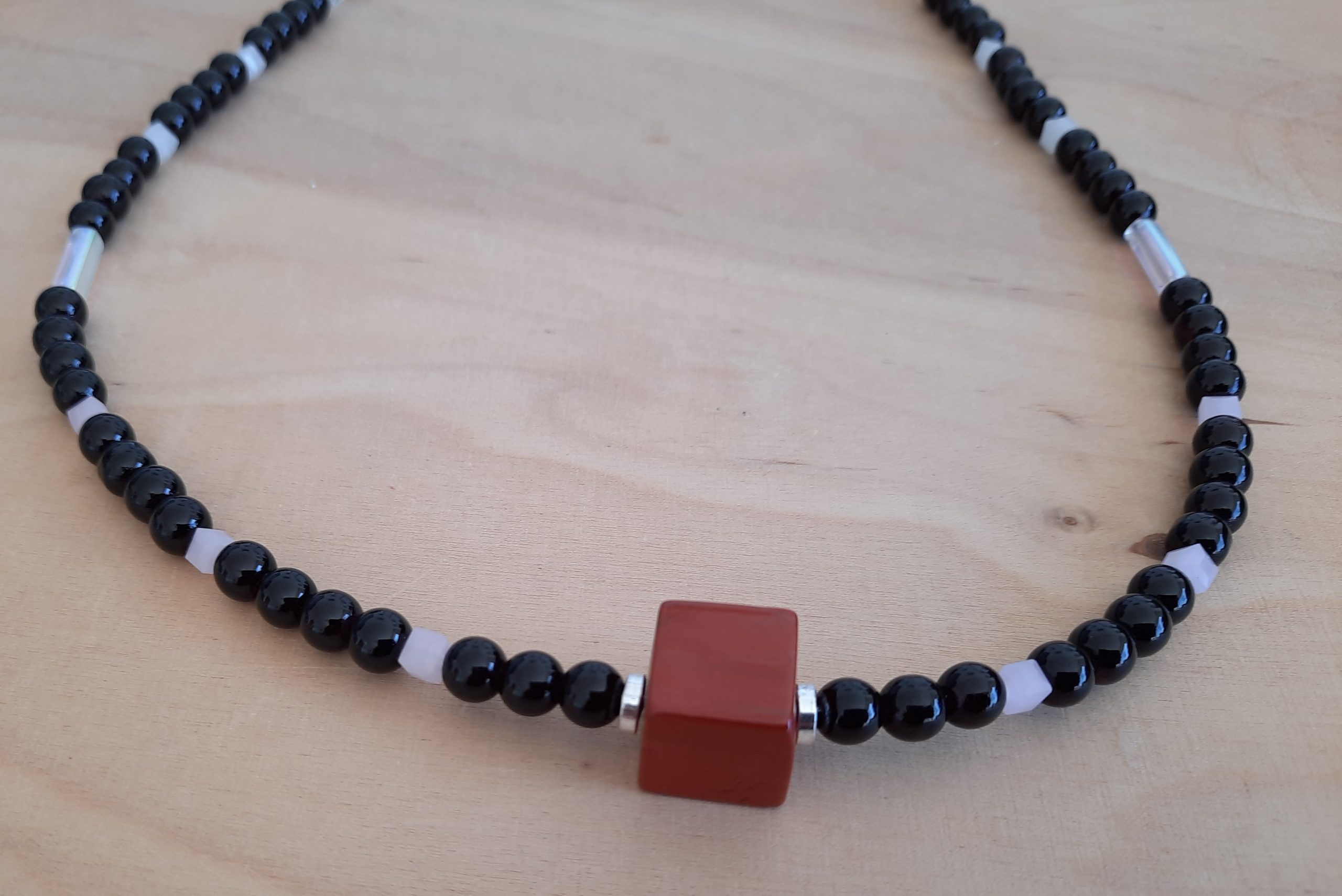 Schöne Halskette aus dunklen Glasperlen, rosa und weißen Jadeperlenwürfel, sowie sonstigen Zwischenteilen. Der rote Würfel macht die Kette zum Hingucker.