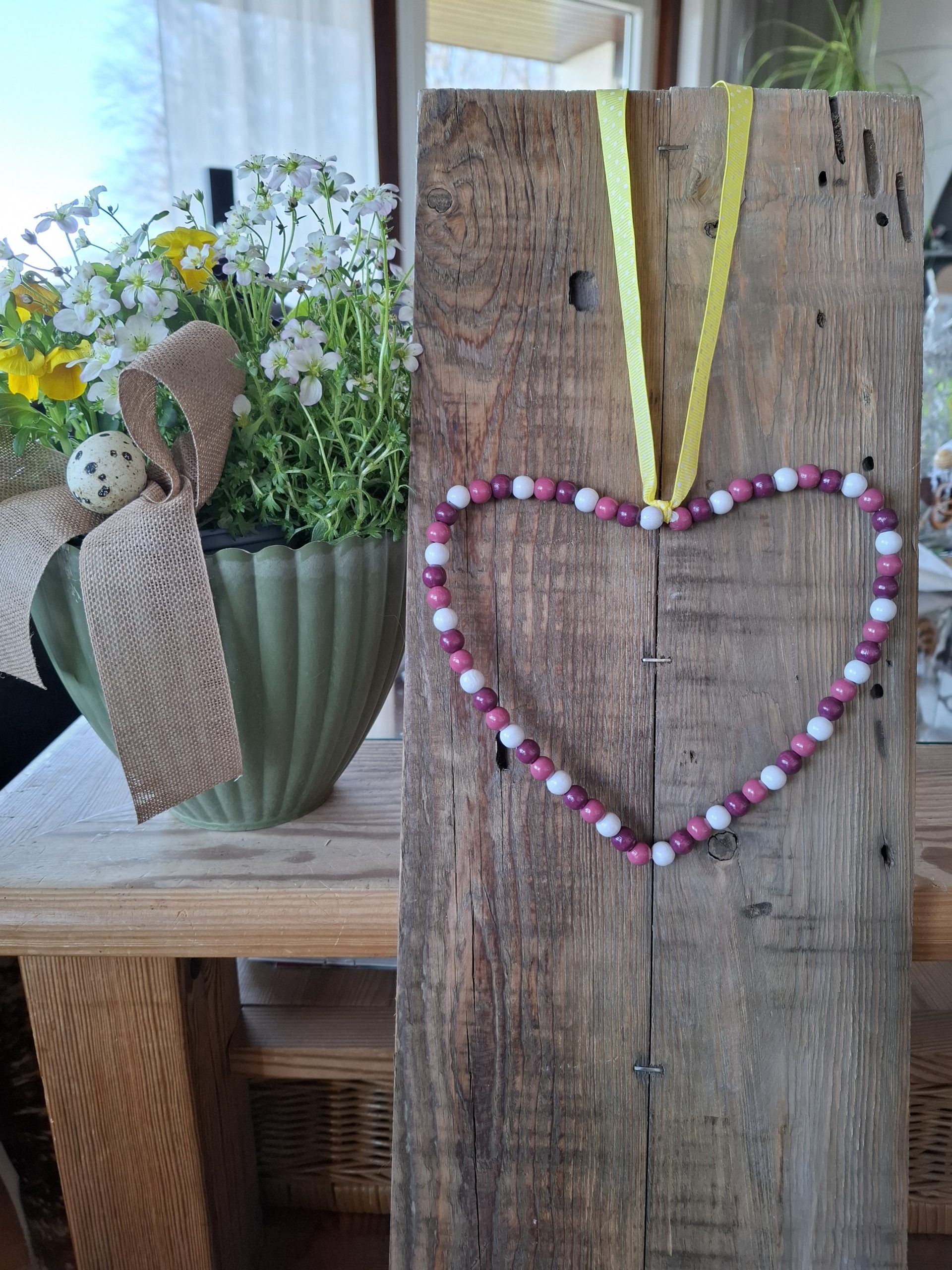 Deko-Herz aus Holzperlen und Draht mit einem Bändel zum Aufhängen
