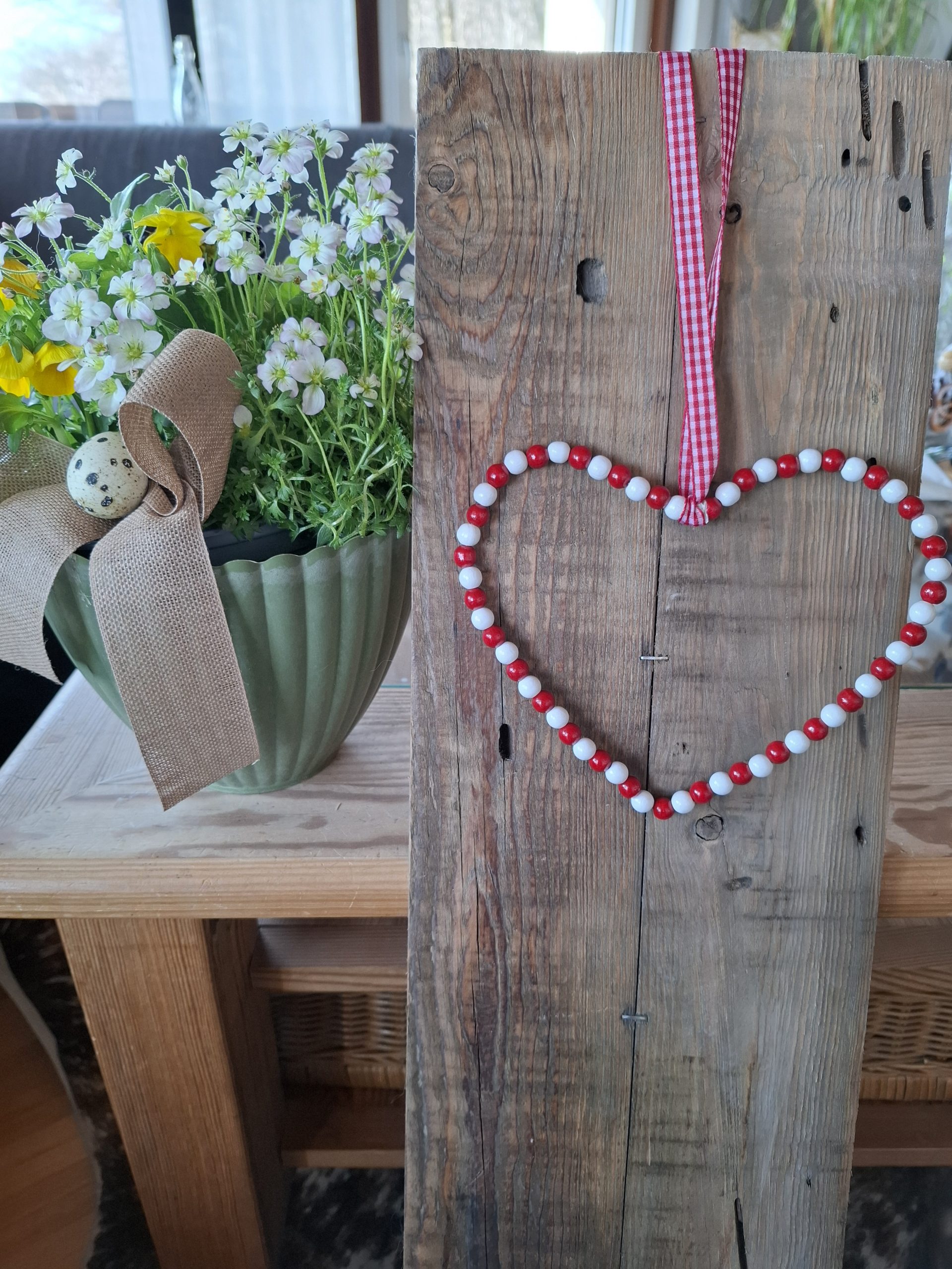 Deko-Herz aus Holzperlen und Draht mit einem Bändel zum Aufhängen