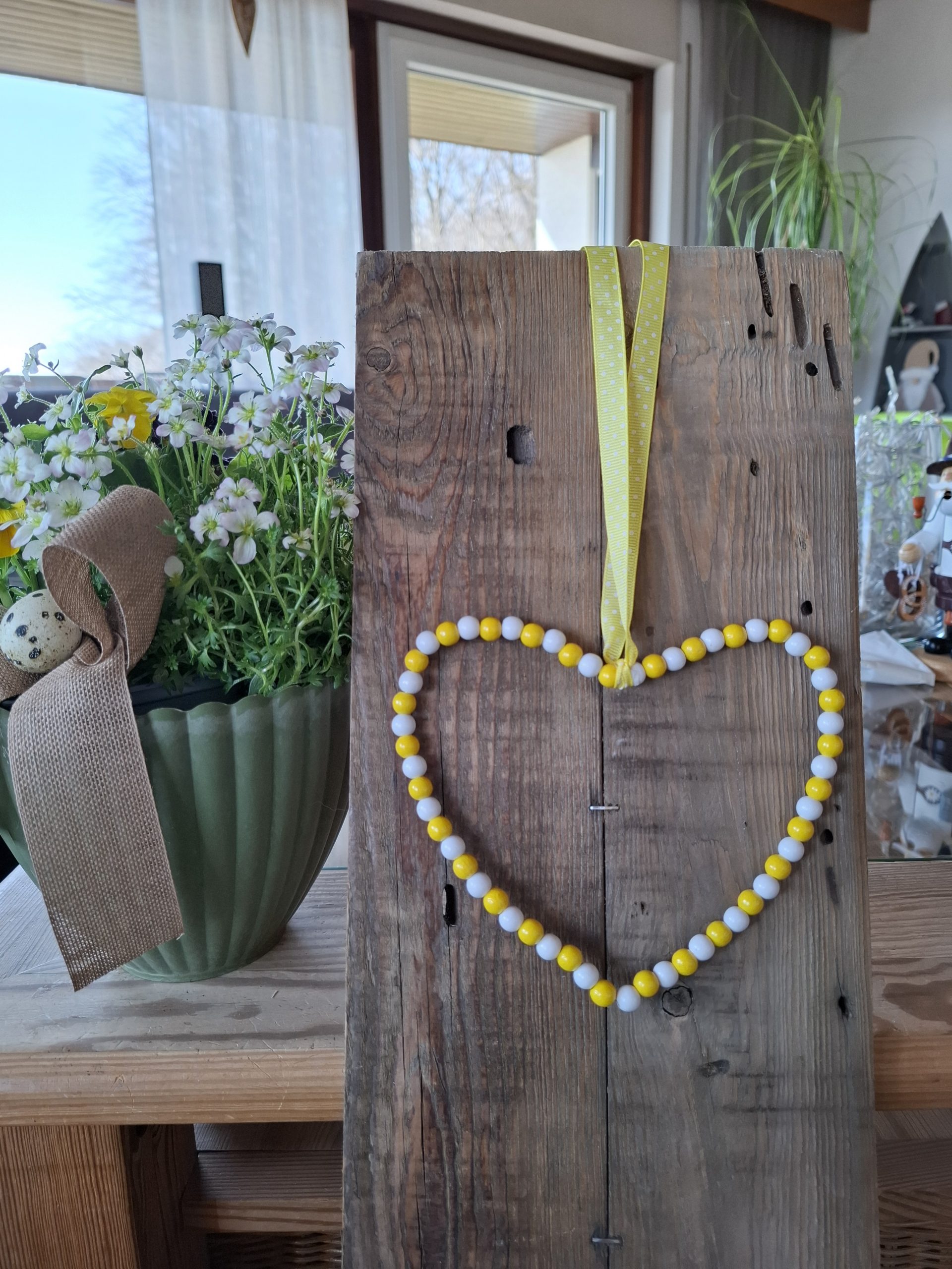 Deko-Herz aus Holzperlen und Draht mit einem Bändel zum Aufhängen