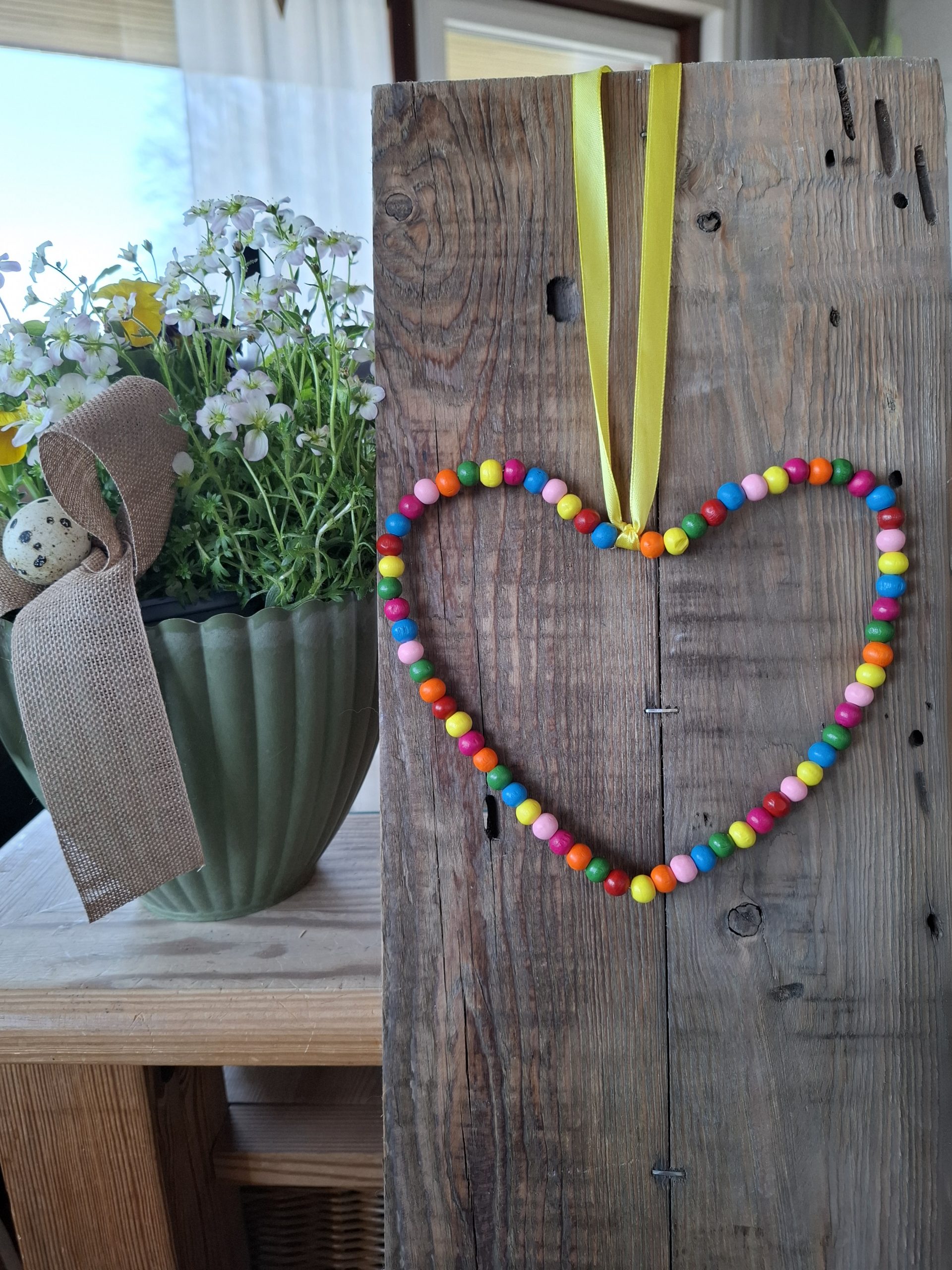 Deko-Herz aus Holzperlen und Draht mit einem Bändel zum Aufhängen