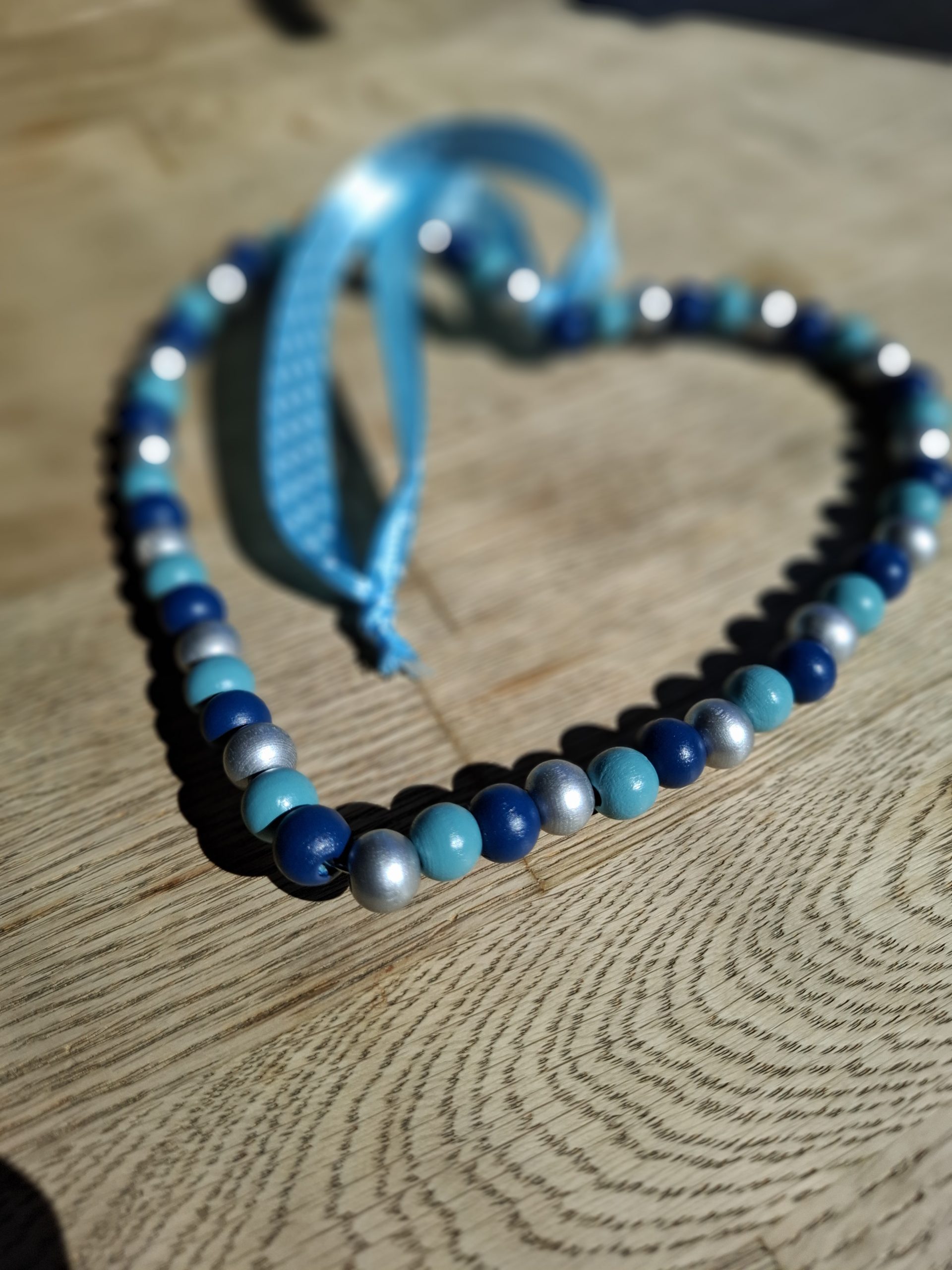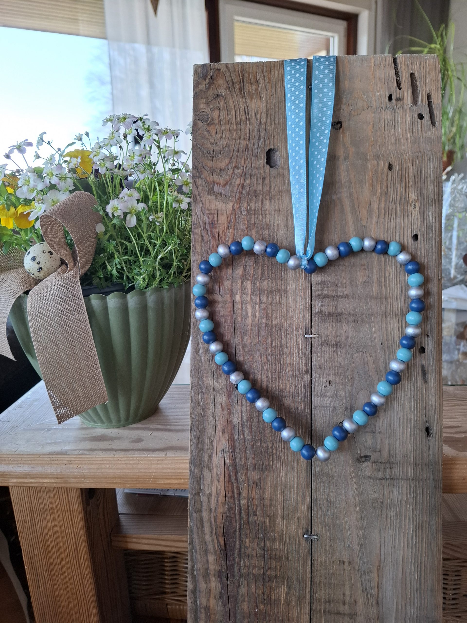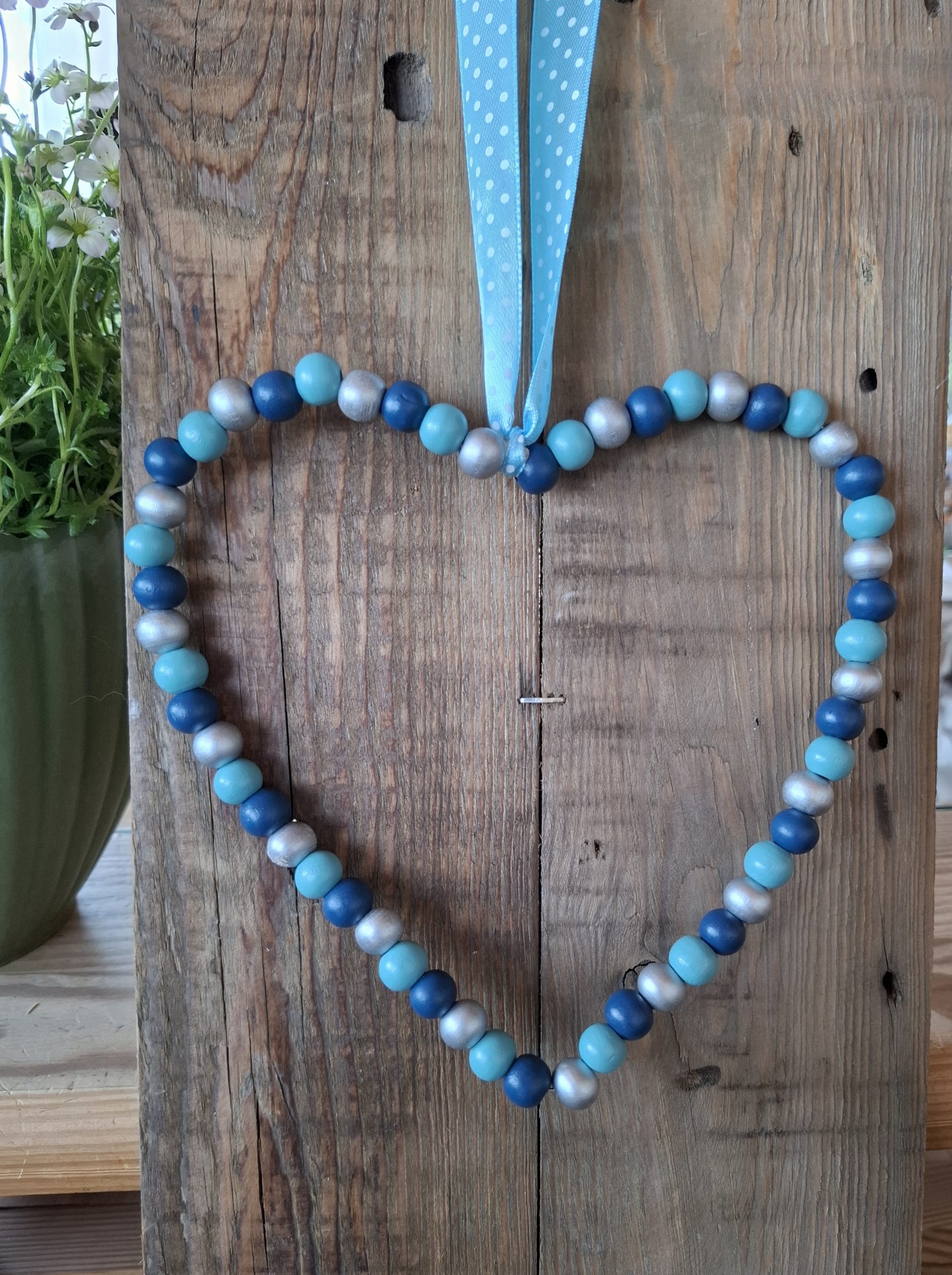 Deko-Herz aus Holzperlen und Draht mit einem Bändel zum Aufhängen