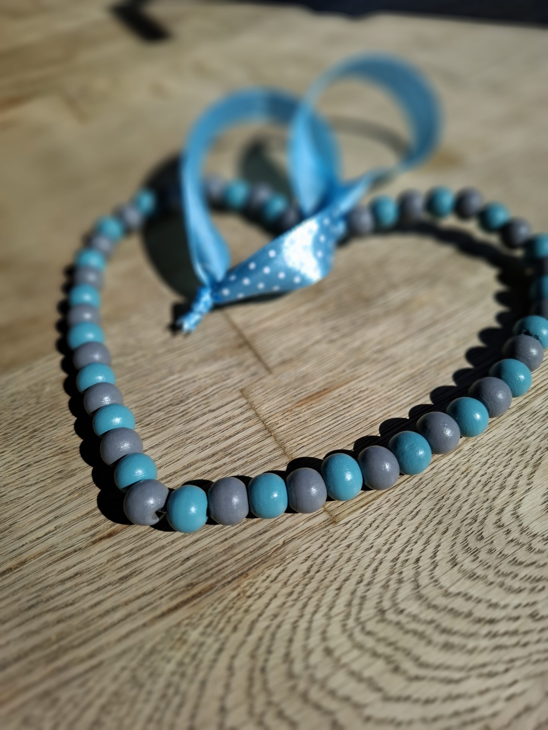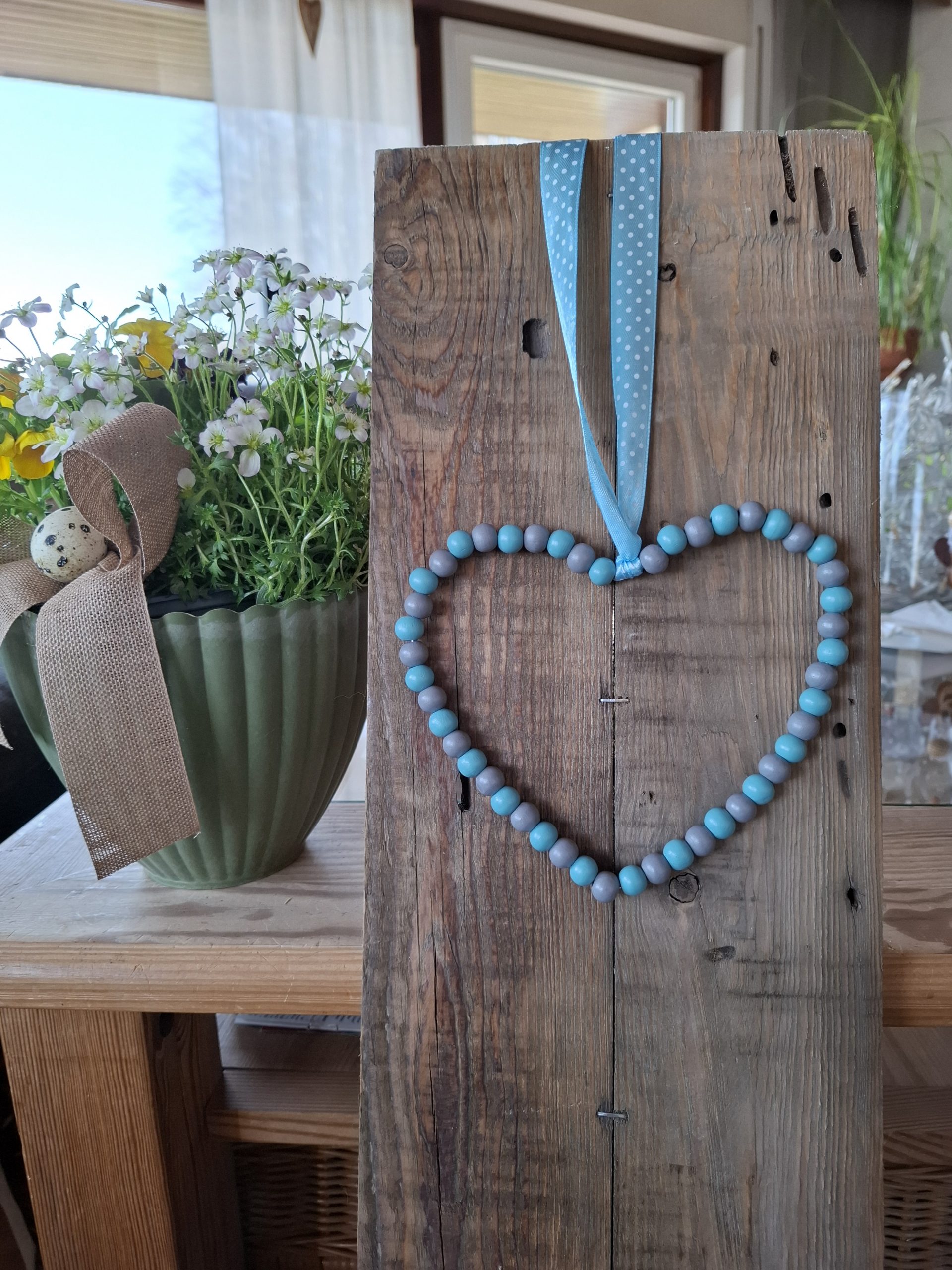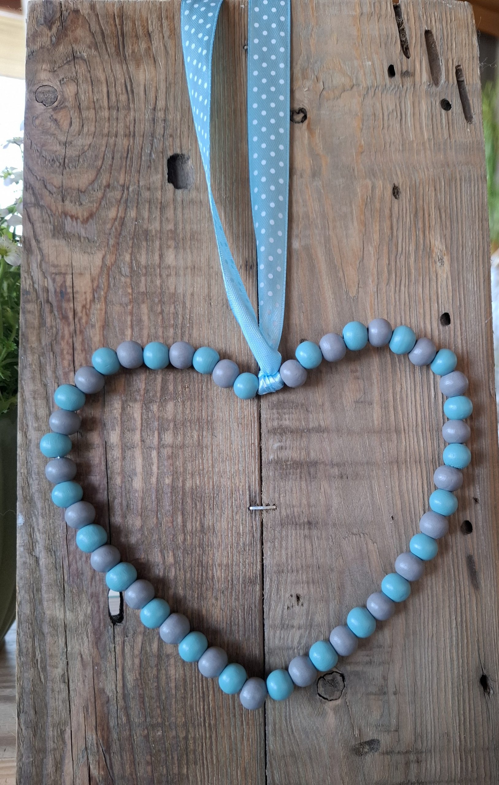 Deko-Herz aus Holzperlen und Draht mit einem Bändel zum Aufhängen