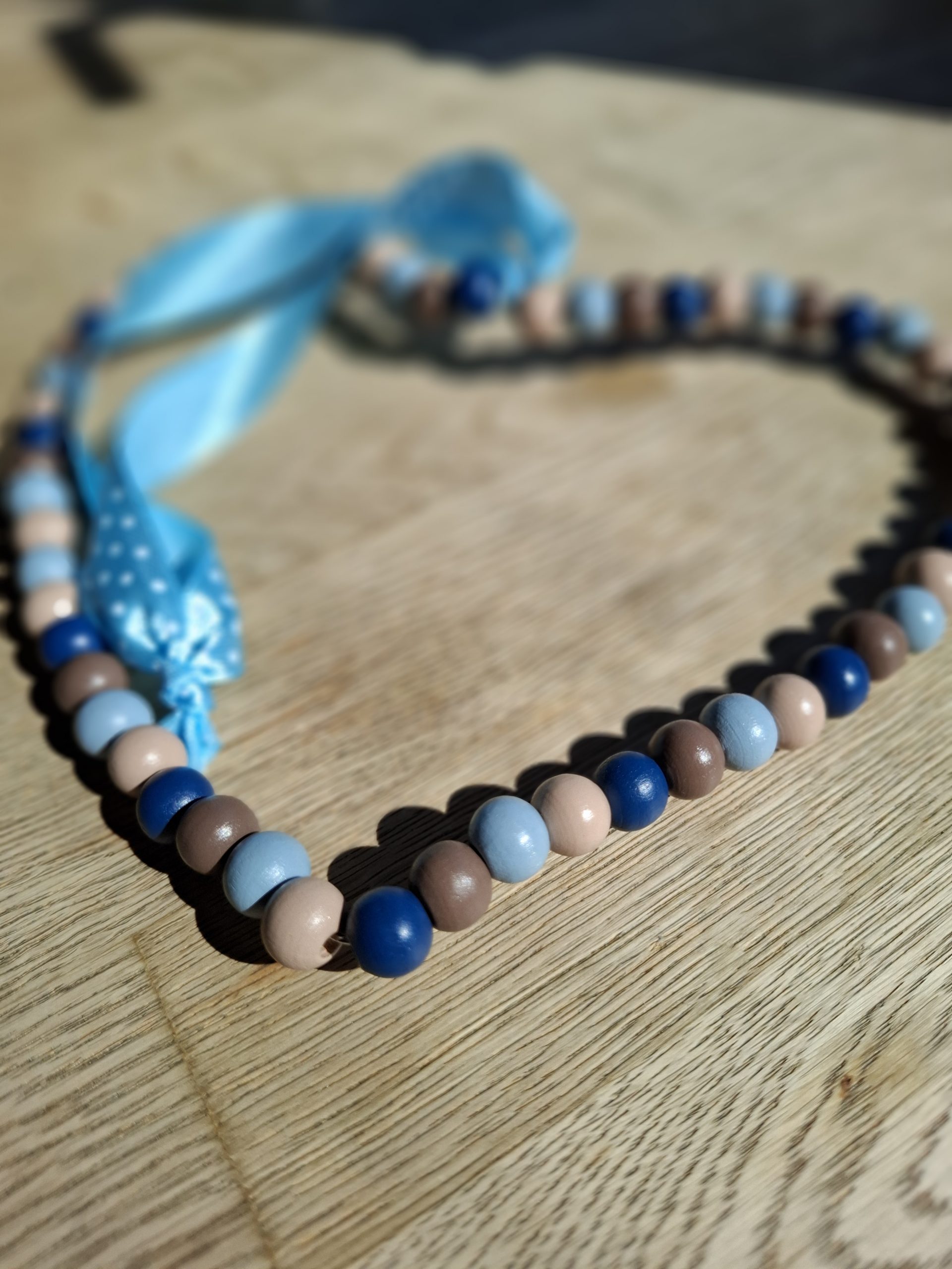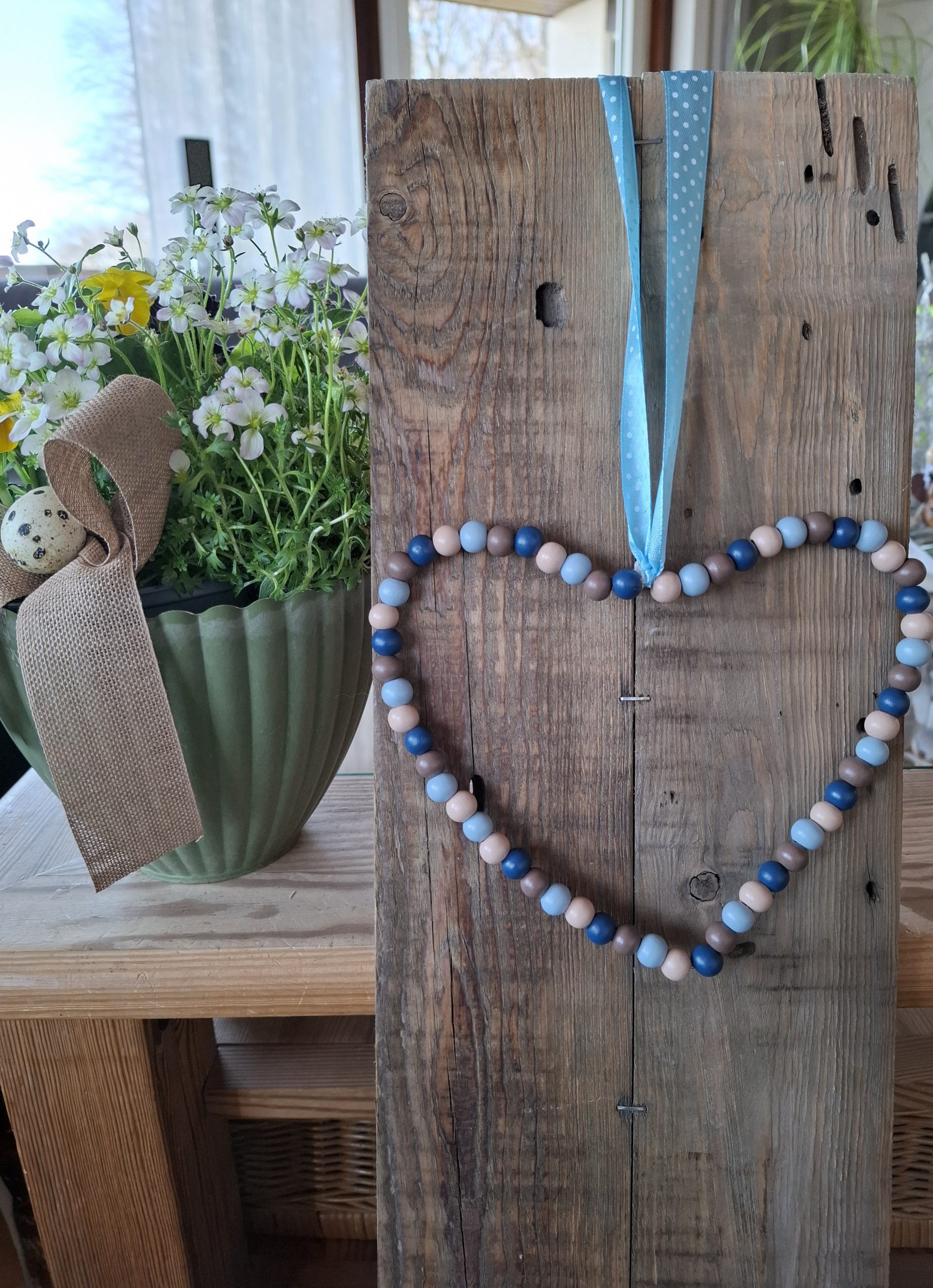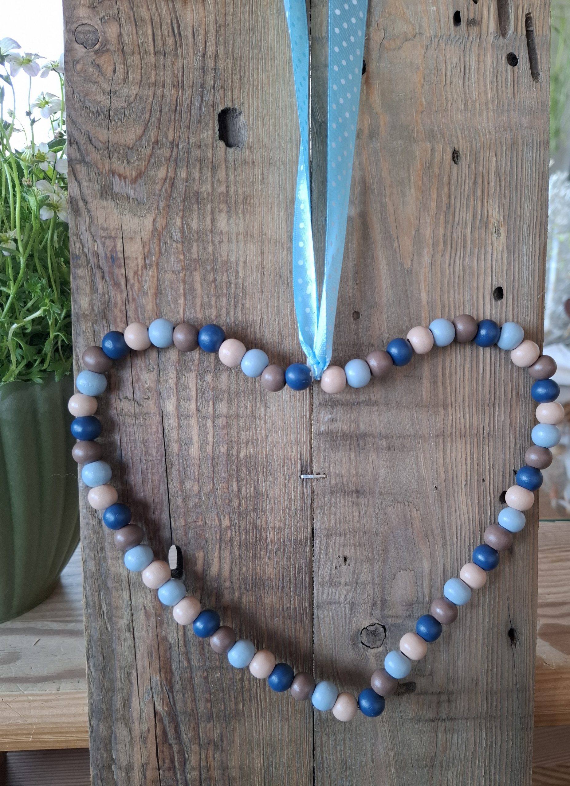 Deko-Herz aus Holzperlen und Draht mit einem Bändel zum Aufhängen