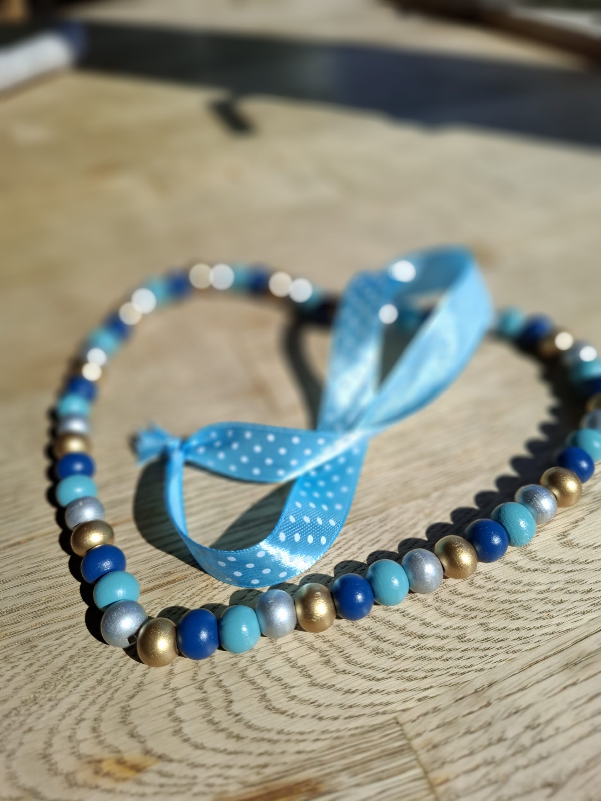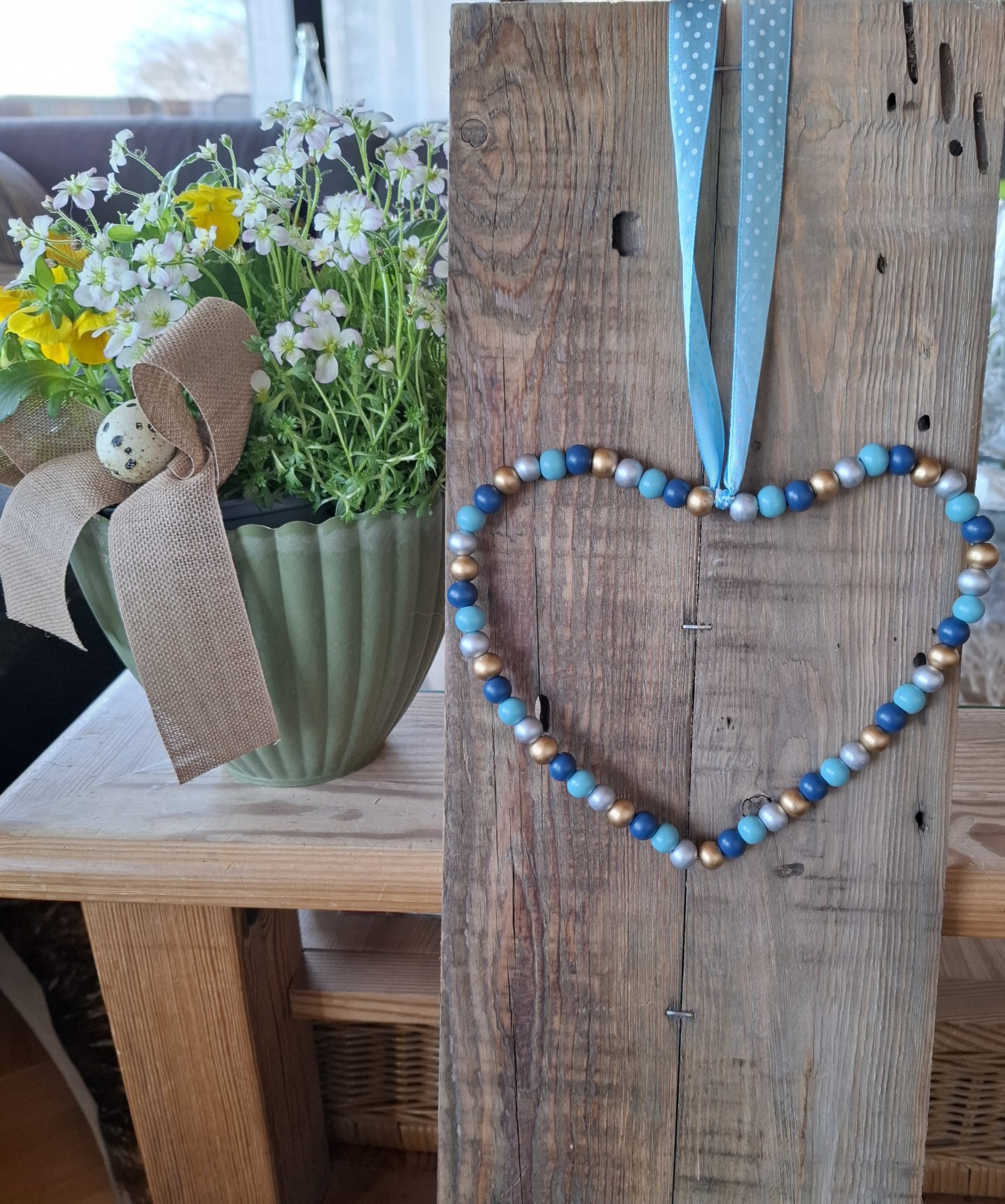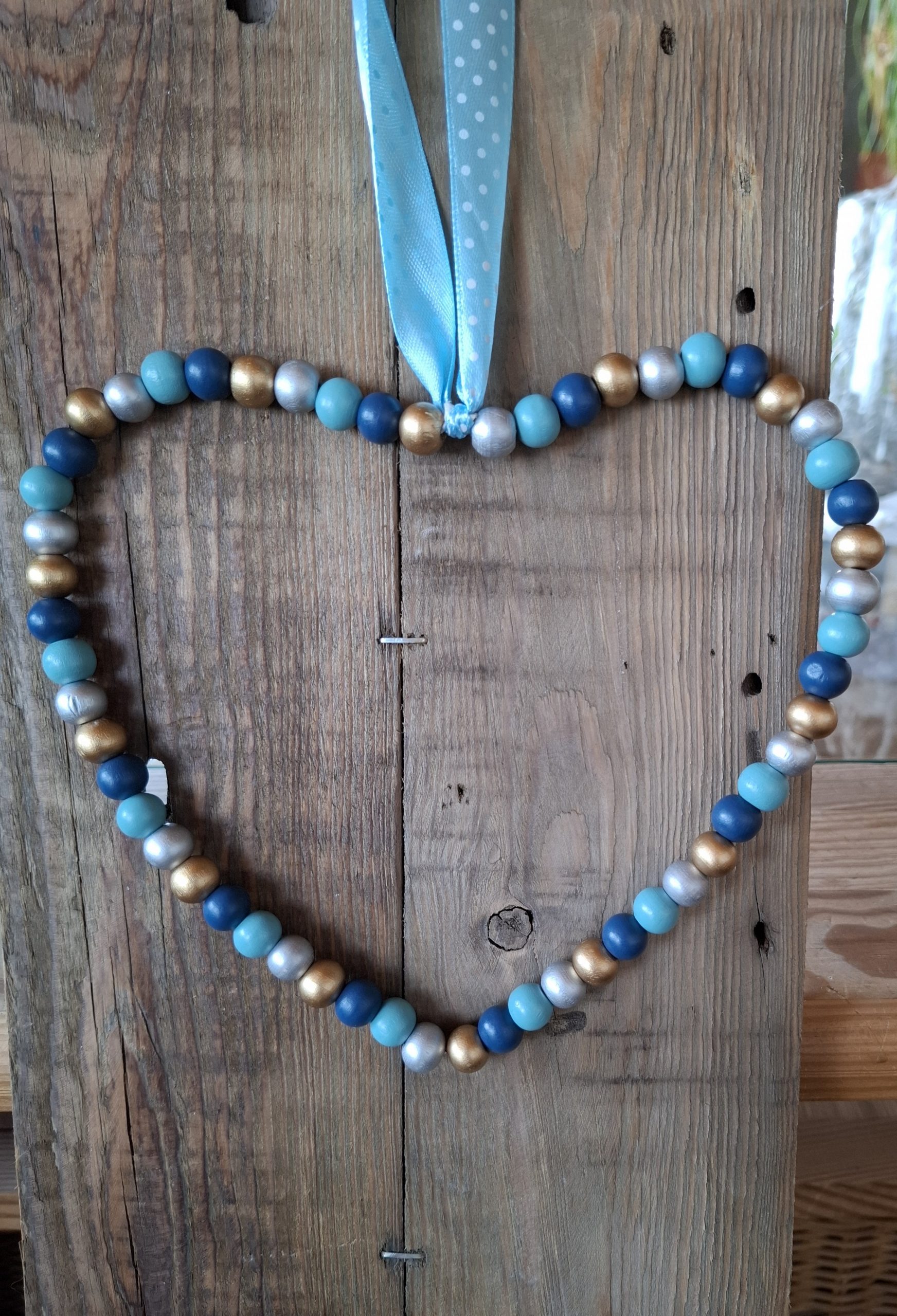 Deko-Herz aus Holzperlen und Draht mit einem Bändel zum Aufhängen