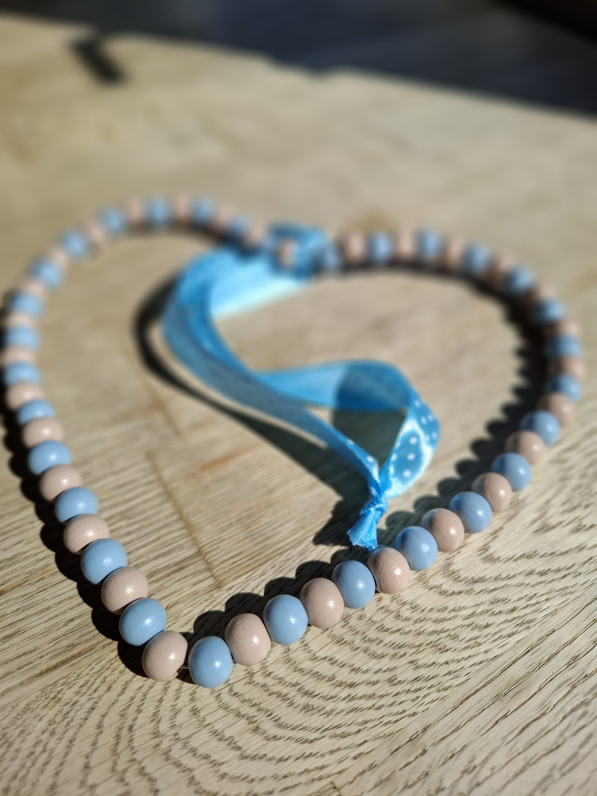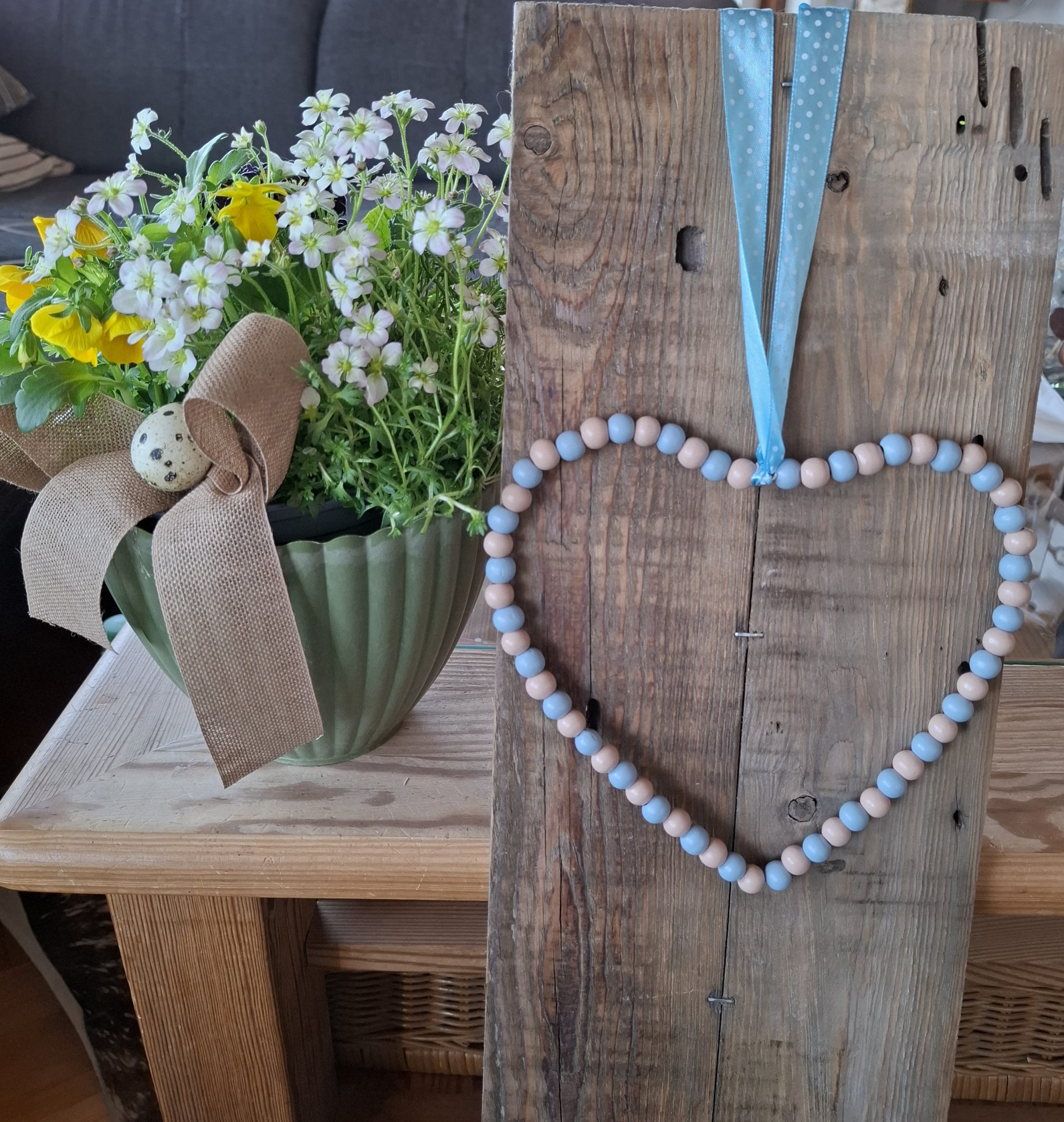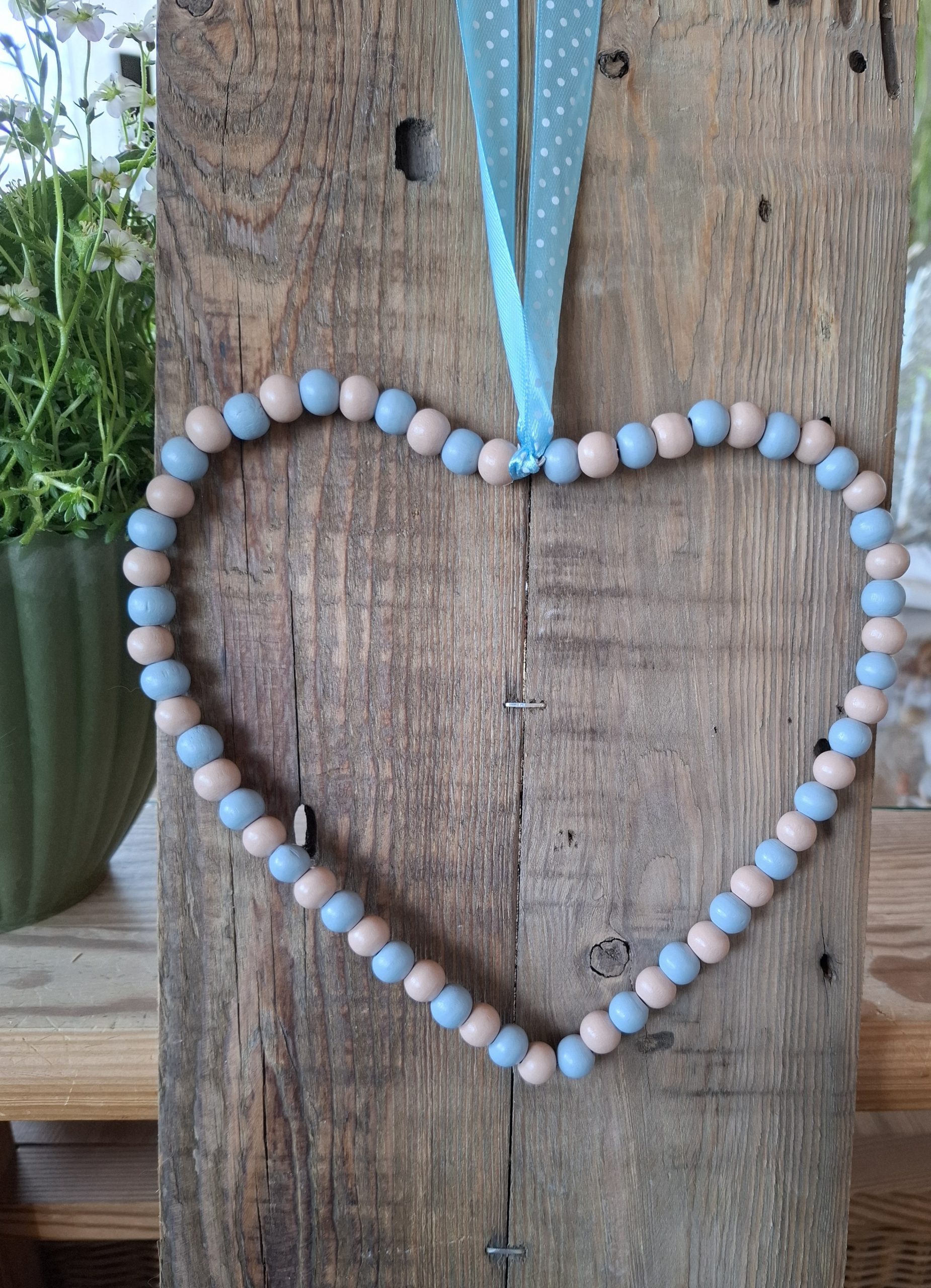 Deko-Herz aus Holzperlen und Draht mit einem Bändel zum Aufhängen