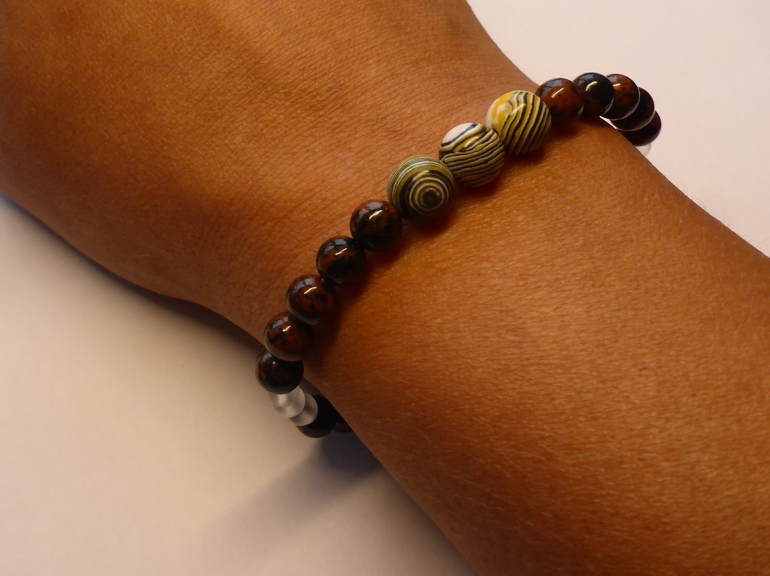 Schönes Armband aus Malachitperlen in gelb-schwarz und Obsidian Mahagoni Edelsteine.