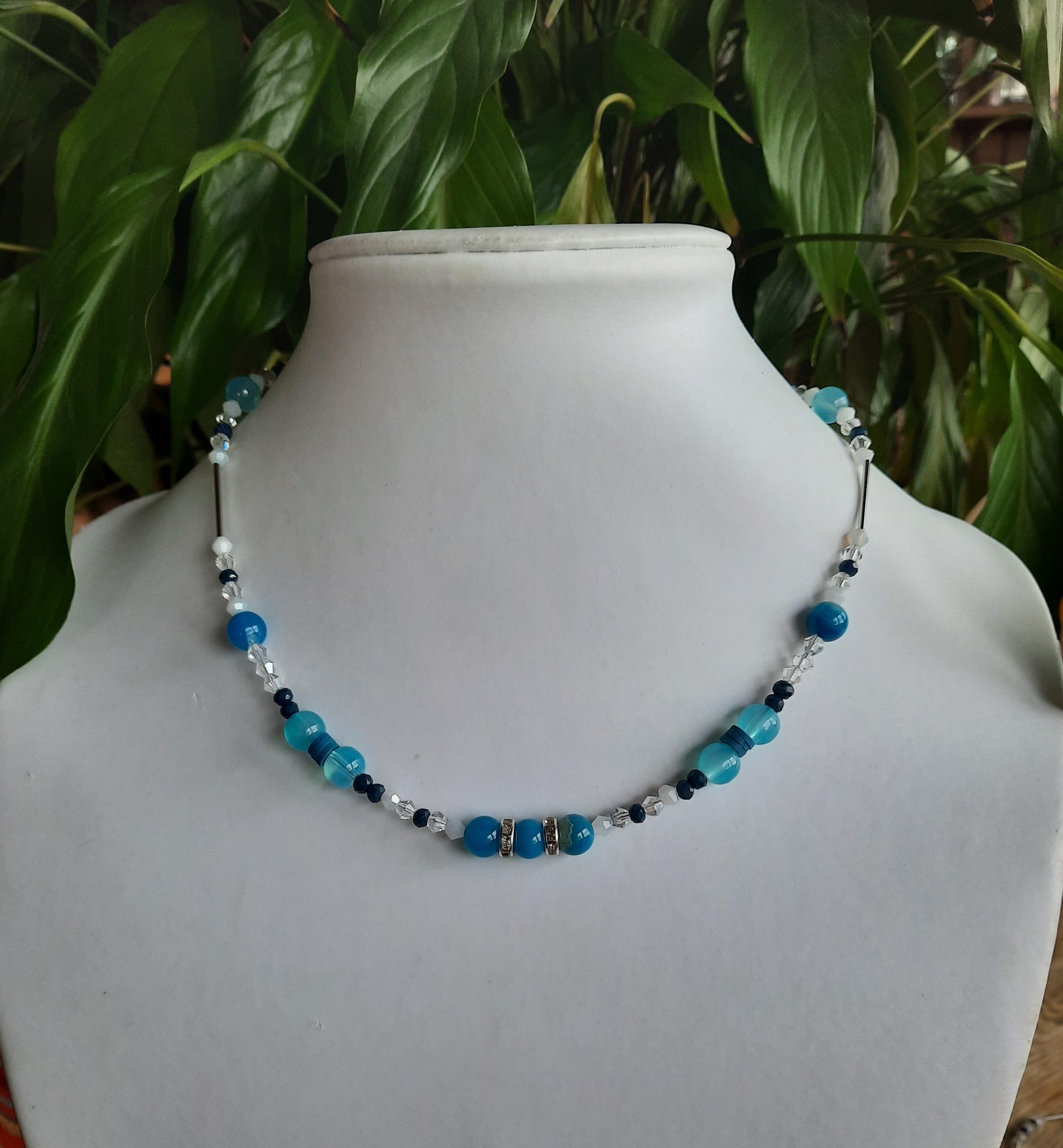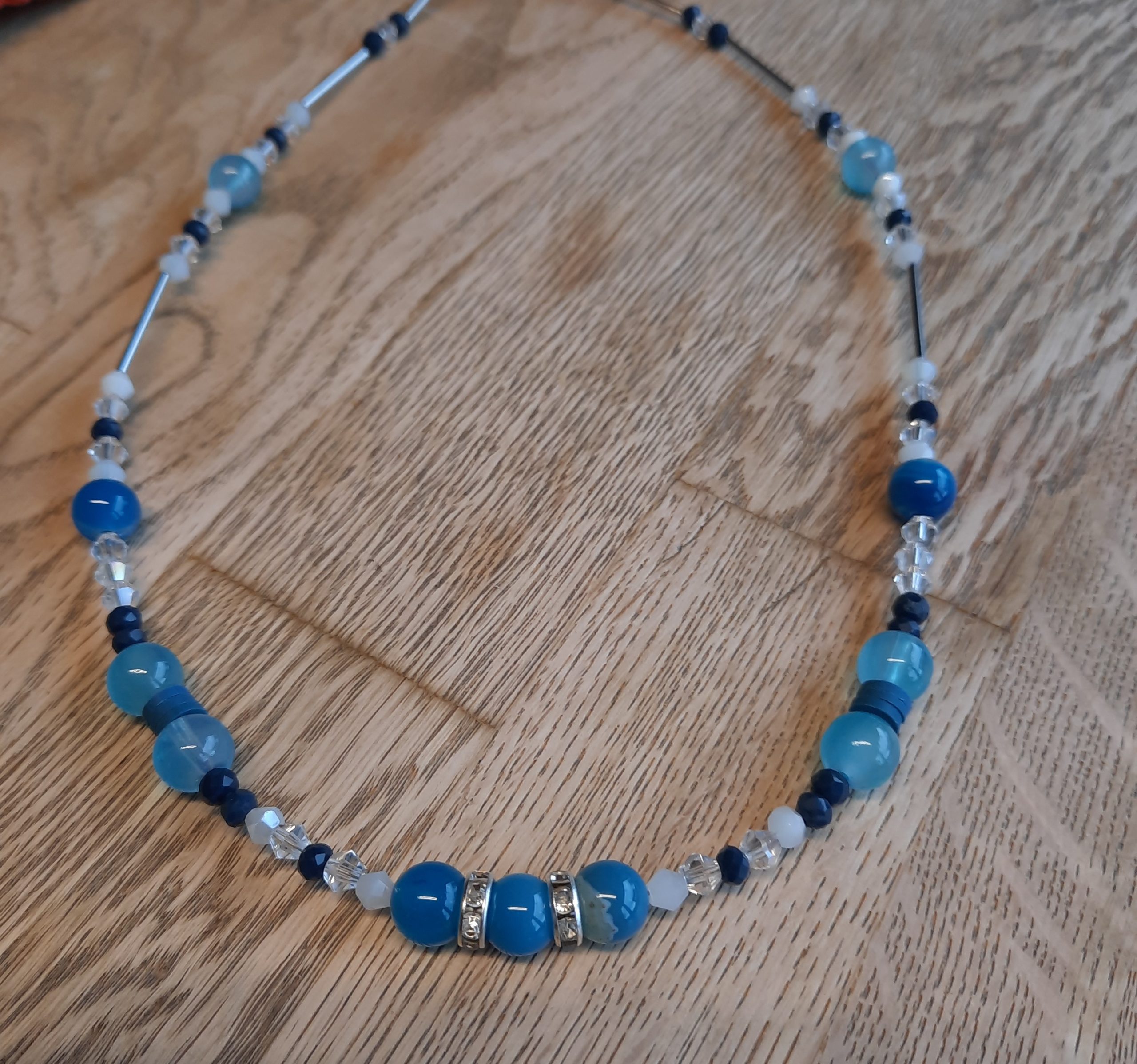 Diese Kette besteht aus hellblauen Jadeperlen und blauen Glasperlen. Als Highlights sind 2 silberne Strasssteine und viele kleine Doppelkegelperlen dazwischen.