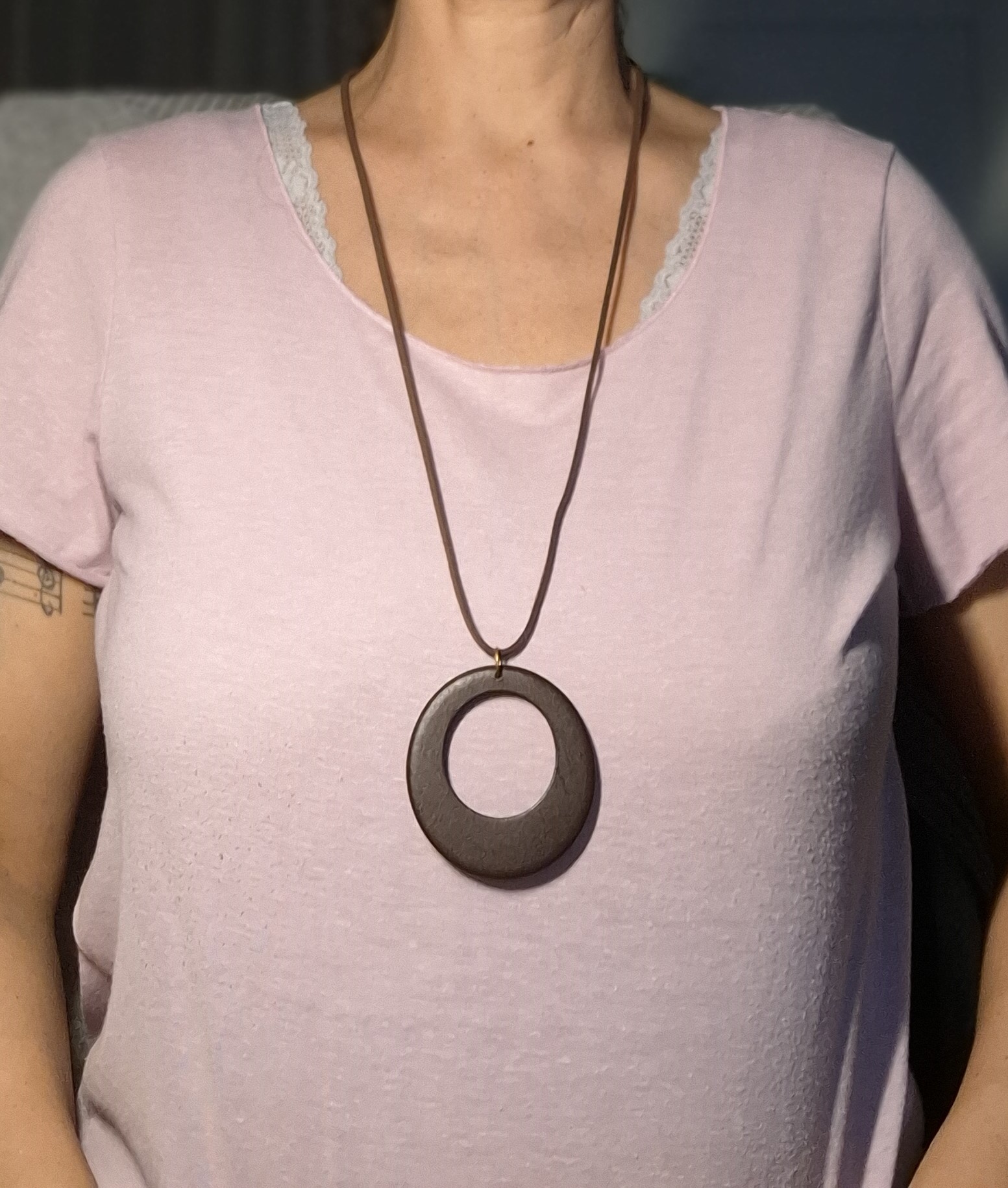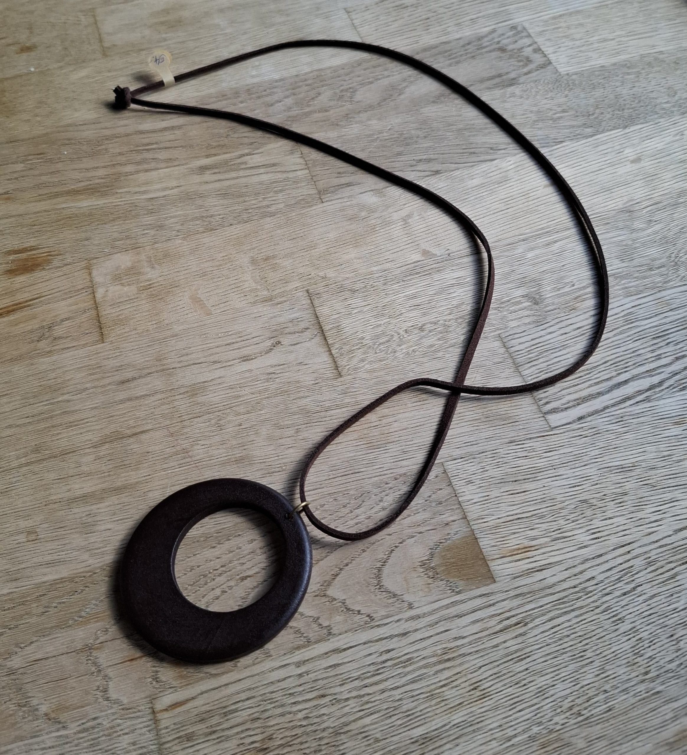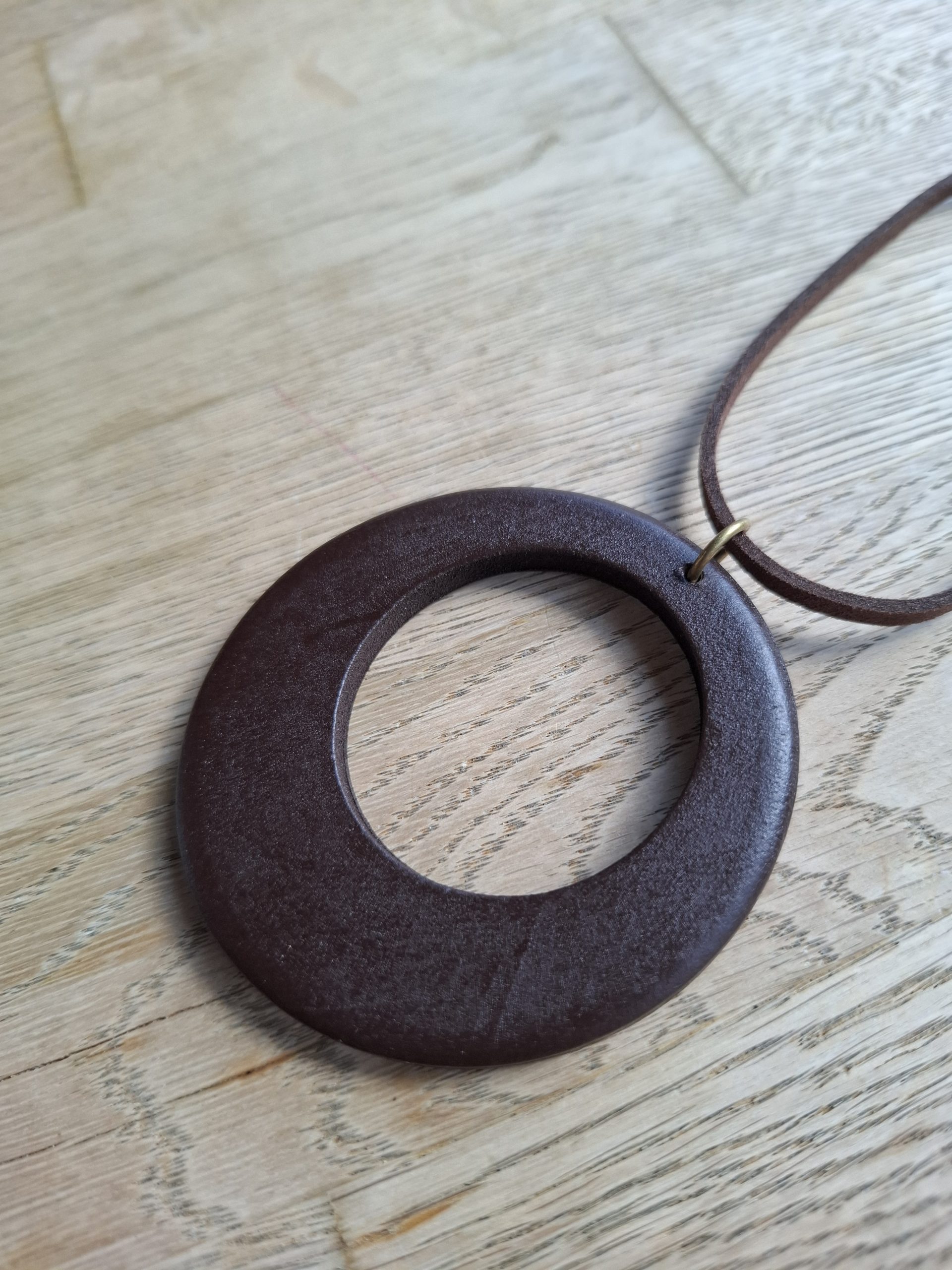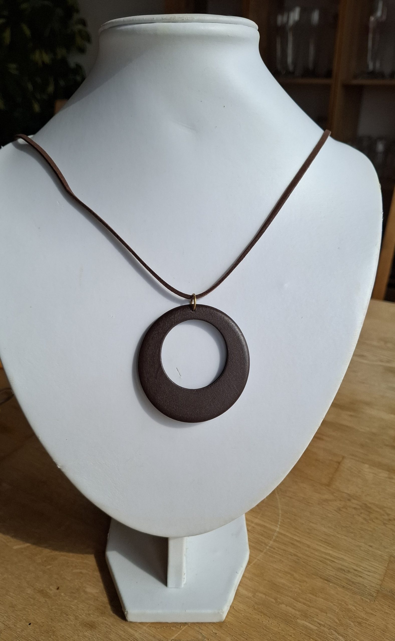 Diese Halskette besteht aus einem Lederband mit einem Knoten als Verschluss. Als Highlight gibt es einen großen Holzanhänger, der sehr leicht und angenehm zu tragen ist.