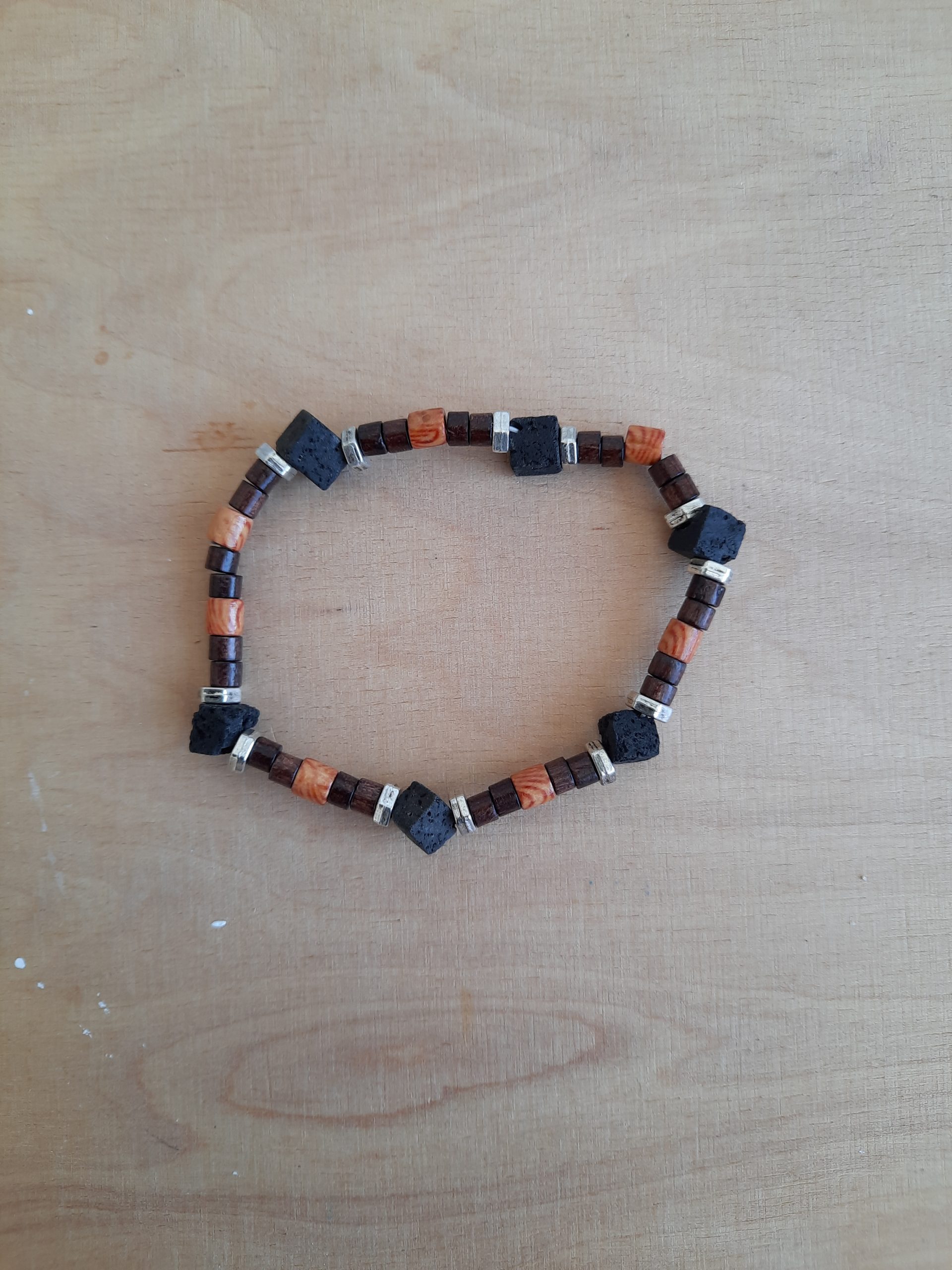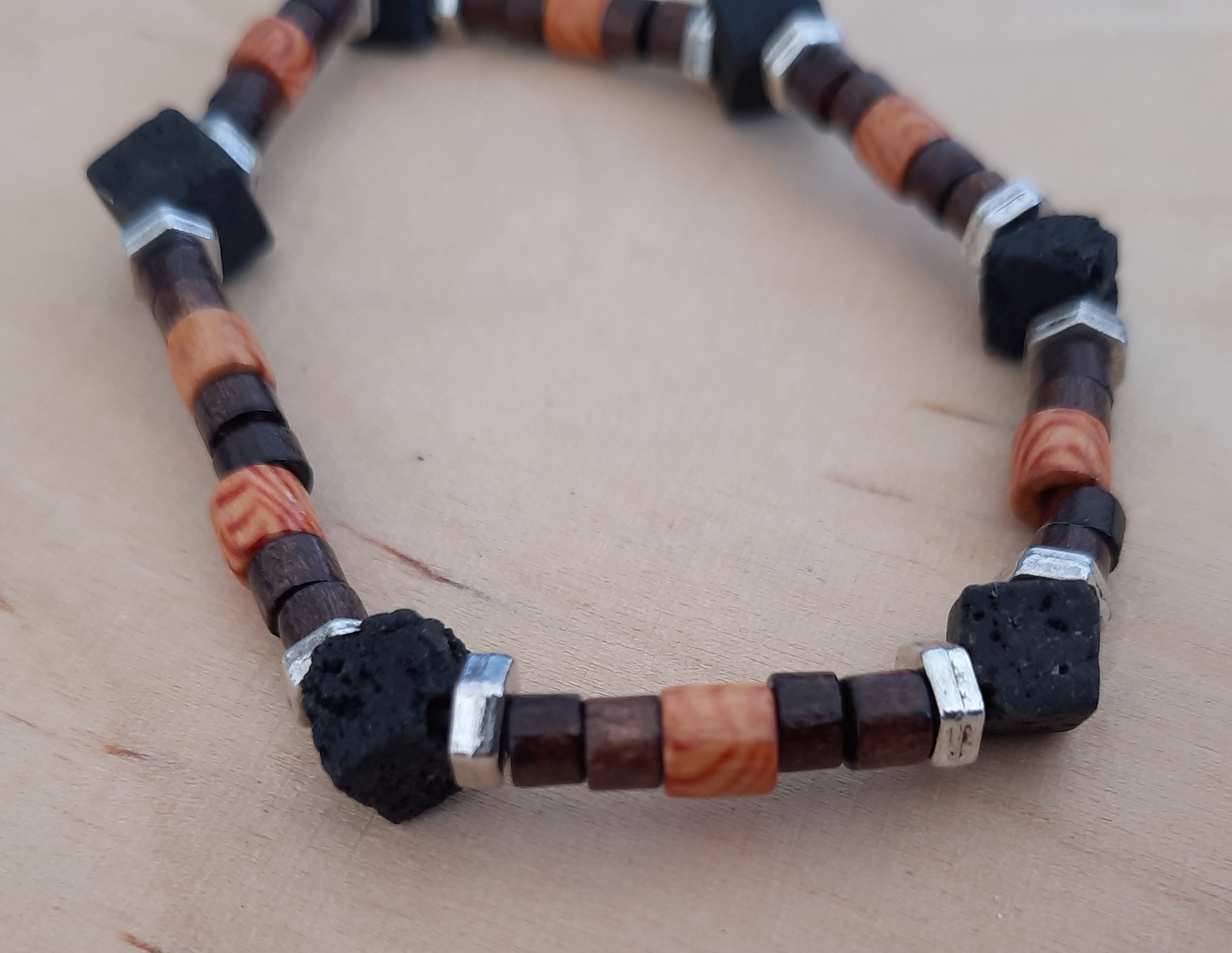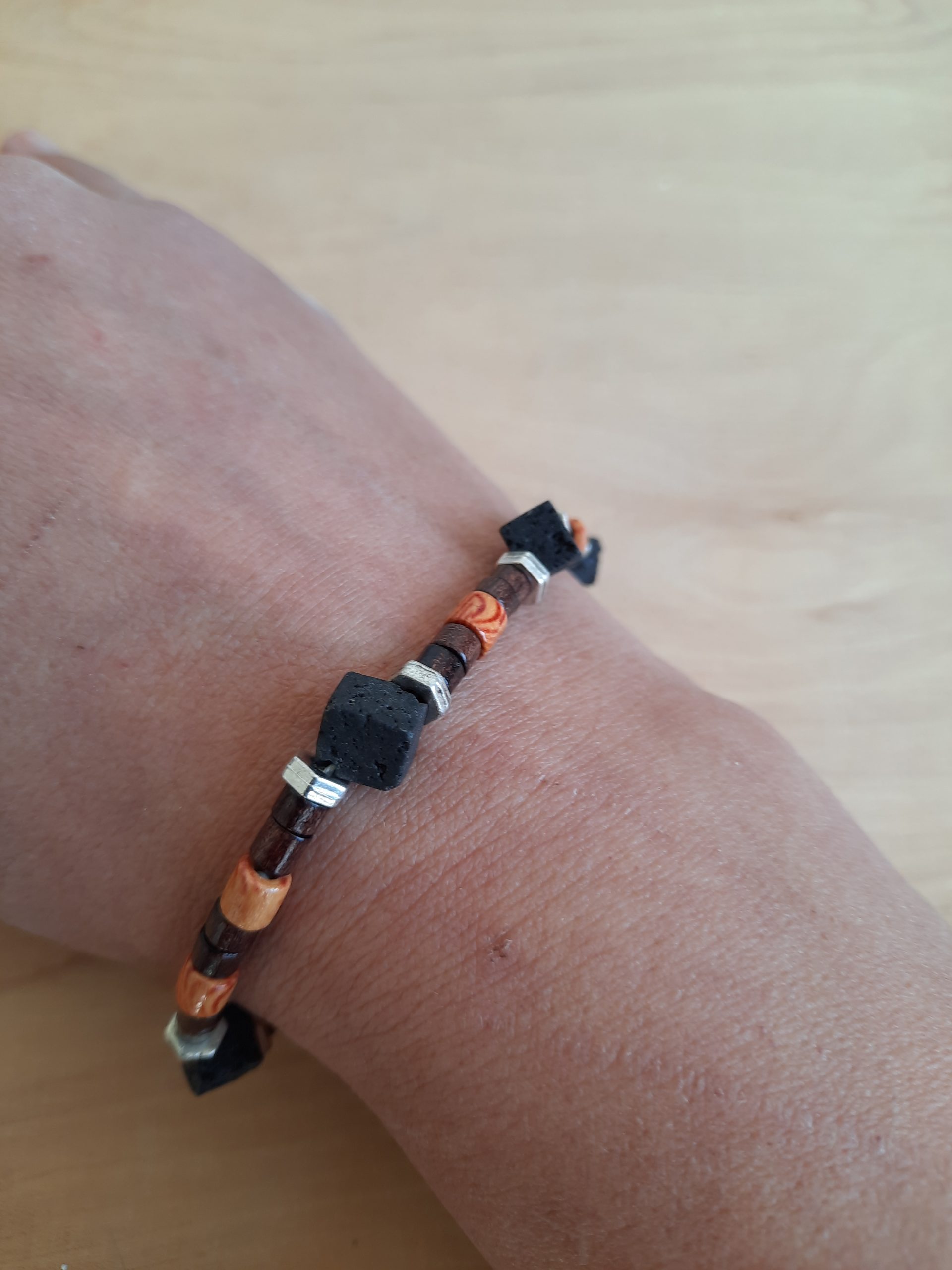 Dieses Armband ist aus schwarzen Lavaperlwürfel, mini Holzperlen in verschiedenen Farben und silbernen Zwischenteilen, die aussehen wie kleine „Muttern“ aus dem Werkzeugkasten.