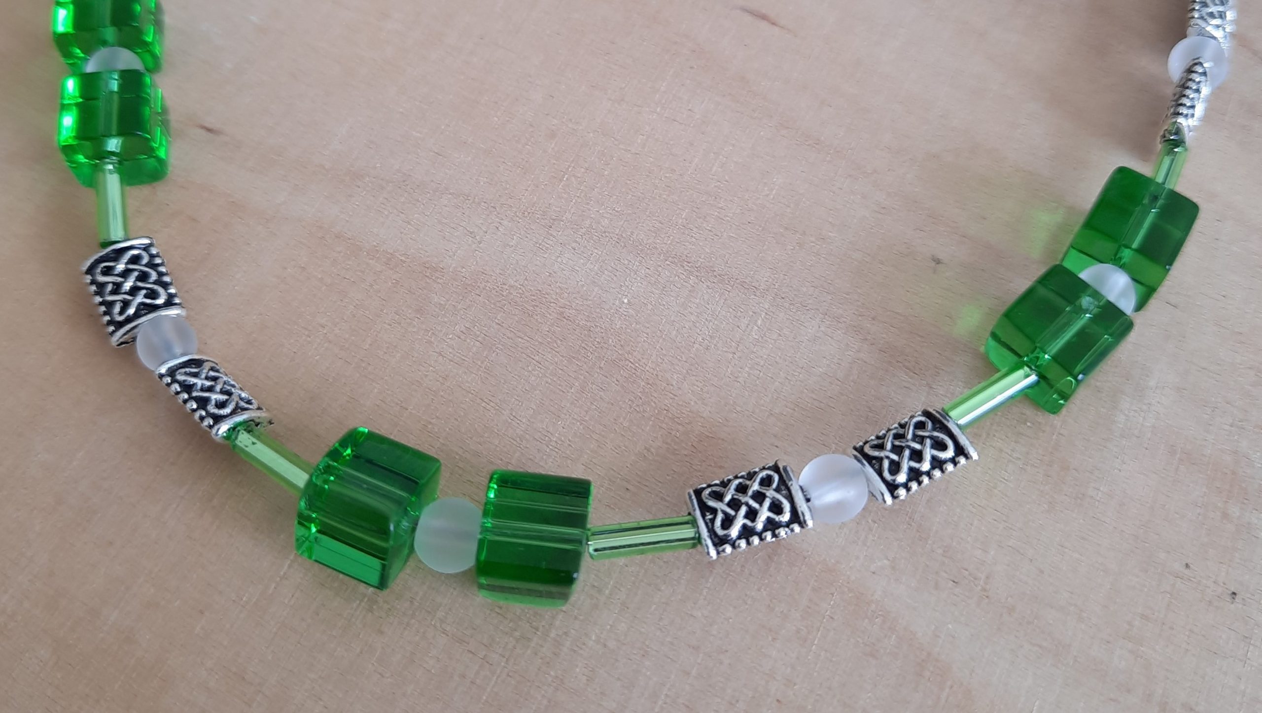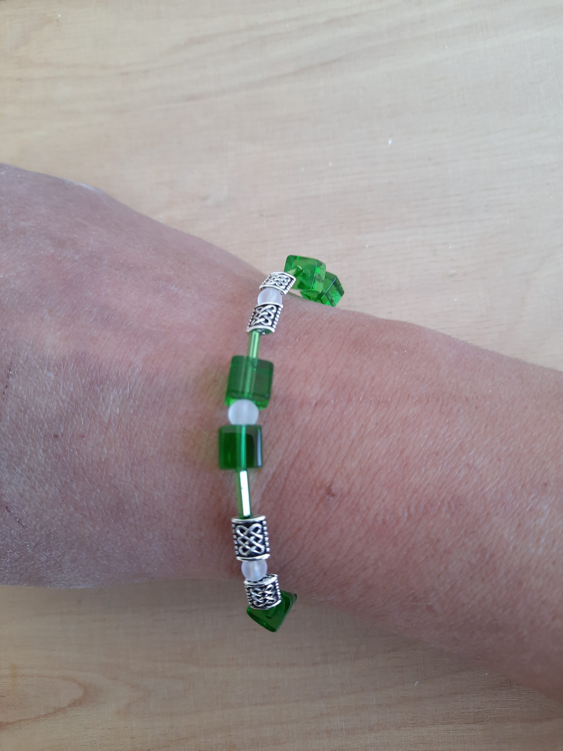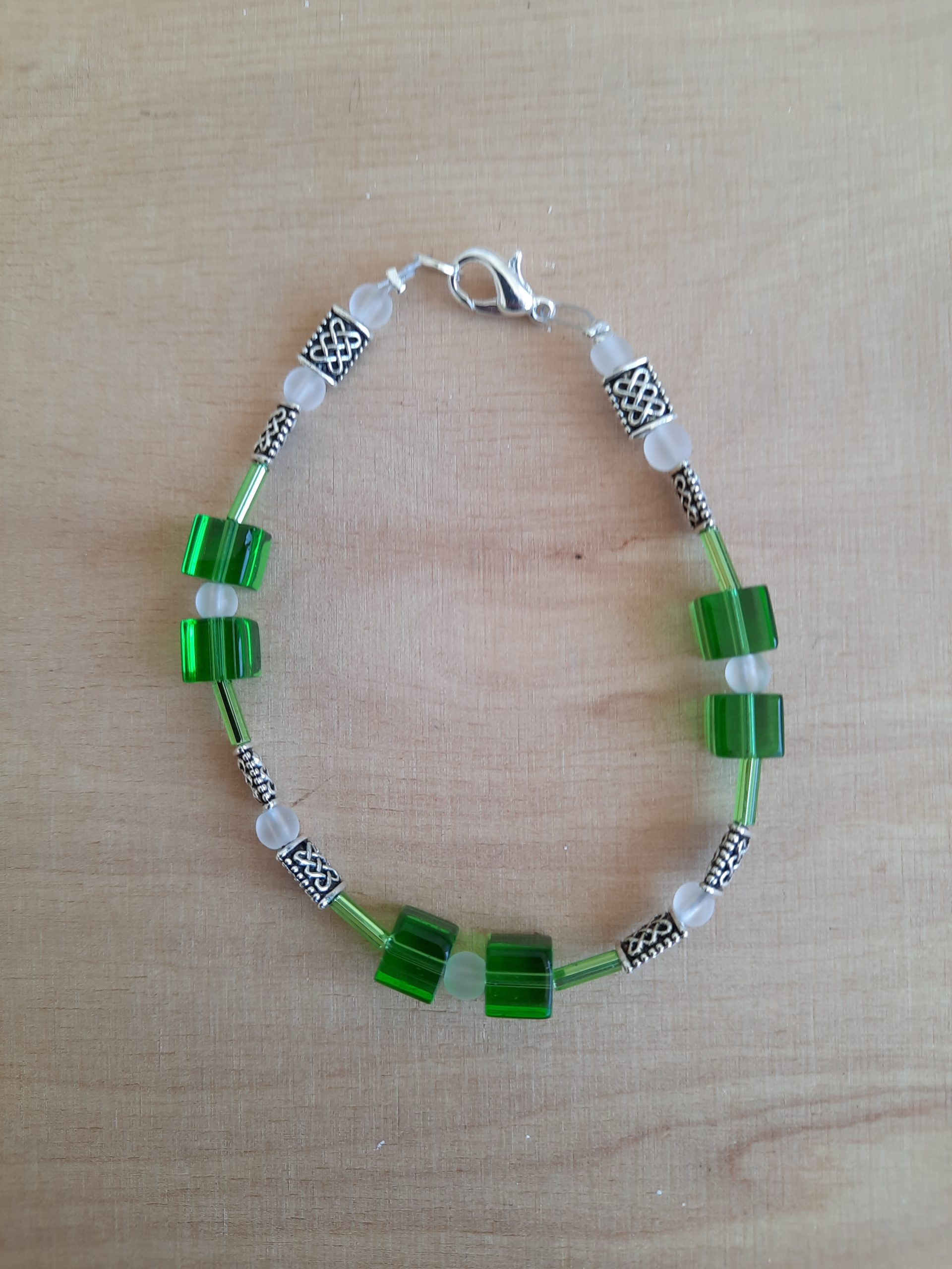 Dieses Armband besteht aus vielen grünen Glasperlenwürfeln, dazwischen transparente Glasperlen und silberne Zwischenteile. Sie funkelt richtig schön und ist garantiert ein Hingucker!
