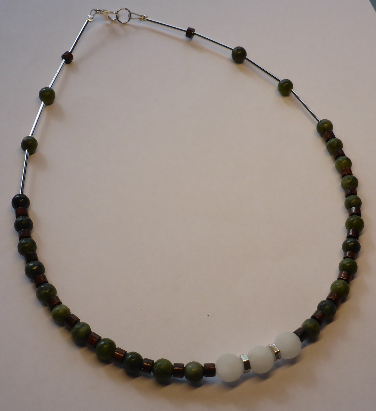 Diese besondere Halskette ist aus grünen und weißen Jadeperlen, dazwischen kleine Holzelemente und silberne Spacer.