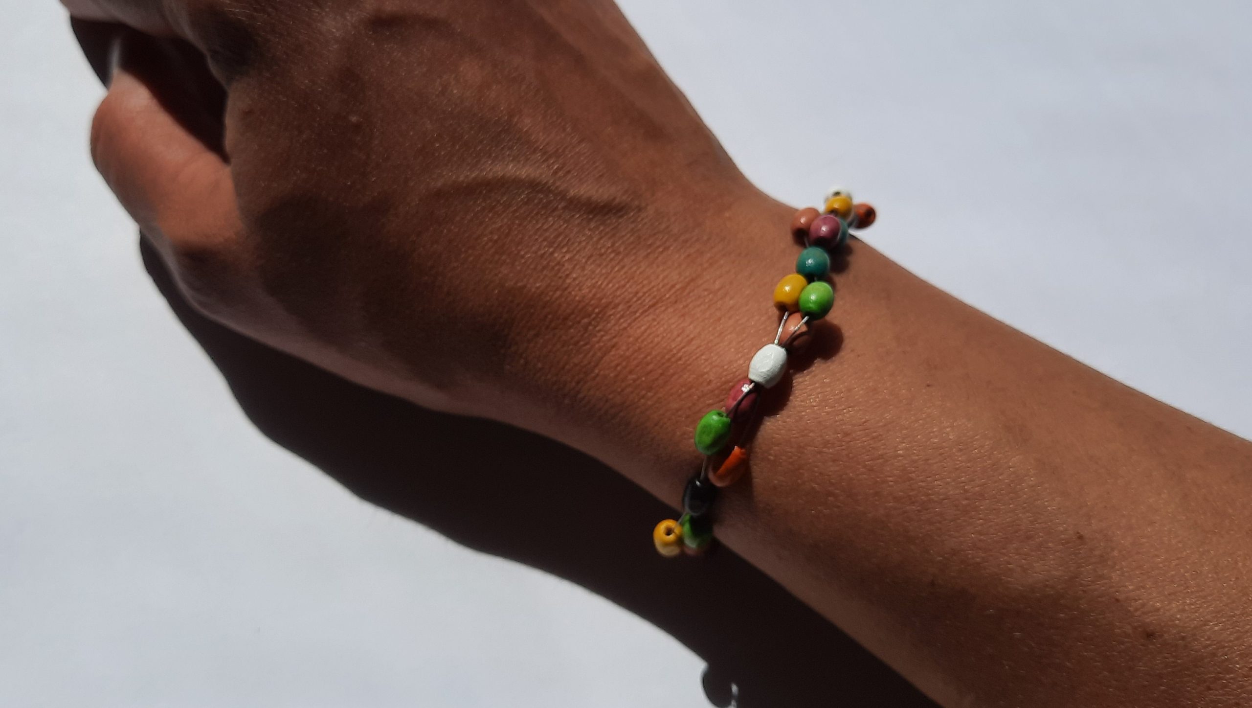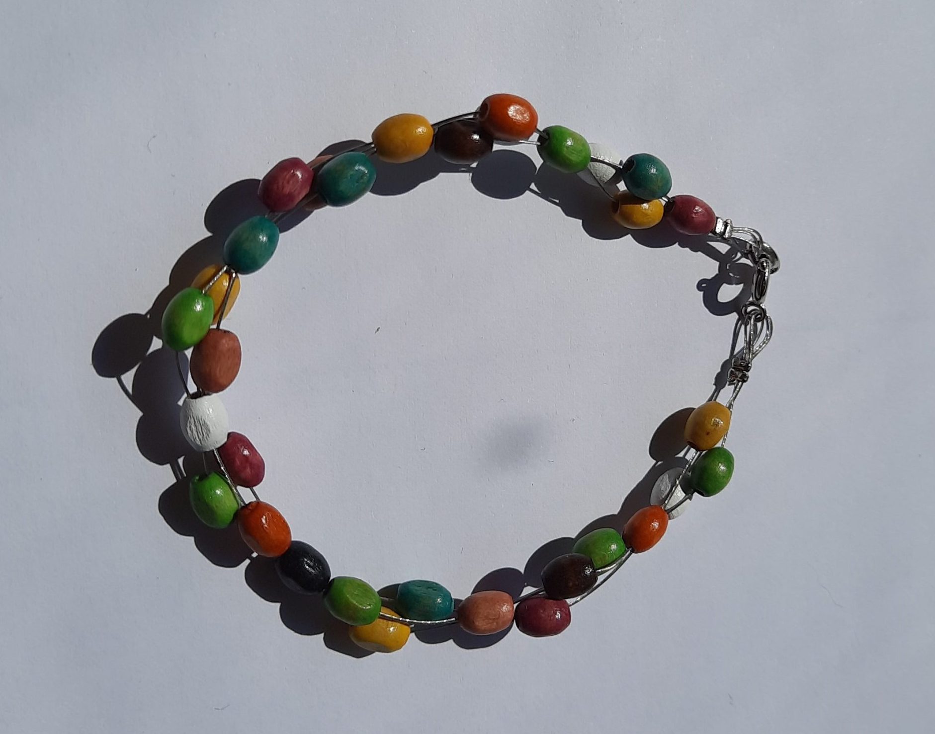Schönes, originelles Armband aus bunten, ovalen Holzperlen, mit drei Drähten ineinander verschlungen.