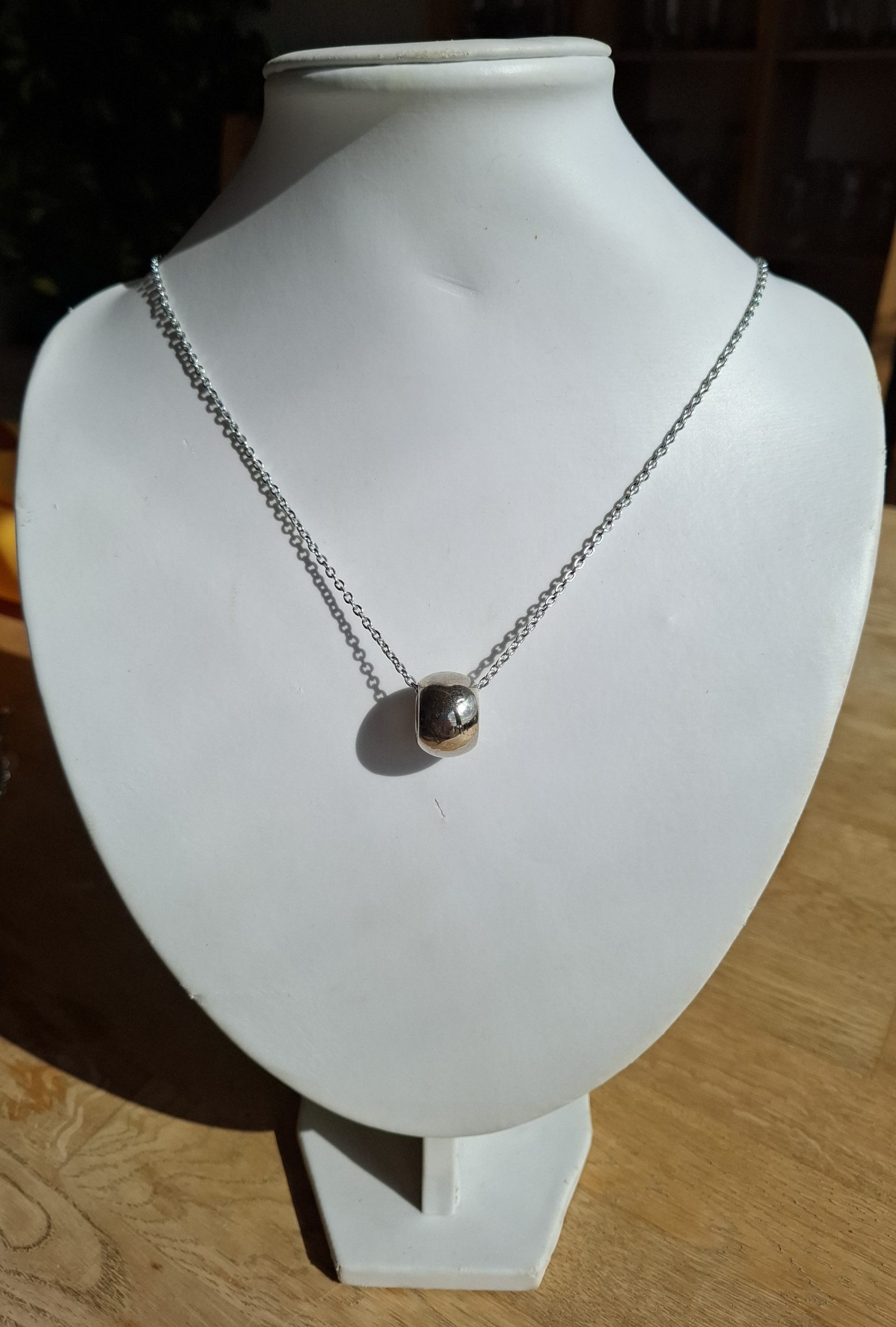 Diese lange Halskette ist eine silberne Kette mit einem silbernen Anhänger als Highlight.