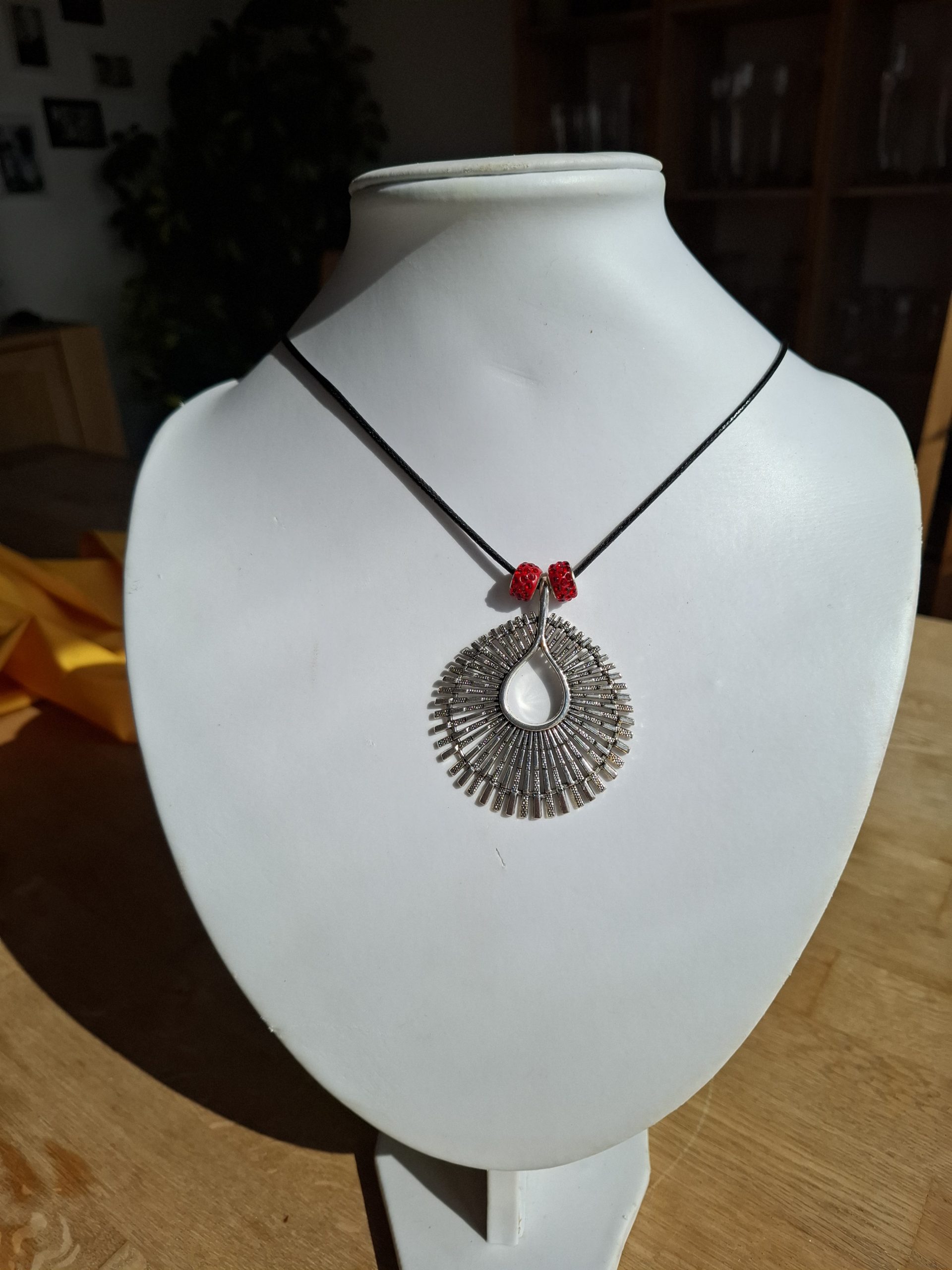 Diese Halskette besteht aus einem Lederband und hat als Highlight einen silbernen Anhänger, der aussieht wie eine Sonne. Sie wird von 2 roten Glitzerperlen umrandet.