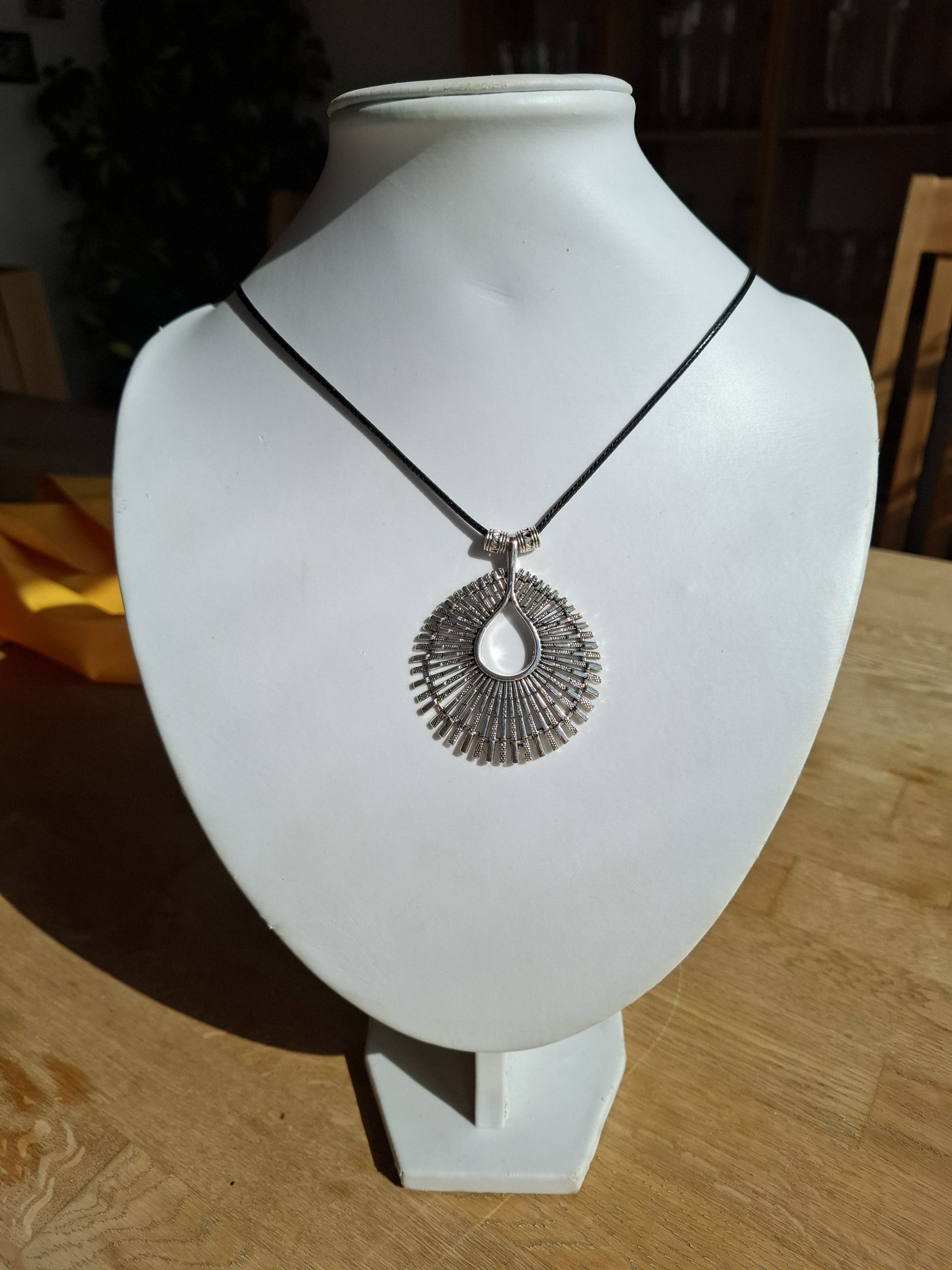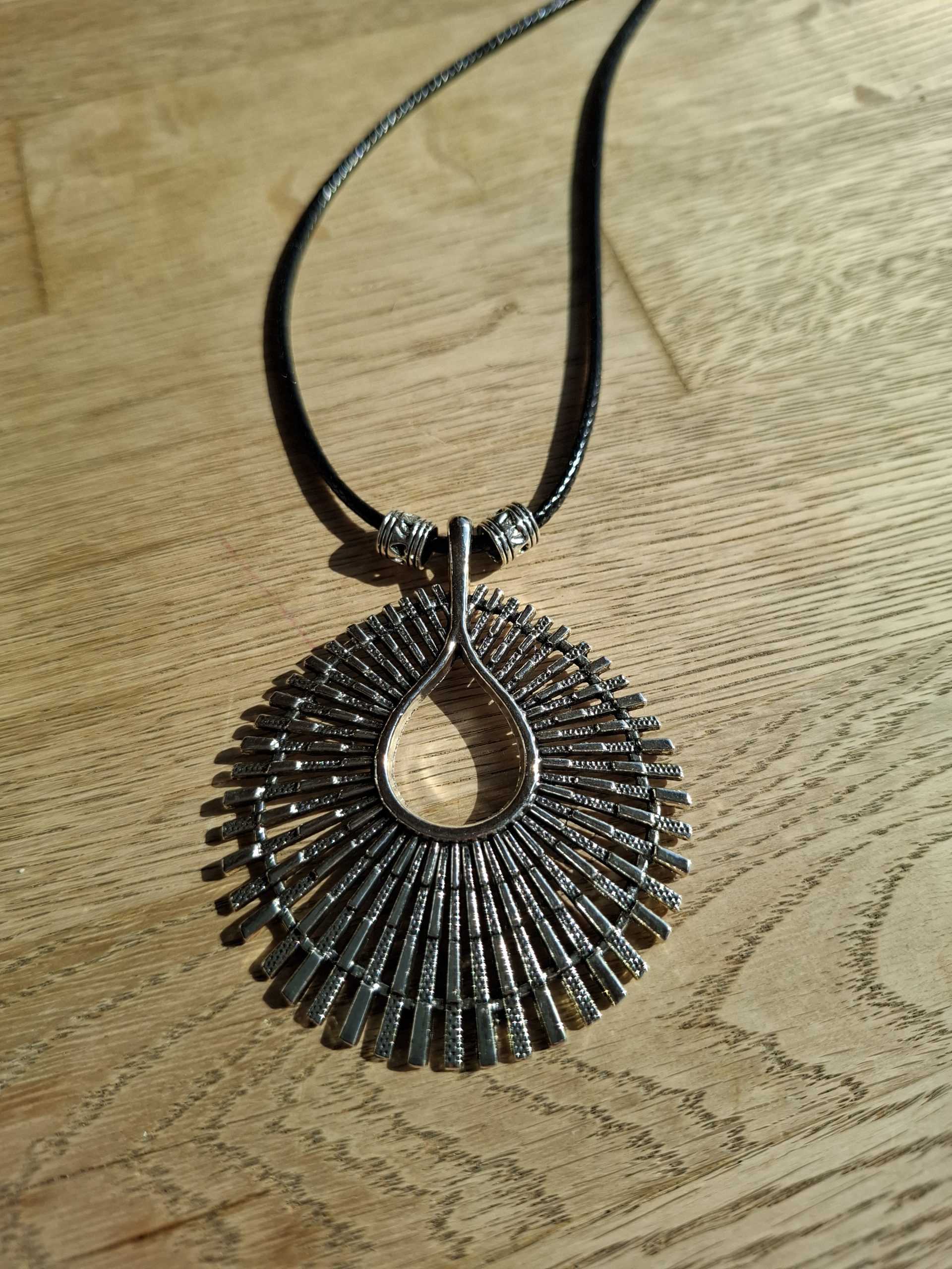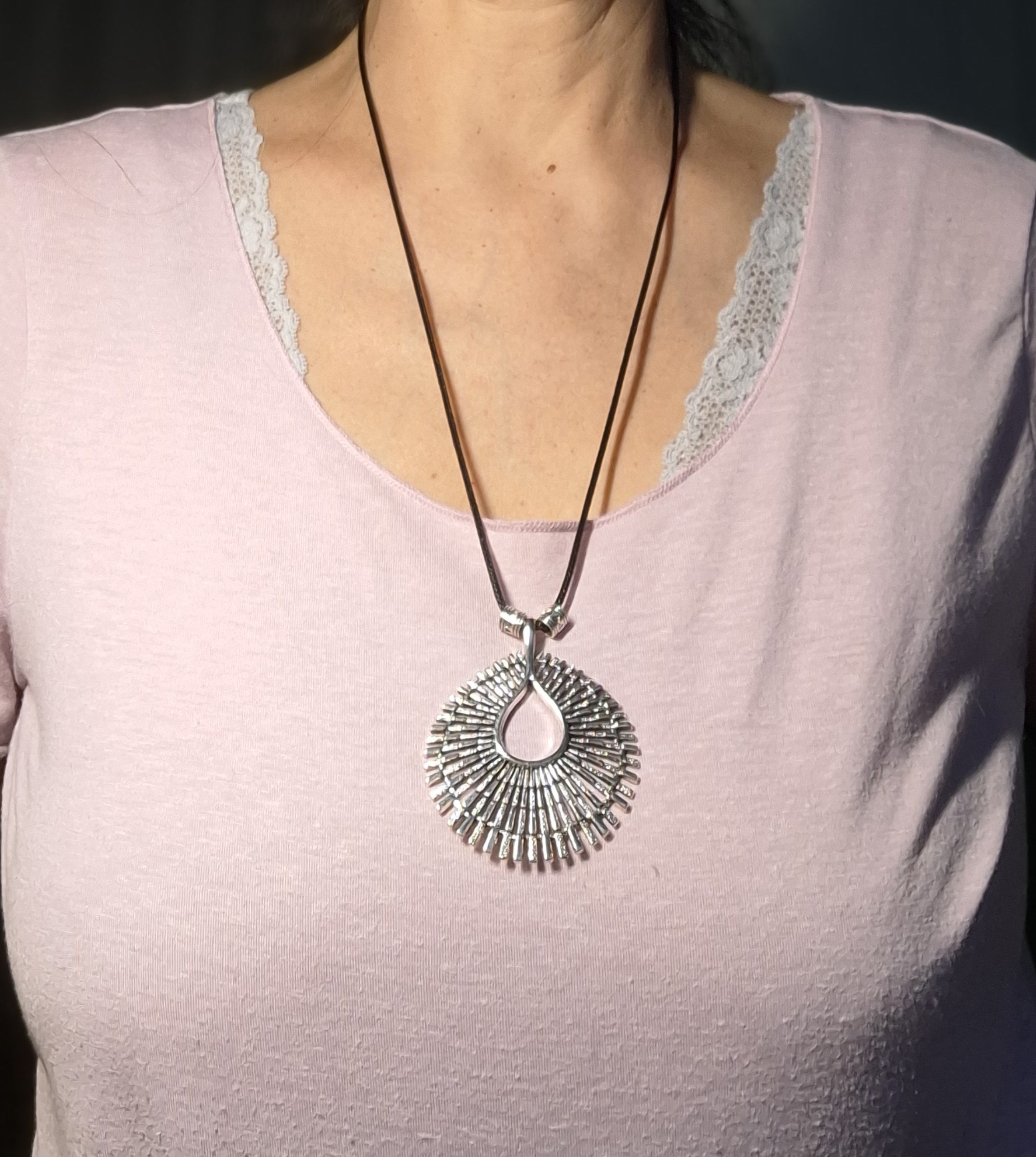 Diese Halskette besteht aus einem Lederband und hat als Highlight einen silbernen Anhänger, der aussieht wie eine Sonne.