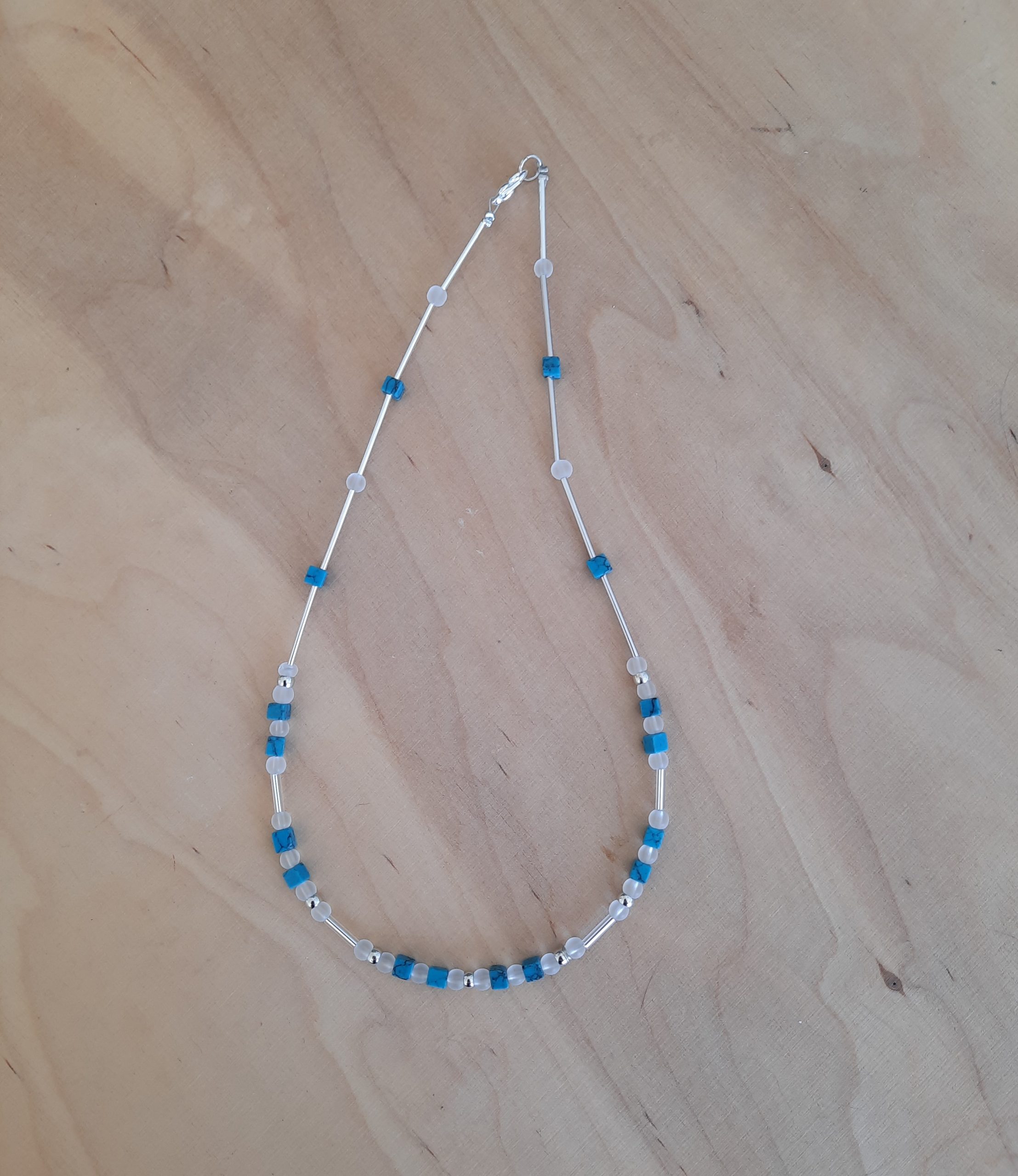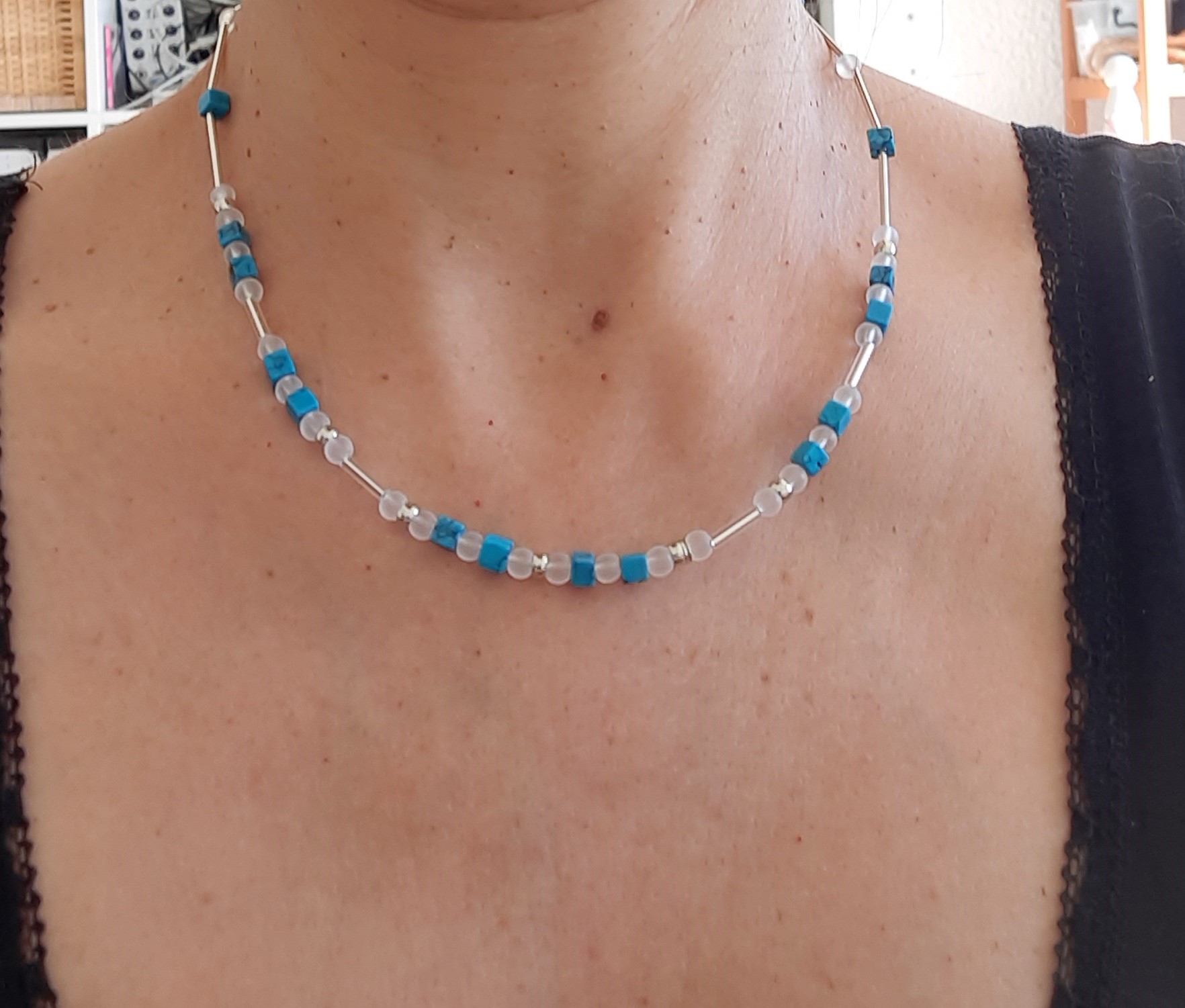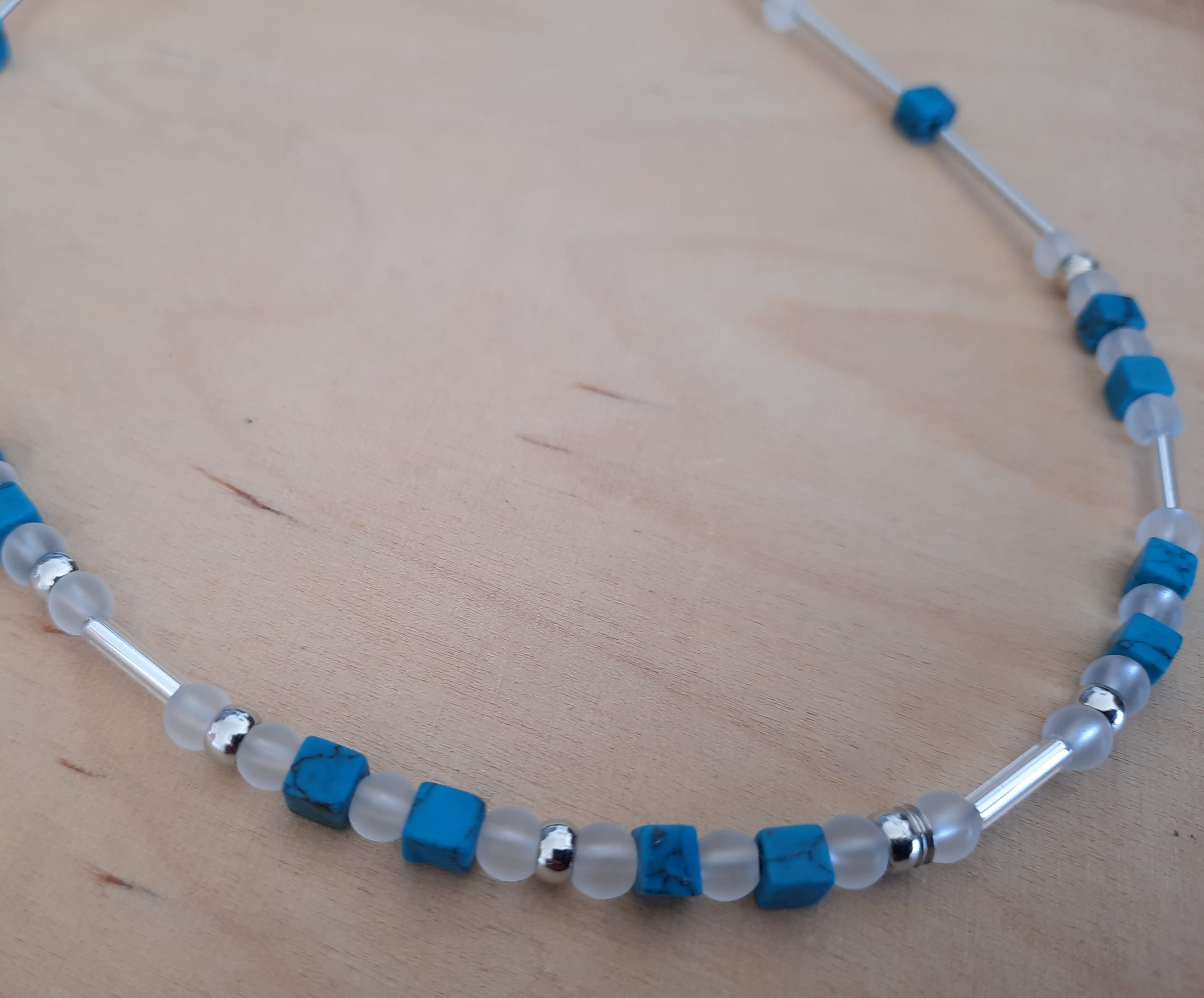 Sie besteht aus den Halbedelsteinen Türkisstein in Würfelform, 4mm groß. Dazwischen funkeln silberne Perlen und transparente Glasperlen.