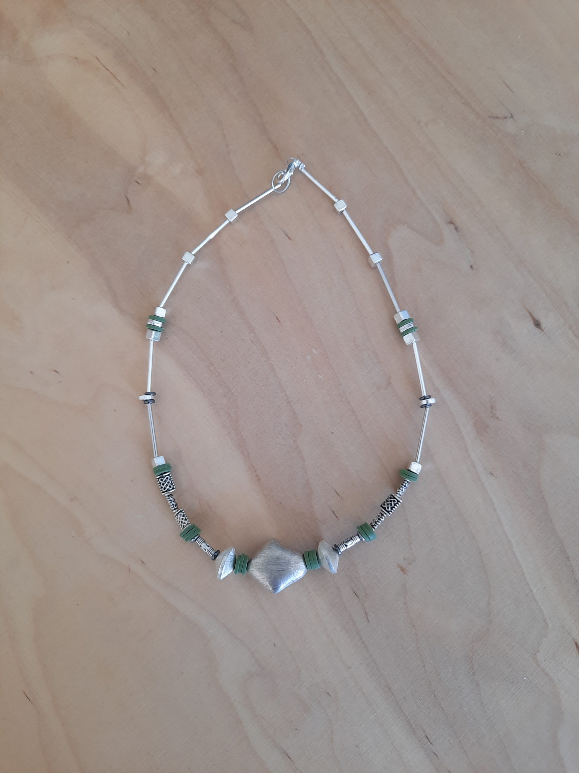 Sie besteht aus vielen silbernen Elementen, und grünen Scheiben dazwischen. Der größere, silberne Stein als Highlight macht diese Kette einzigartig.