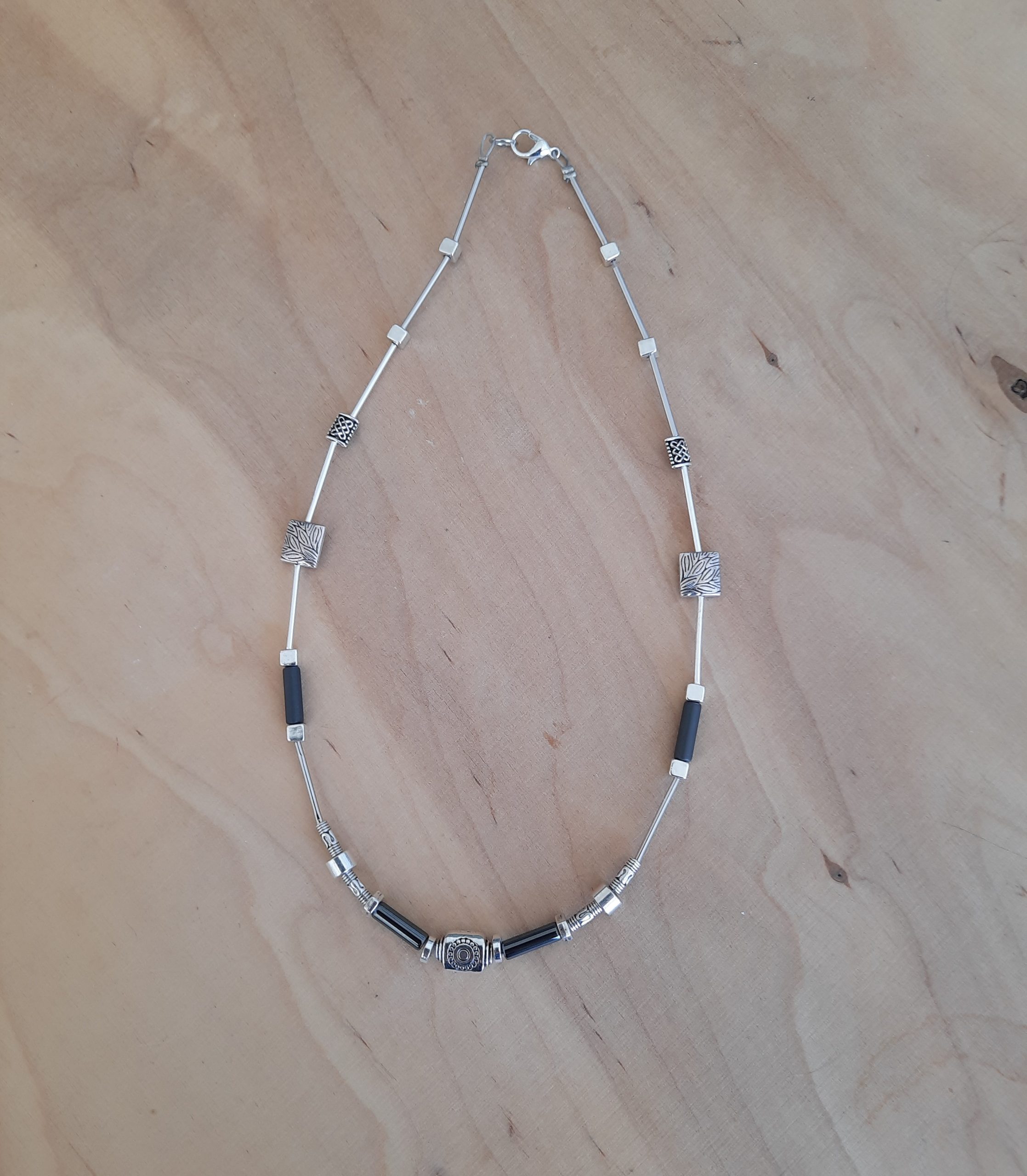 Sie besteht aus vielen silbernen Elementen und grauen Röhrenperlen.