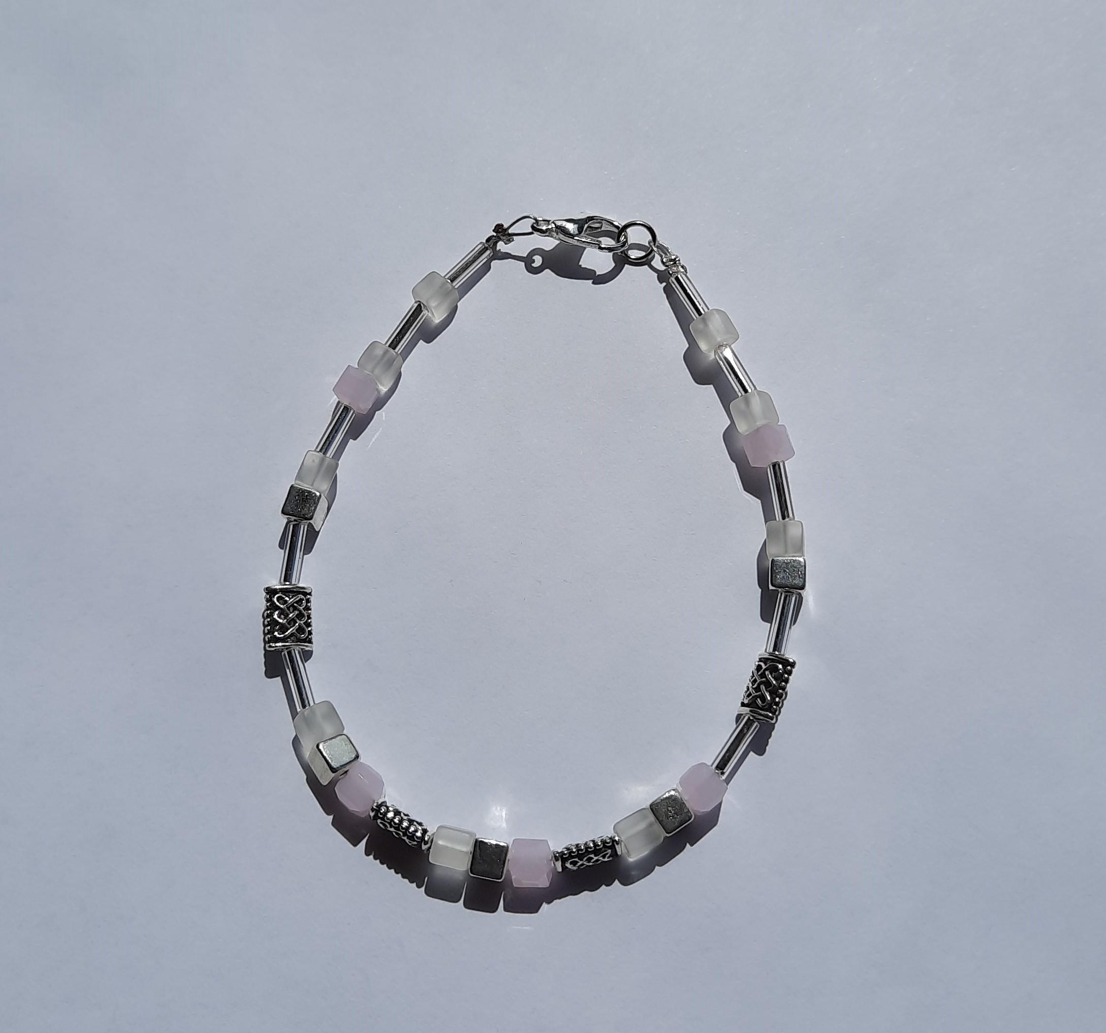 Es besteht aus rosa Jadeperlen und transparenten Glasperlen in Würfelform, 4mm groß. Dazwischen funkeln schöne silberne Zwischenteile.
