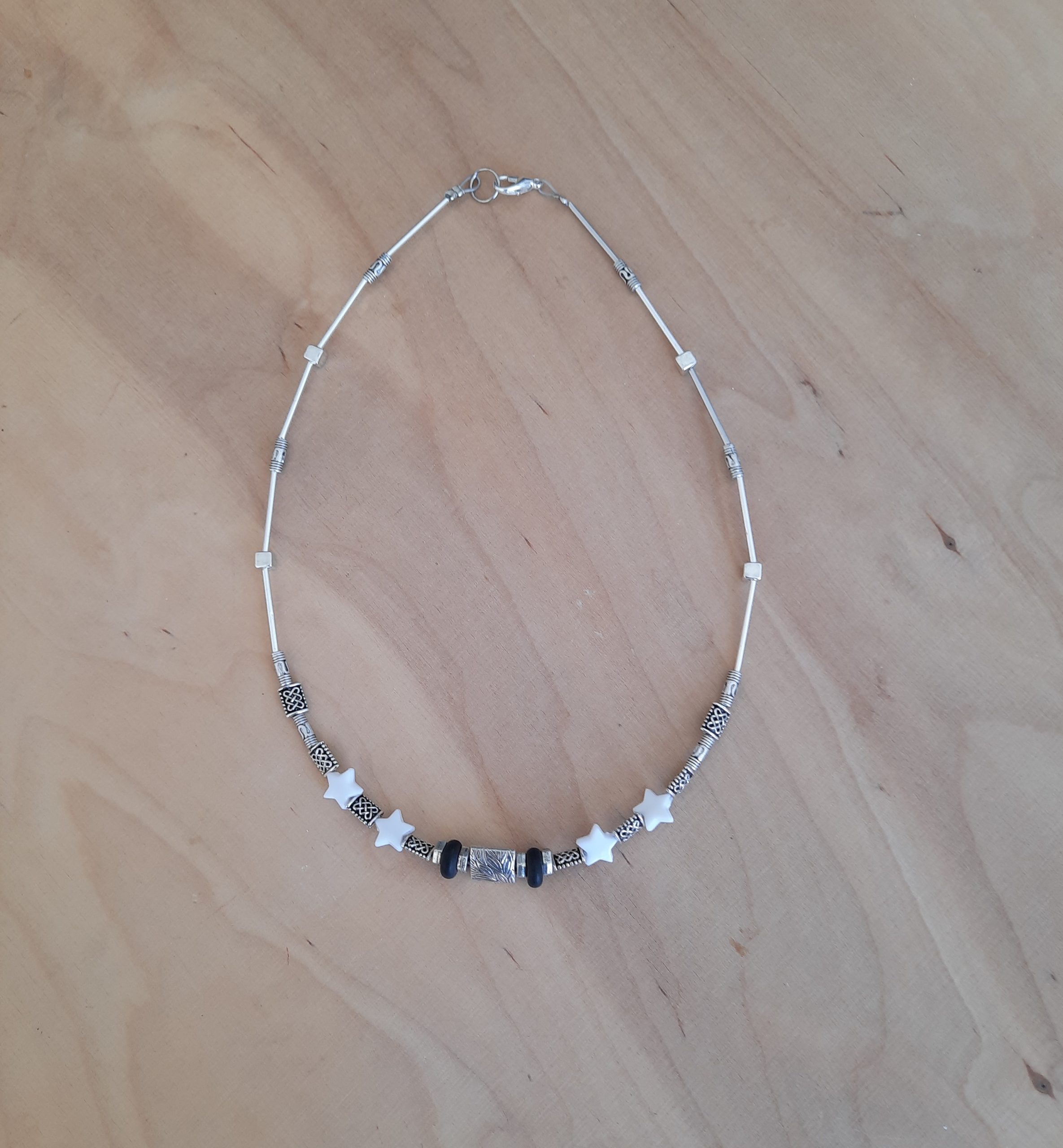 Sie besteht aus vielen silbernen Elementen, weißen Sternen und schwarzen Obsidianscheiben.