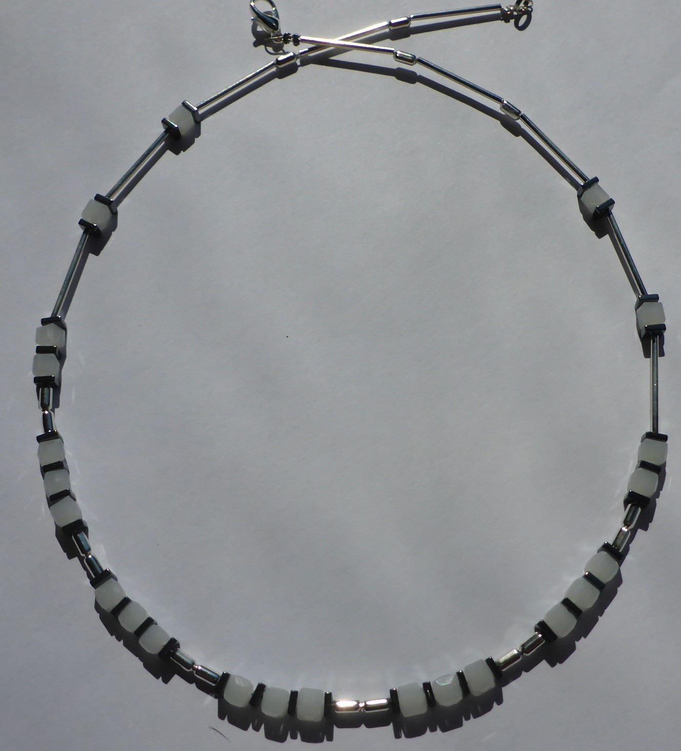 Sie besteht aus weißen Jadeperlen in Würfelform, 4mm groß. Dazwischen funkeln ebenfalls 4mm große Hämatit Scheiben.