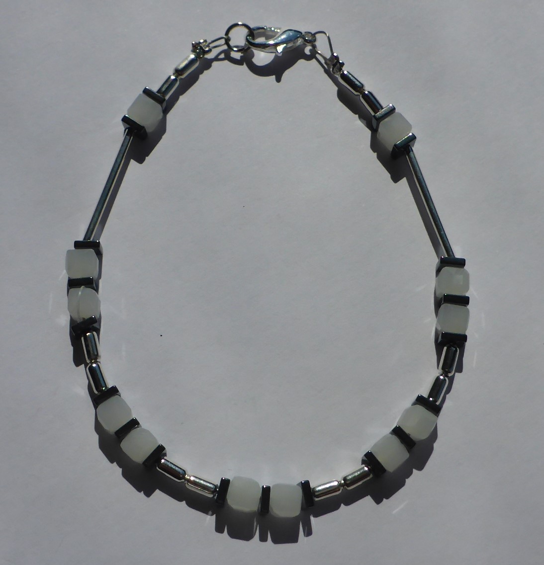 Es besteht aus weißen Jadeperlen in Würfelform, 4mm groß. Dazwischen funkeln ebenfalls 4mm große Hämatit Scheiben.