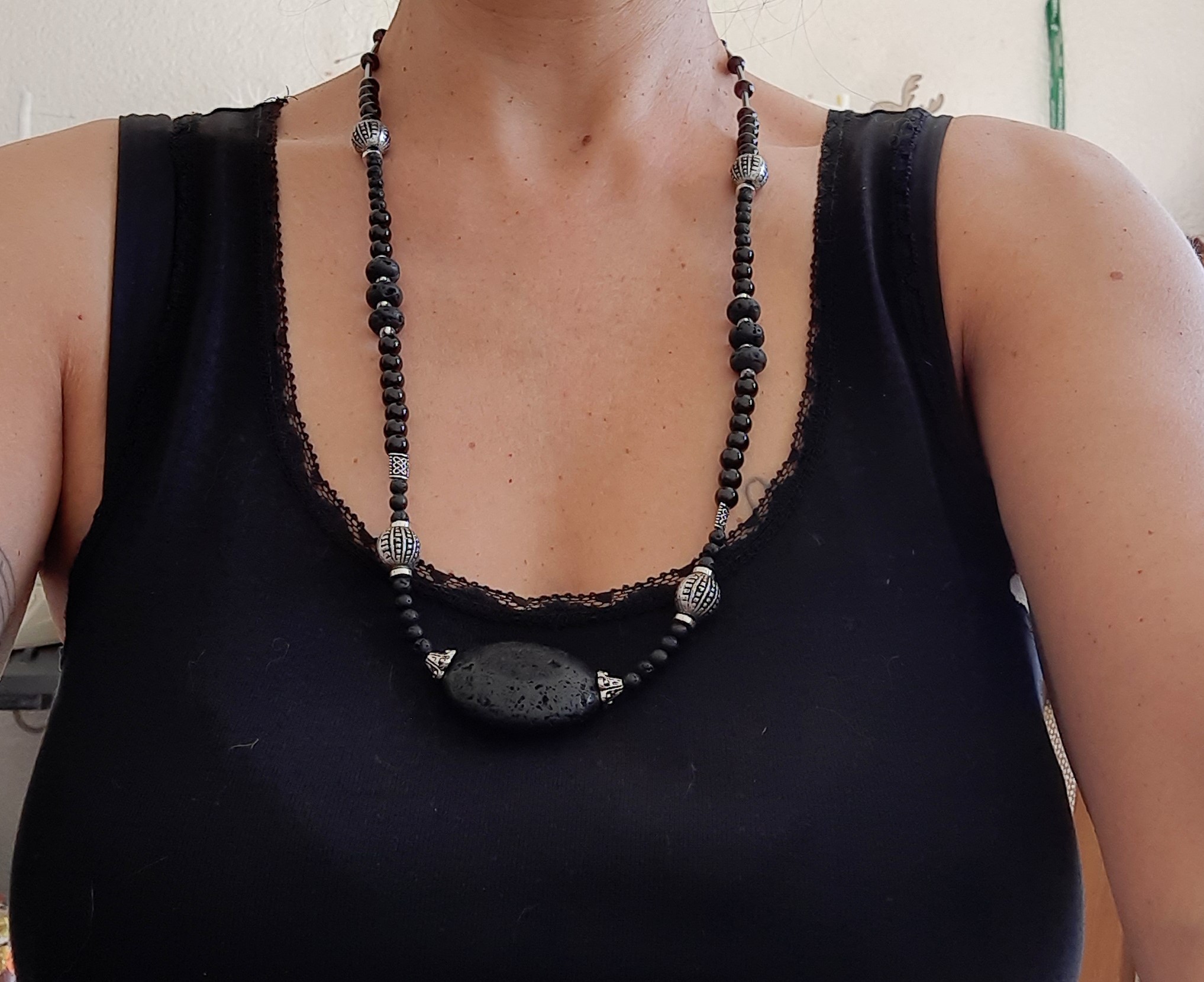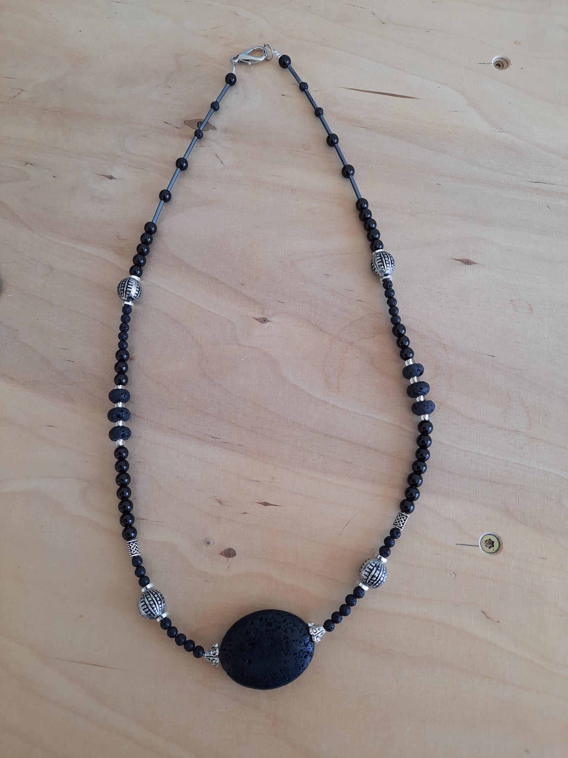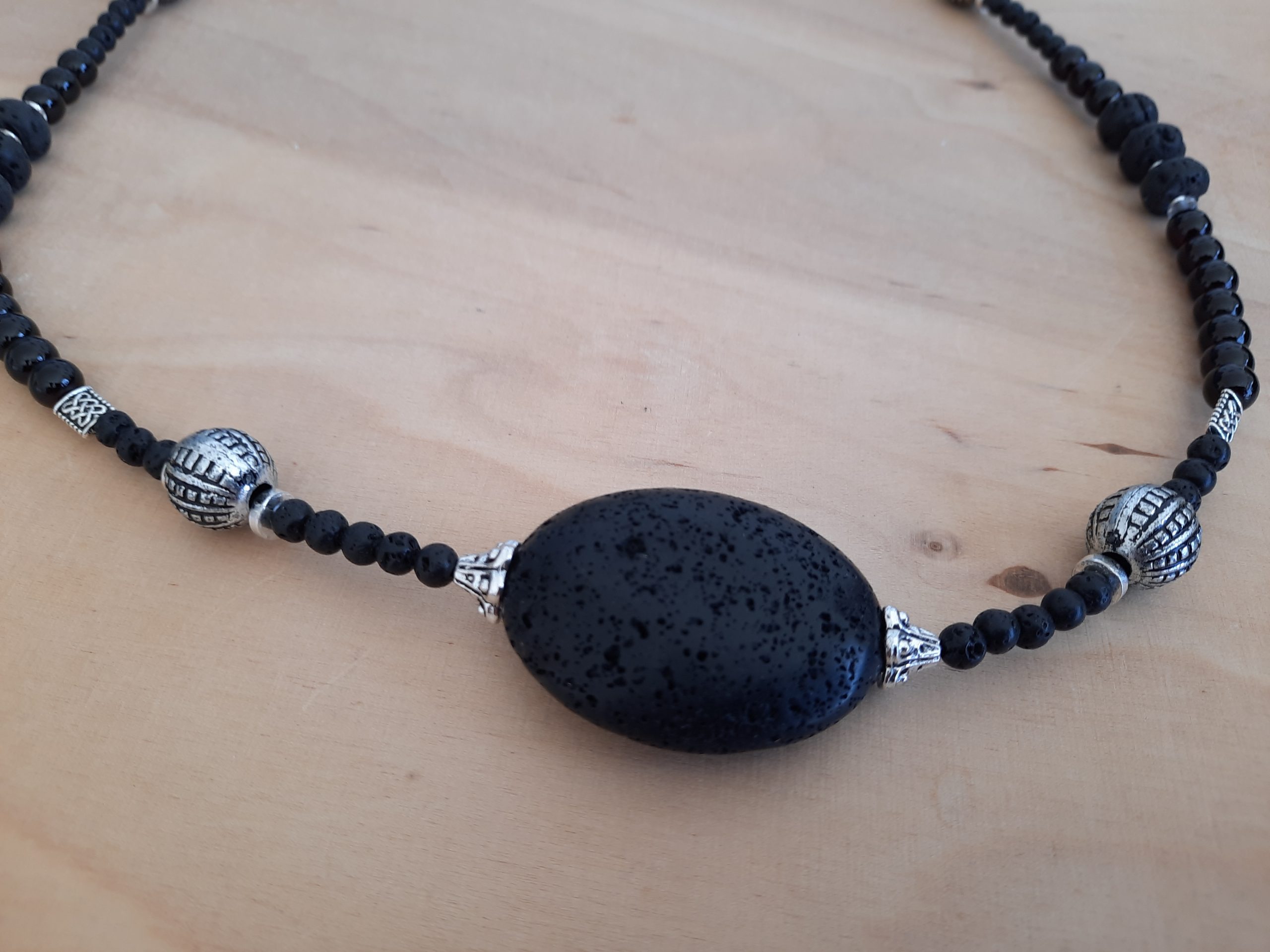 Schöne Halskette aus dunklen und silbernen Perlen, dazwischen Lavaperl-Scheiben und silberne Elemente. Die große Lavaperle in der Mitte macht die Kette einzigartig.