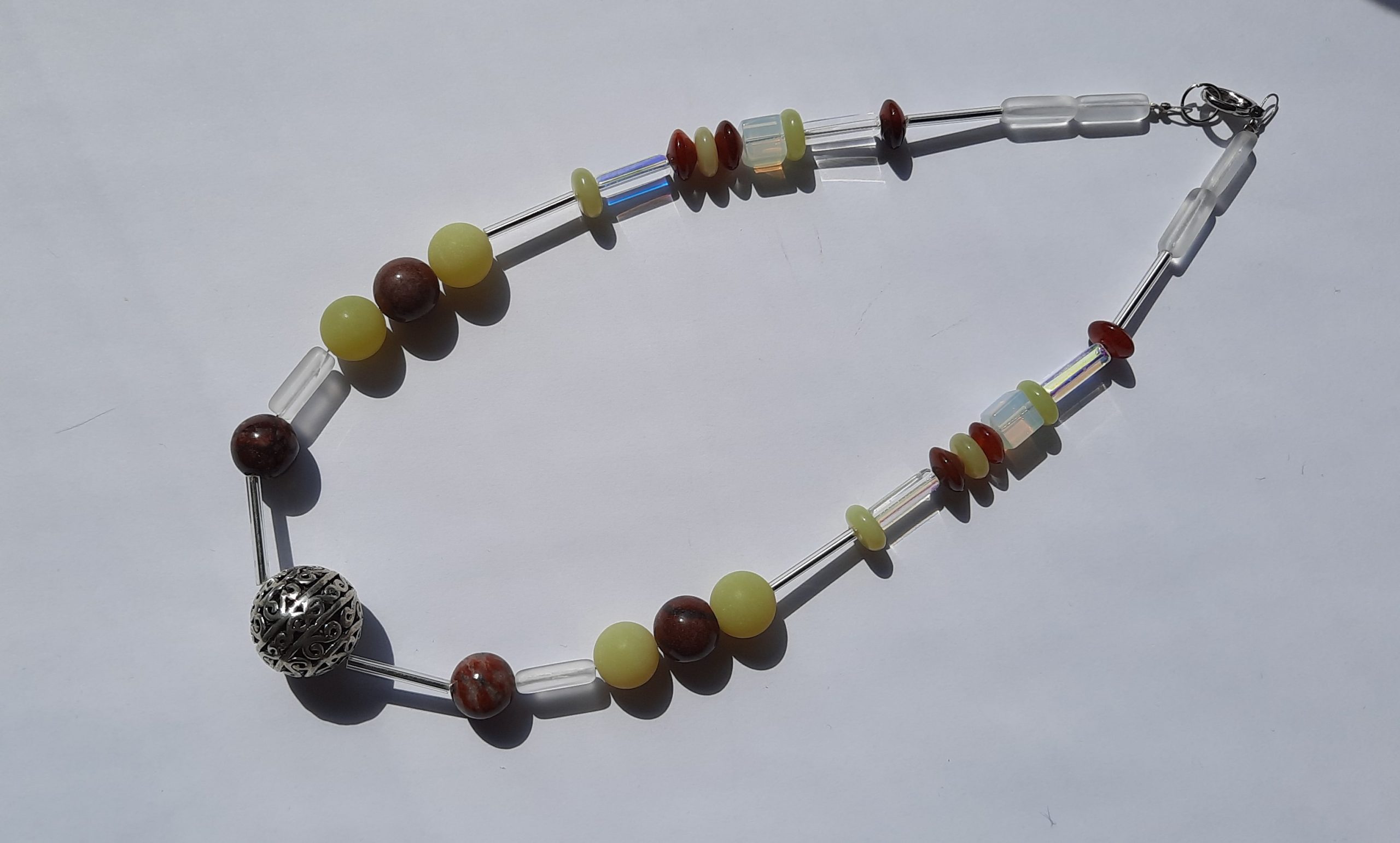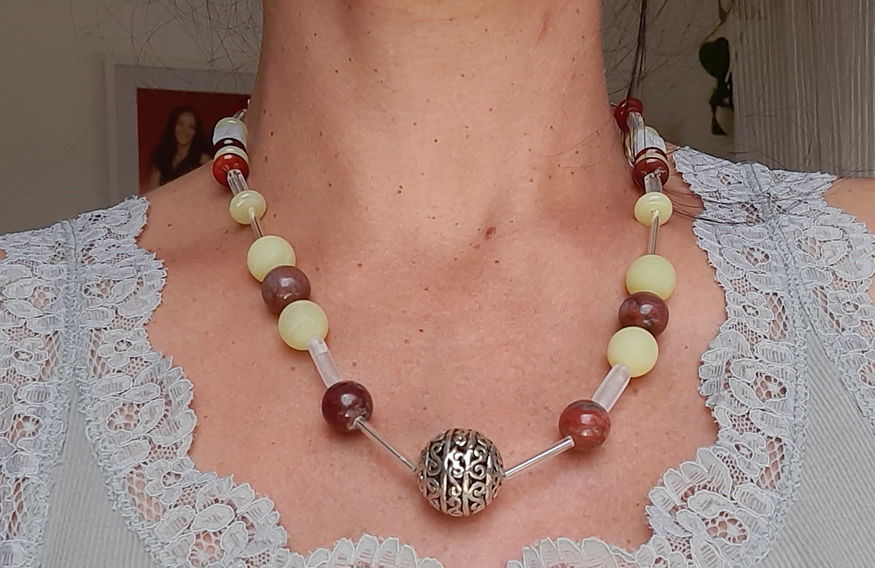 Schöne Halskette aus Citronit und Achatperlen. Und in der Mitte ein schöner Stein als Highlight.