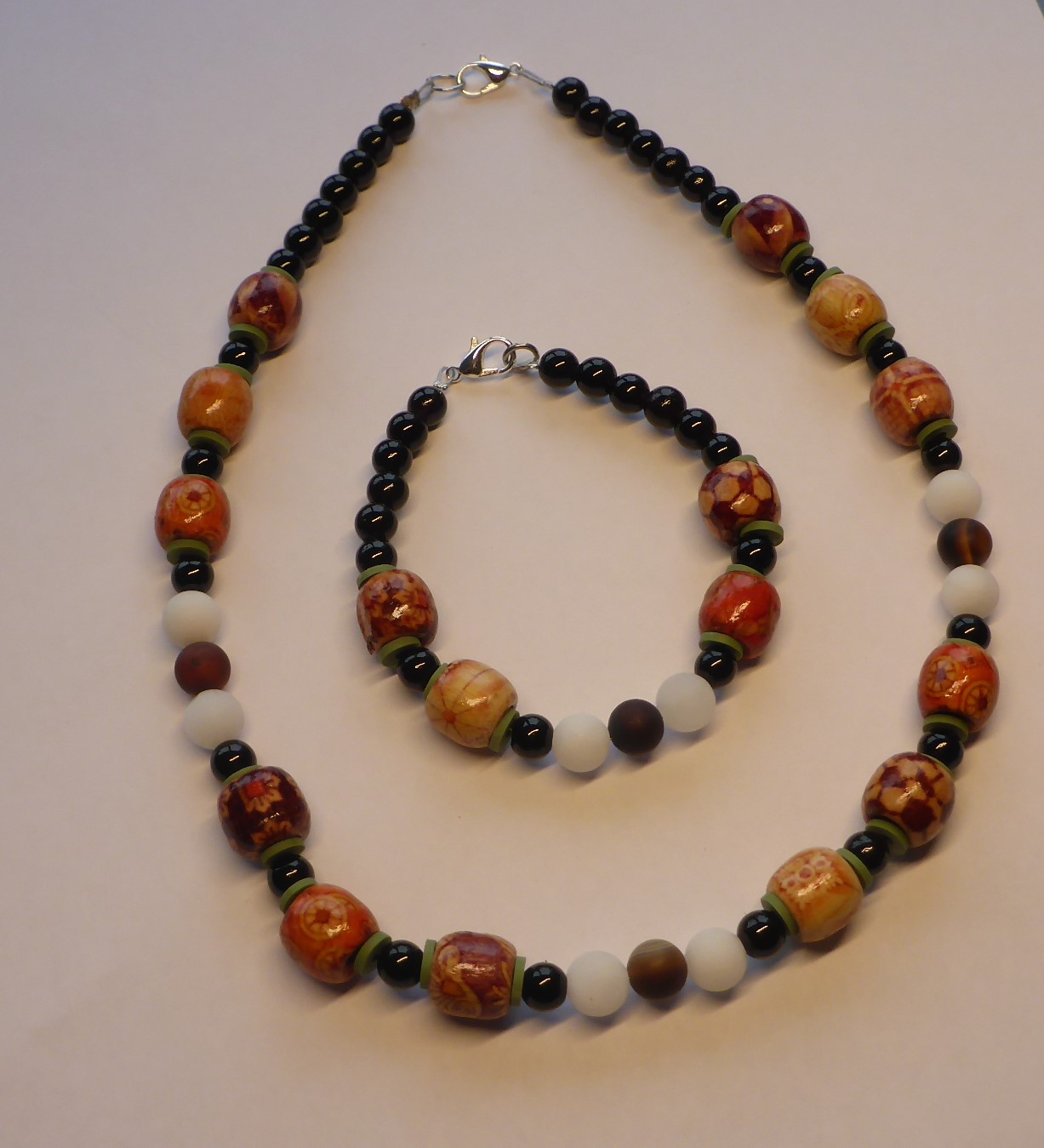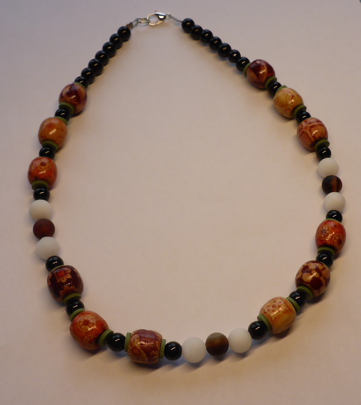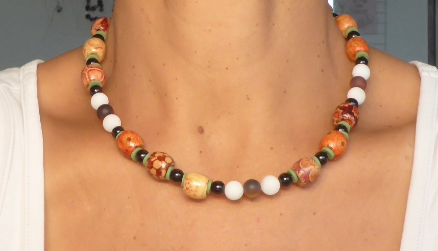 Schöne Halskette aus weißen Jadeperlen, Achatperlen, Holz-und Glasperlen.