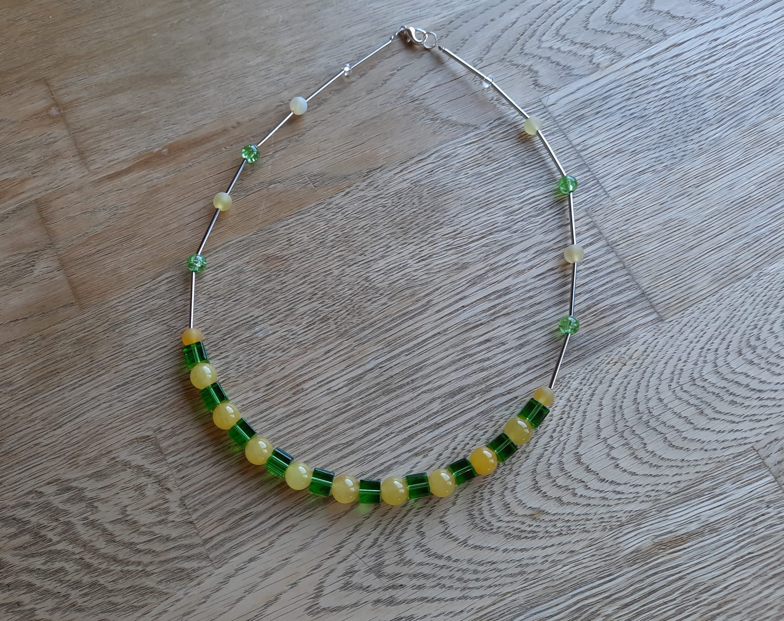 Sie besteht aus gelben Jadeperlen und grünen Glasperlwürfeln und ist sehr angenehm zu tragen.