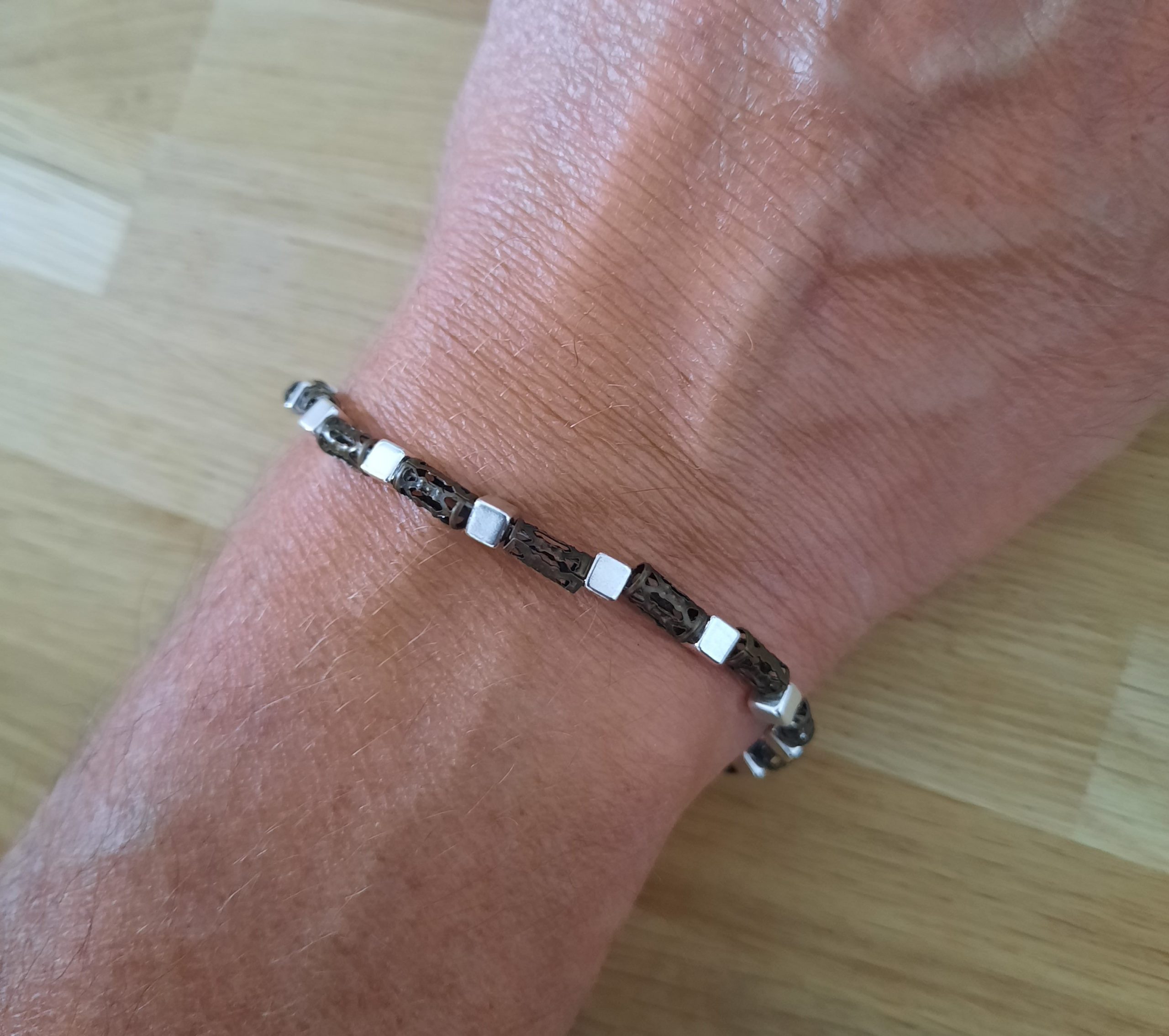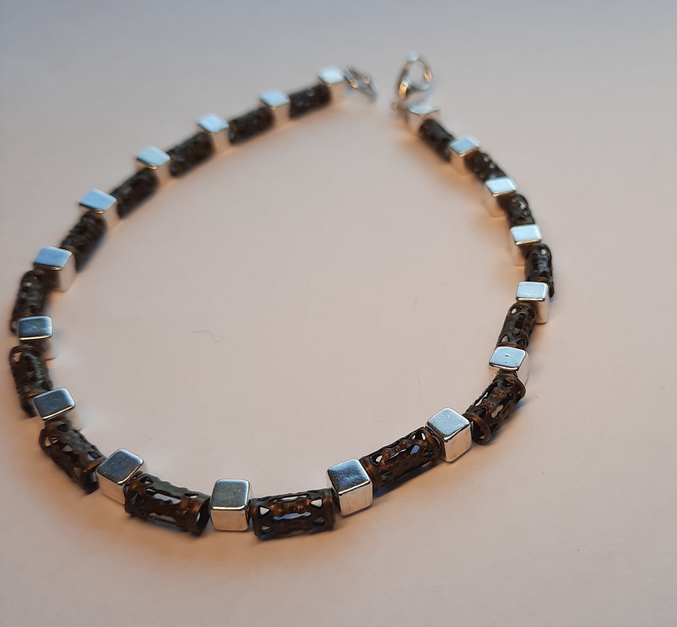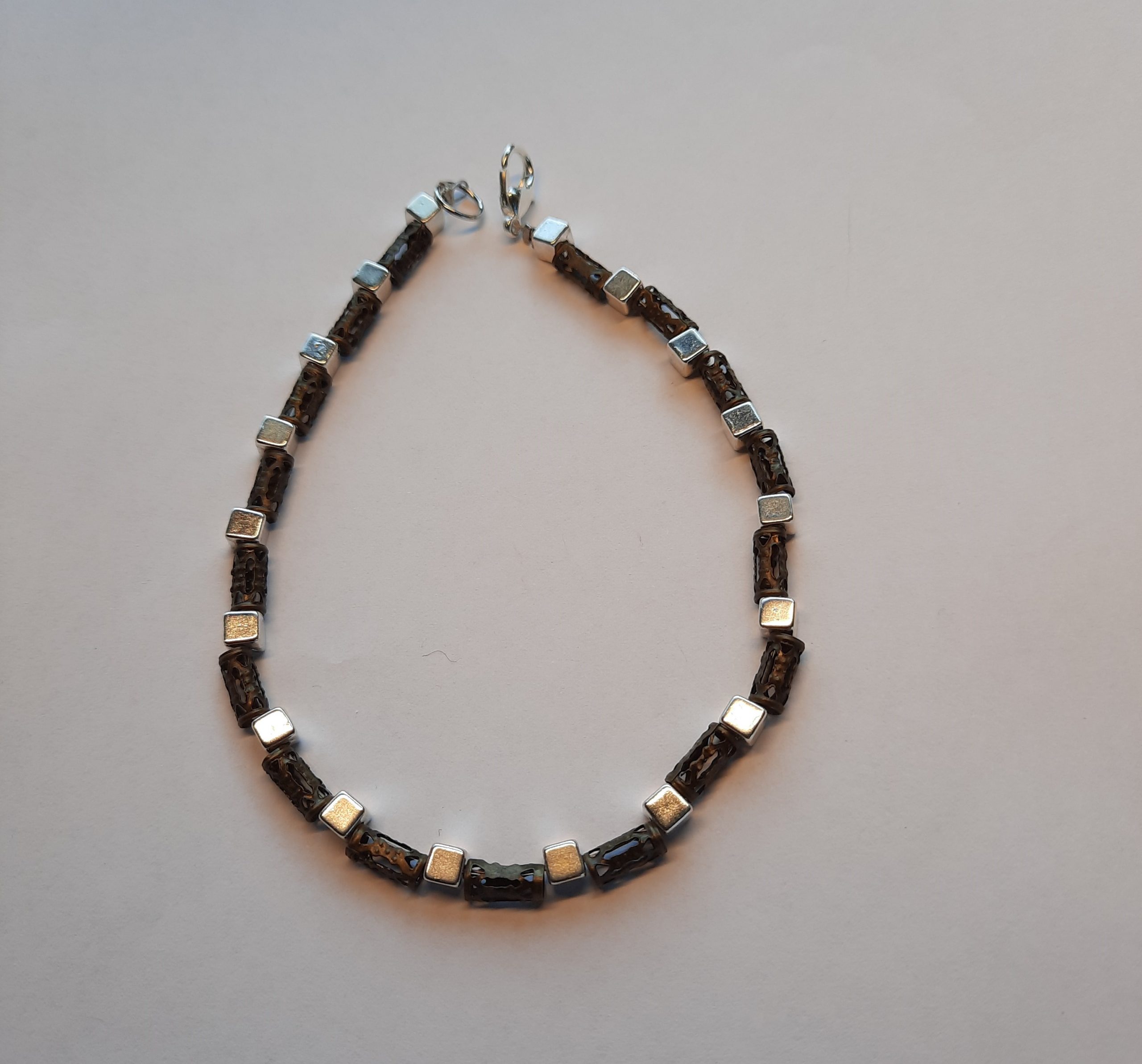 Dieses Armband ist aus kleinen, silbernen Würfel und originellen braunen Metall-Röhrchen.