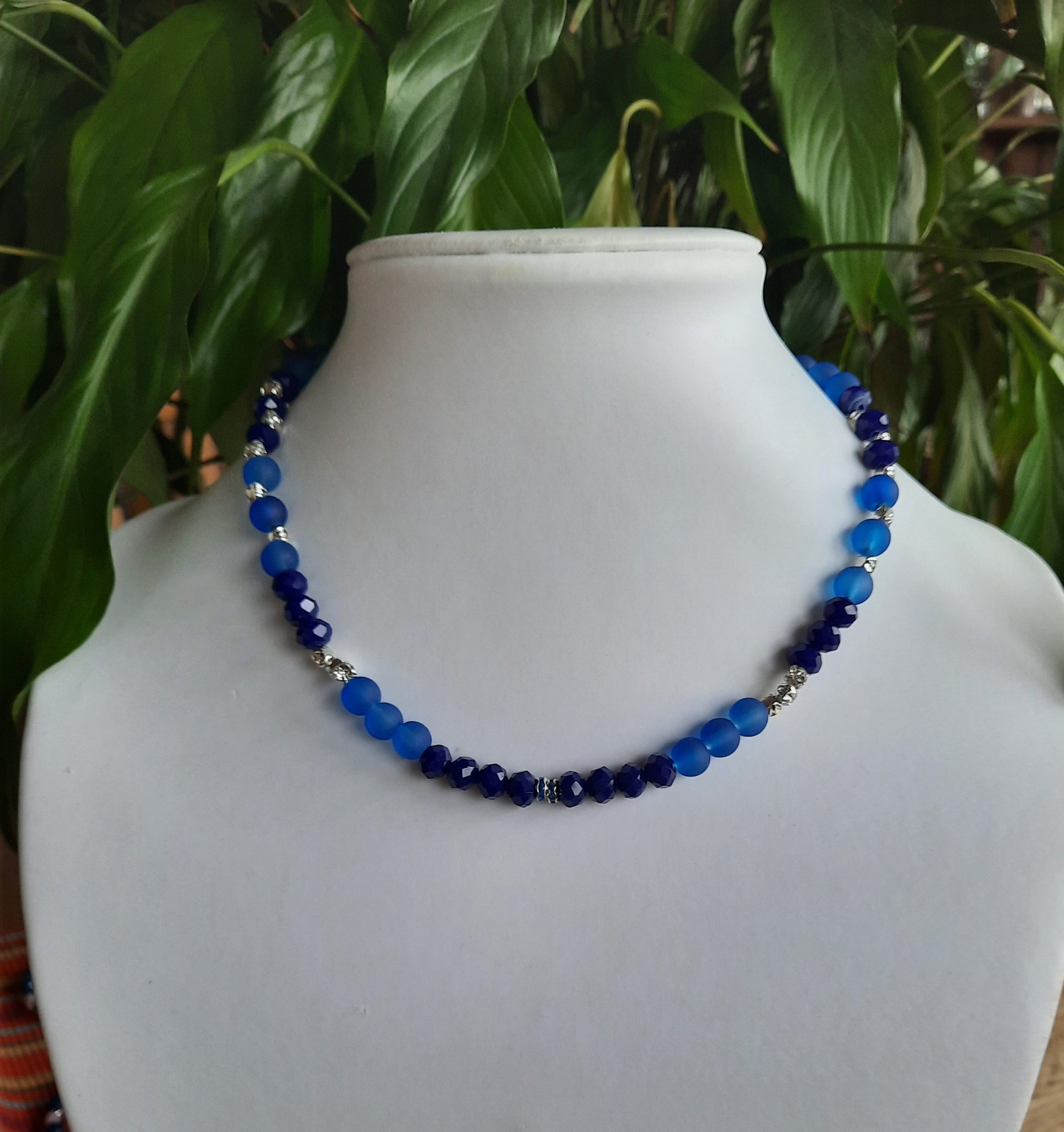 Diese Kette besteht aus dunkelblauen und helleren, blauen Glasperlen. Die 2 kleinen blauen Strassperlen in der Mitte und die vielen silbernen Strassperlen machen die Ketten zum funkelnden Hingucker.