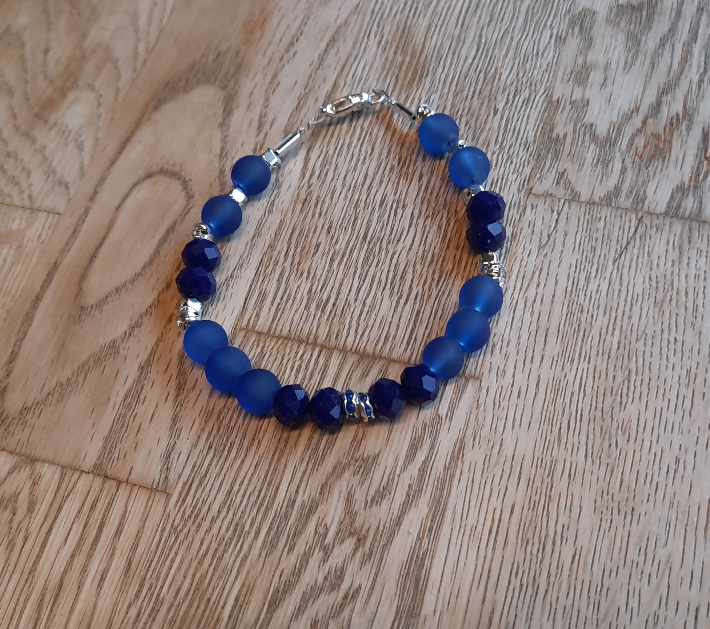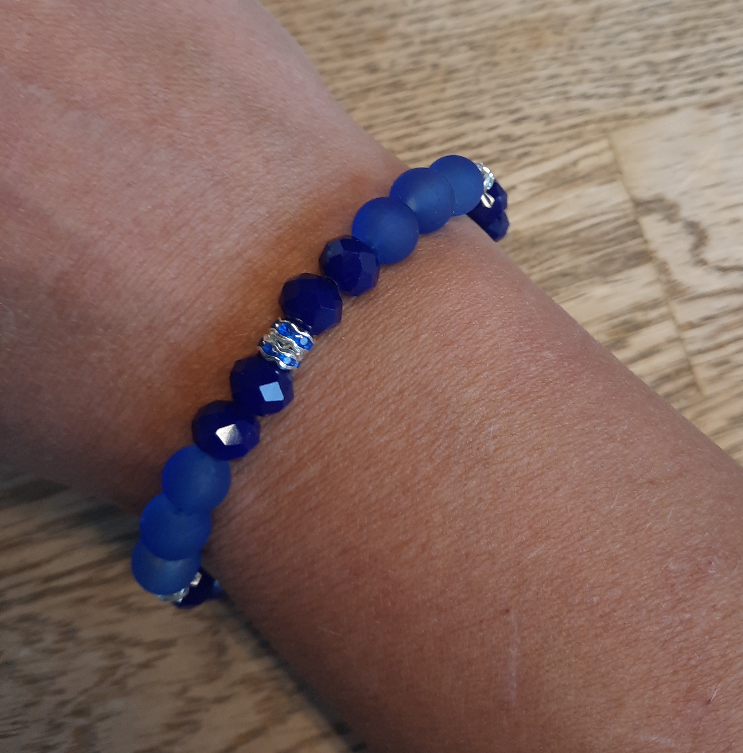 Diese Kette besteht aus dunkelblauen und helleren, blauen Glasperlen. Die 2 kleinen blauen Strassperlen in der Mitte und die vielen silbernen Strassperlen machen die Ketten zum funkelnden Hingucker.