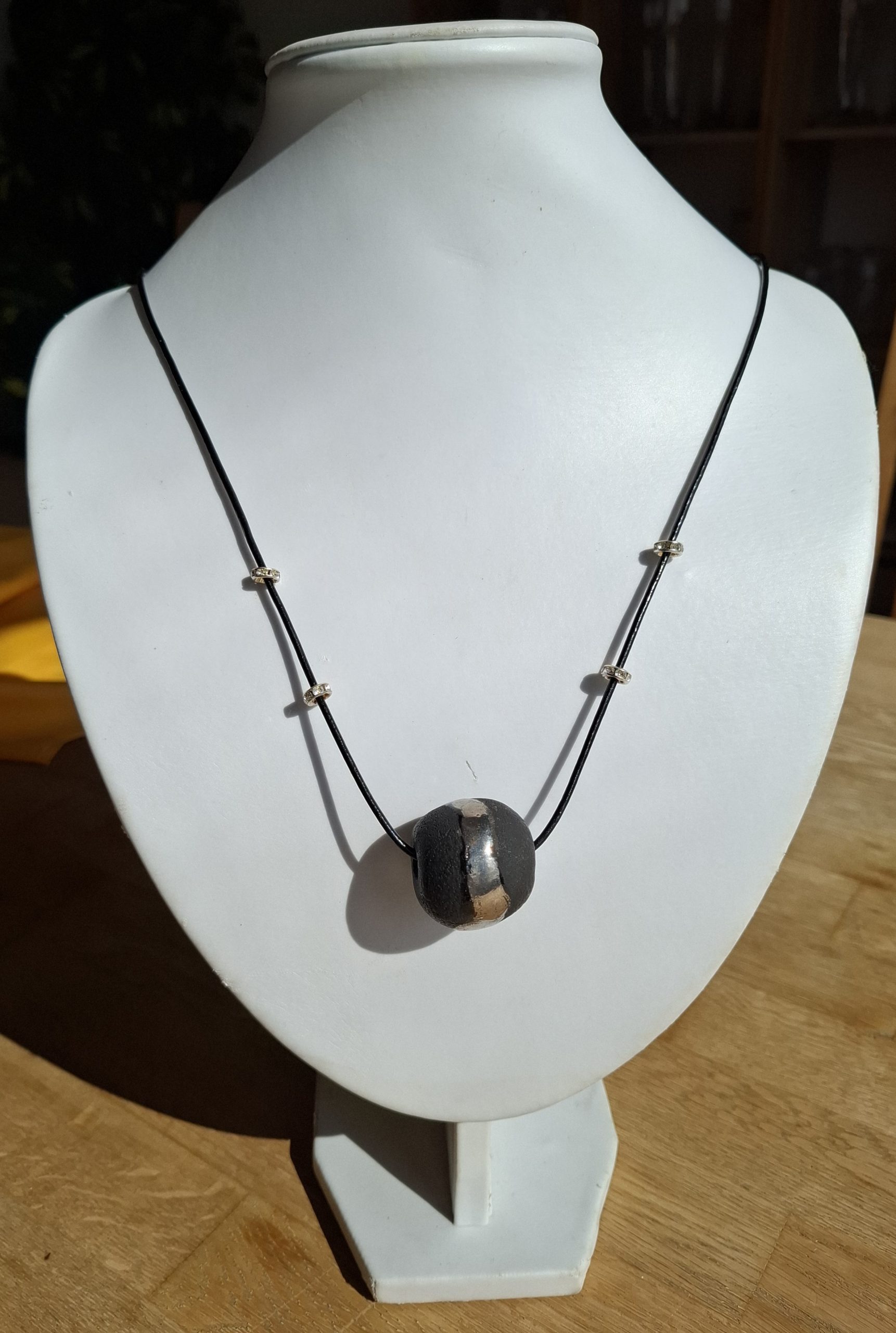 Diese Halskette besteht aus einem Lederband und hat als Highlight eine runde Lavaperle. Vier silberne Glitzerperlen machen sie zum echten Hingucker.