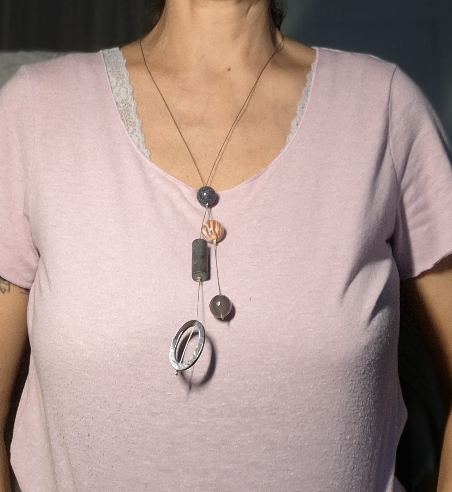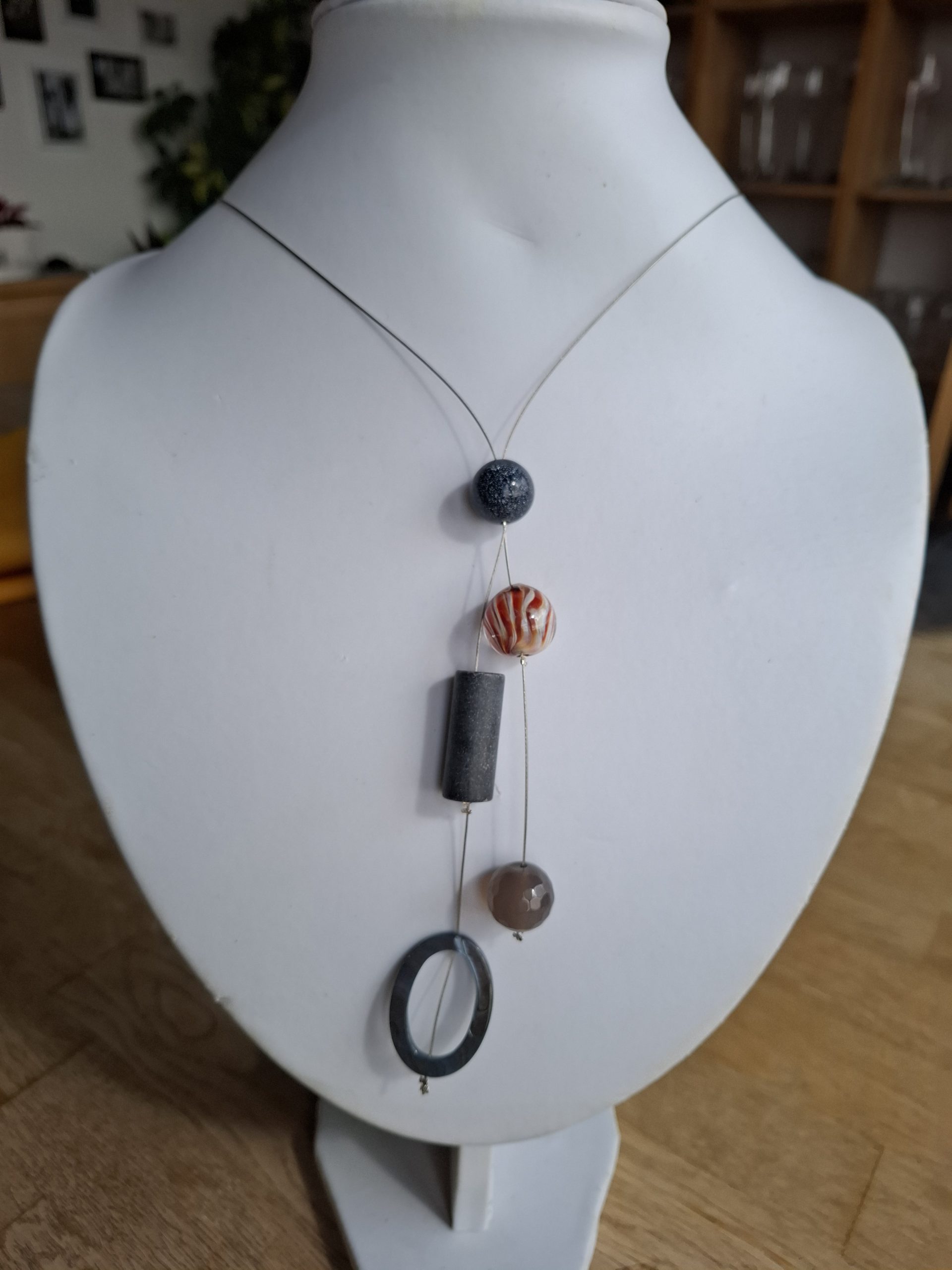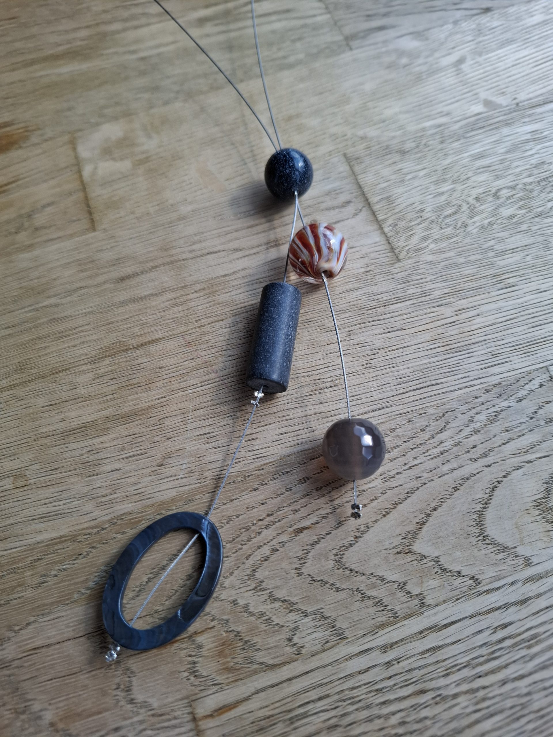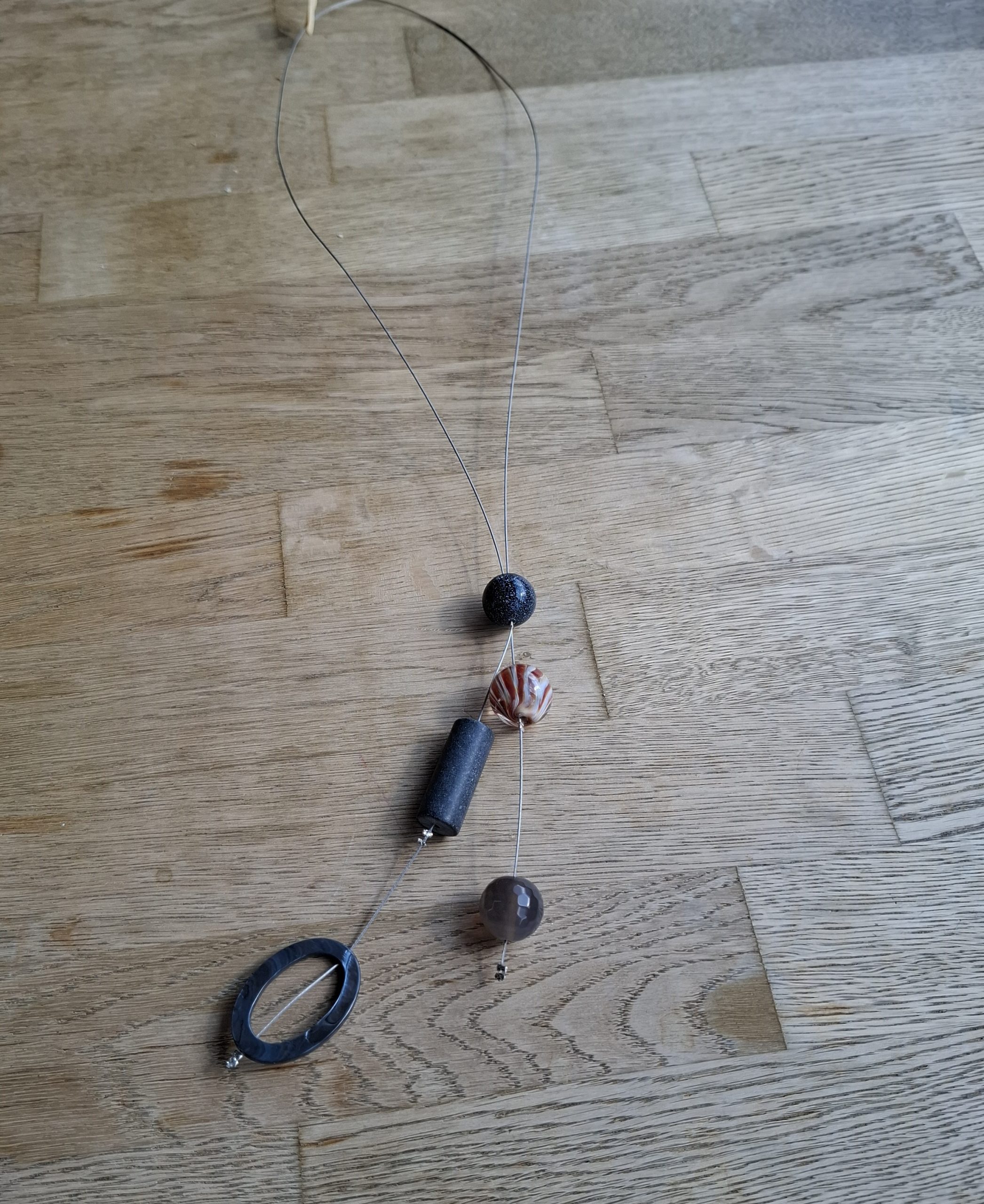 Diese lange Halskette ist aus Draht gemacht und als Highlight sind 5 verschiedene Perlen in unterschiedlichen Formen angehängt.