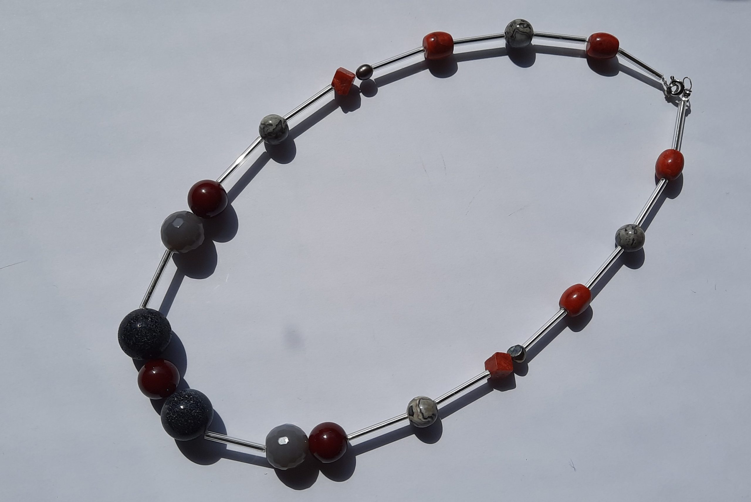 Schöne Halskette aus Labradorid, Achat und Glasperlen.