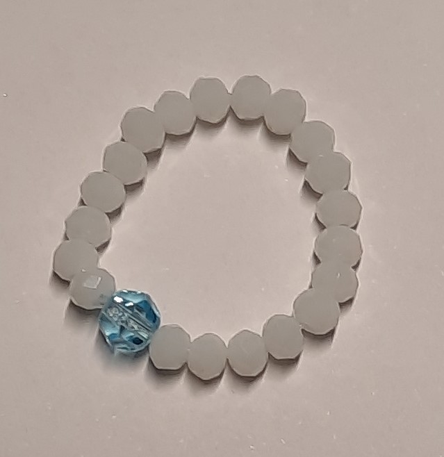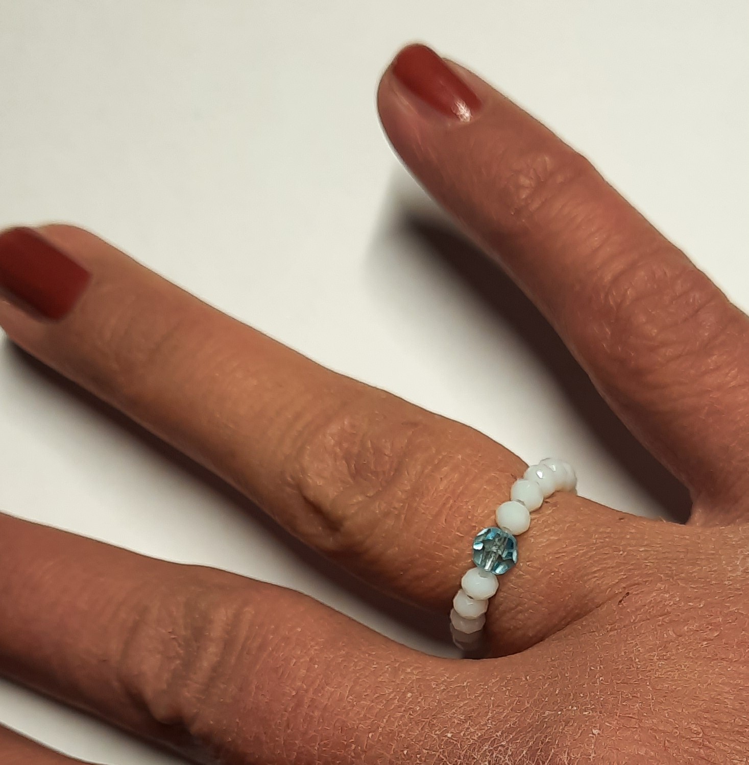 Schöner Ring aus weißen Kristallperlen und einem blauen Swarovski-Edelstein.