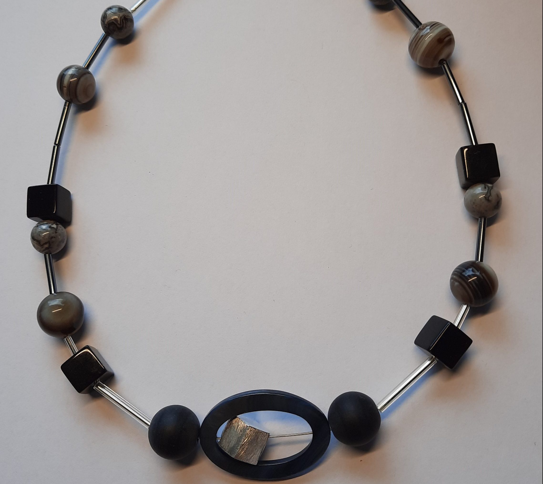 Schöne Halskette aus schwarzen Onyxperlen und grauen und schwarzen Achatperlen