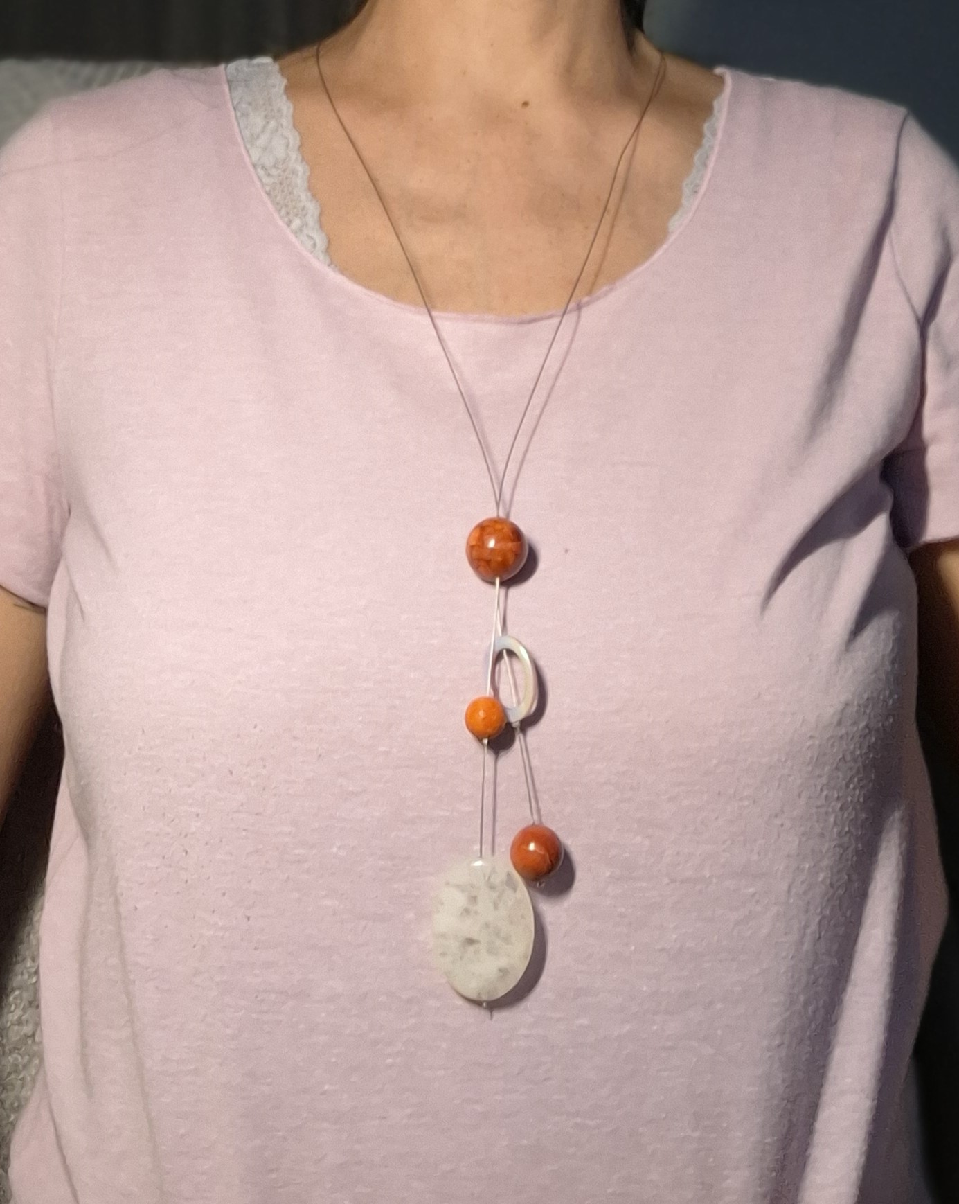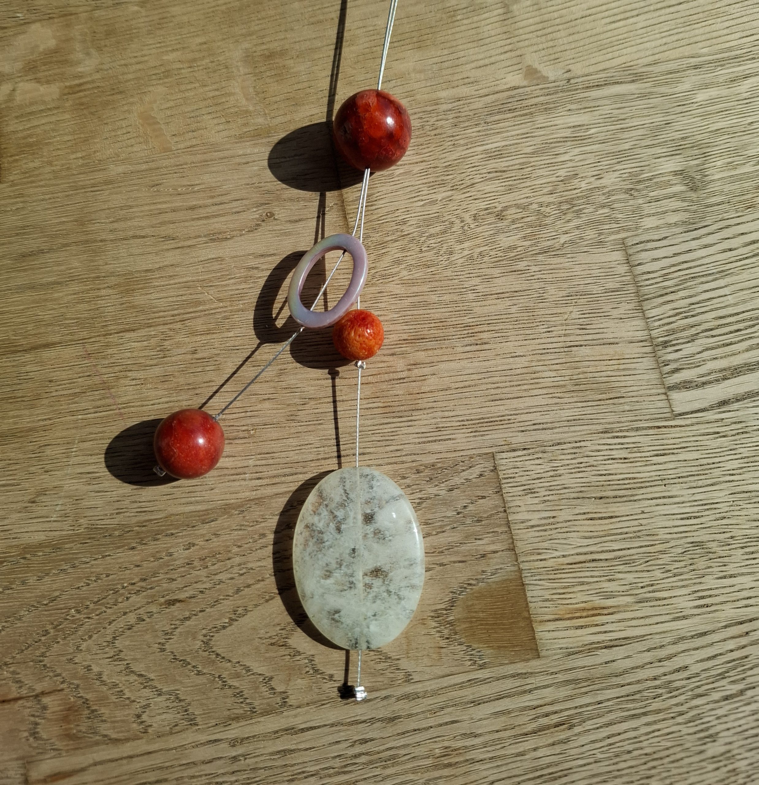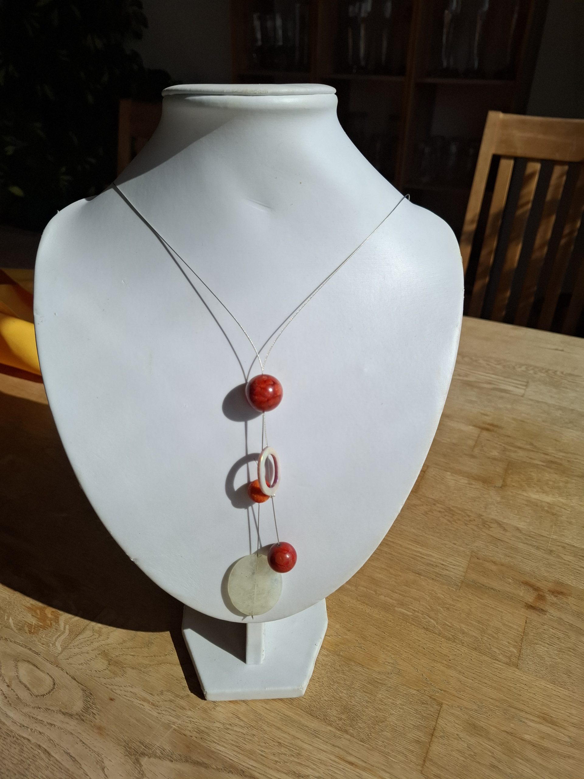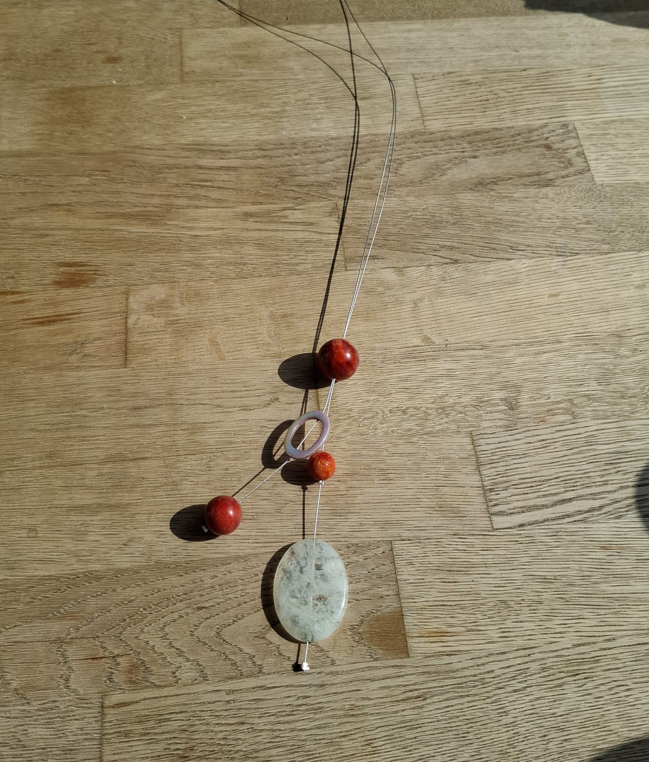 Diese lange Halskette ist aus Draht gemacht und als Highlight sind 5 verschiedene Perlen in unterschiedlichen Formen angehängt.