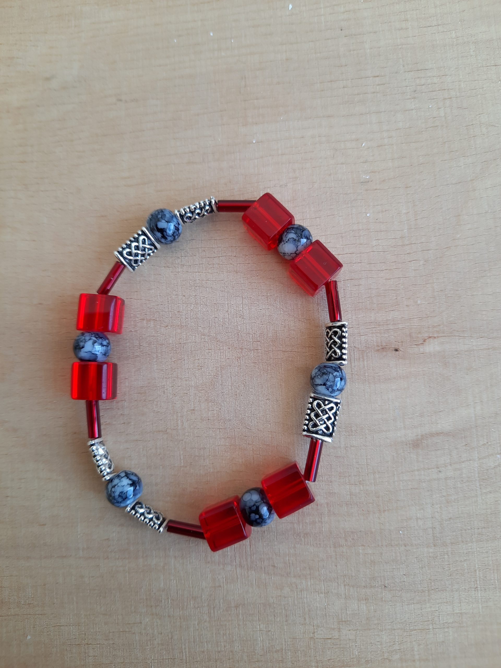 Dieses Armand besteht aus vielen, roten Glasperlenwürfeln, dazwischen graue Achatperlen und silberne Zwischenteile. Sie funkelt richtig schön und ist garantiert ein Hingucker!